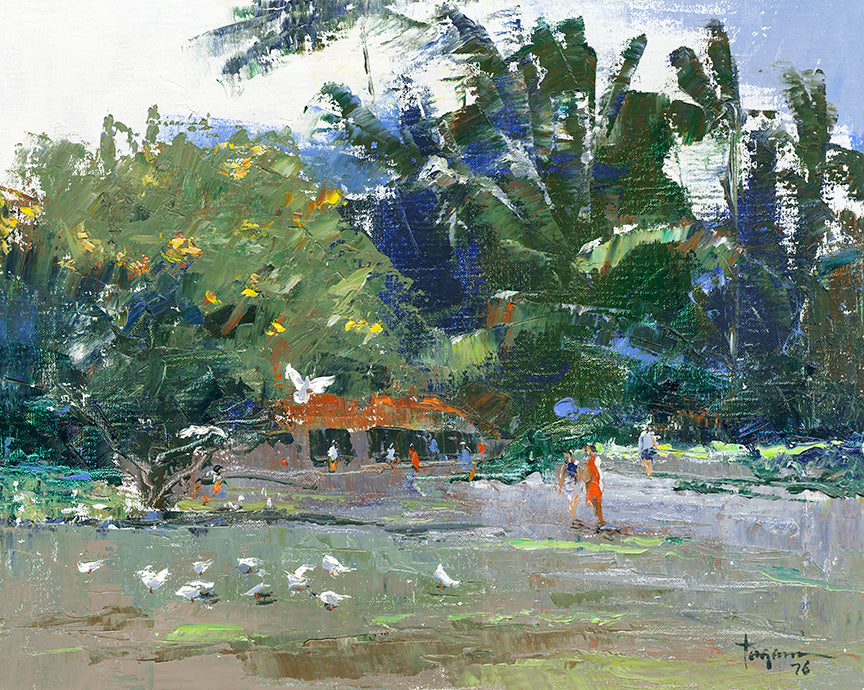 Hiroshi labored in Hawaii’s pineapple fields from age 12 to help his widowed mother raise a dozen children. After serving in the Korean War, Hiroshi returned to Hawaii to study painting at the Honolulu Academy of Arts. He first started selling his work at the Honolulu Zoo fence. In 1966, established artistic luminary Madge Tennent, wrote of Hiroshi: "I would humbly like to predict that he will be one of the greatest artists these Islands have yet produced."
