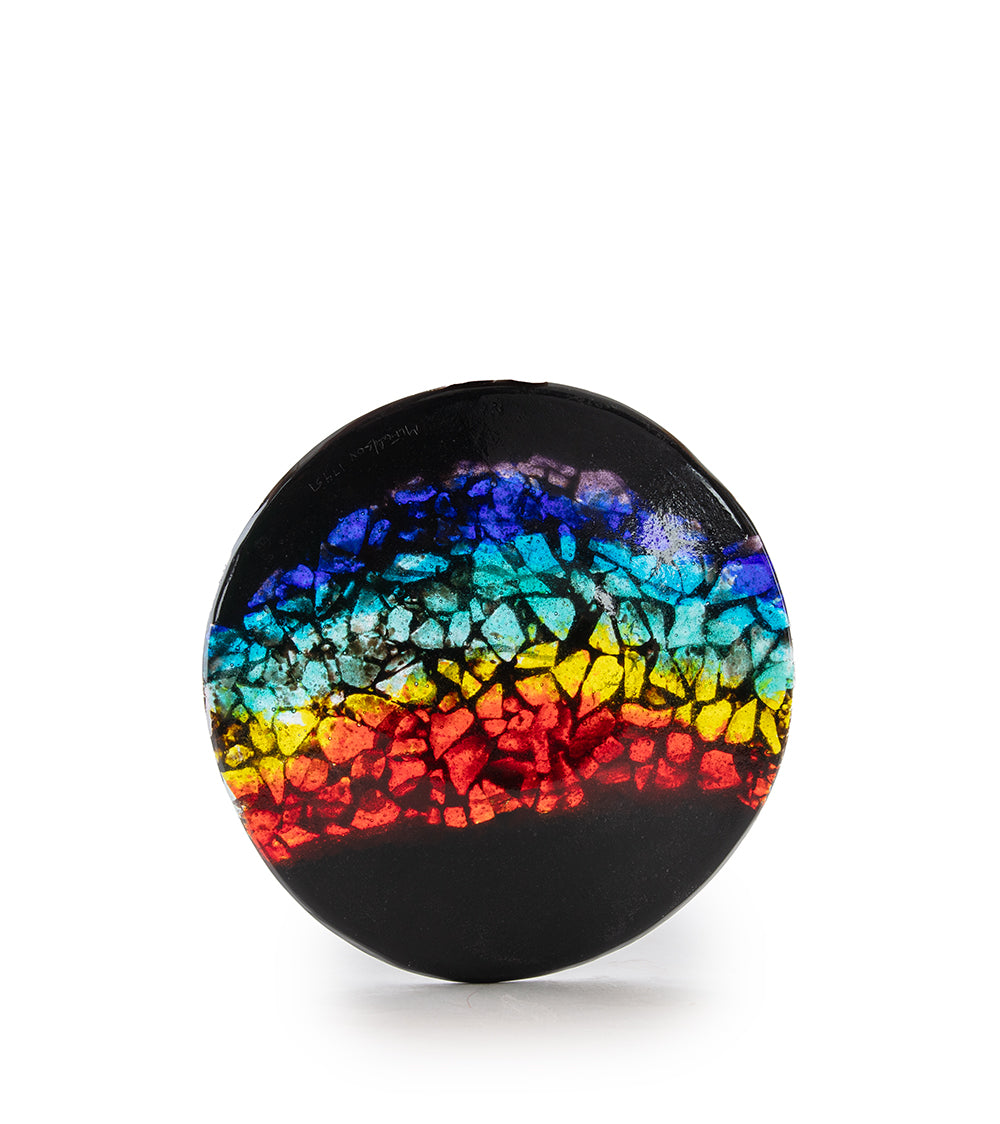 En 1989, Marian tuvo la visión de fusionar el vidrio con la textura rojiza de la lava. Esta visión la impulsó a mudarse a Hawái y establecerse en la selva tropical de Puna. Hoy, la casa de Marian se encuentra a pocos kilómetros del volcán activo Kilauea. Por favor, usen sus platos de vidrio; se pueden lavar a mano. Tengan en cuenta que no son aptos para microondas.