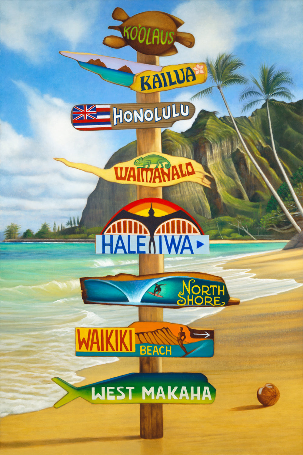 En Hawái, todos los caminos llevan a un lugar maravilloso. Esa creencia inspiró a Edyta Franczak a crear esta encantadora pintura de un letrero. Edyta no es una rotulista cualquiera. Creció en Polonia y llegó a Hawái hace diez años tras graduarse en Derecho en su país natal. Es una de las mejores saltadoras de altura de Polonia y también violinista clásica. Las pinturas de letreros de Edyta son una expresión caprichosa del placer de vivir en Hawái. Para esta pintura, construye un letrero real y luego lo pinta. Descubre todas las demás pinturas de letreros de Edyta.