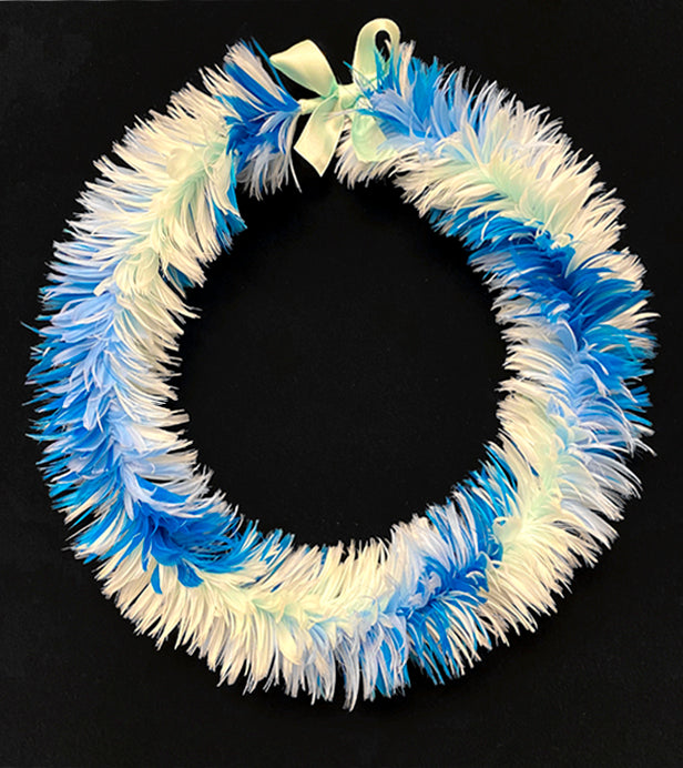 El experto artista hawaiano de leis de plumas, Boris Kekaiuluikahikina Huang, crea estos impresionantes leis de plumas. Ata cada pluma a mano, una por una, utilizando las antiguas técnicas del antiguo Hawái que le transmitió la difunta y renombrada artesana de leis de plumas, la tía Mary Lou Kekuewa.