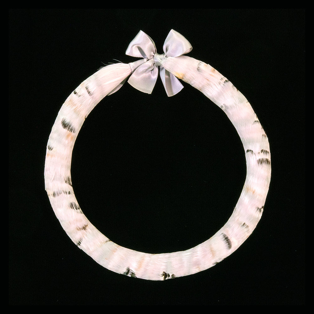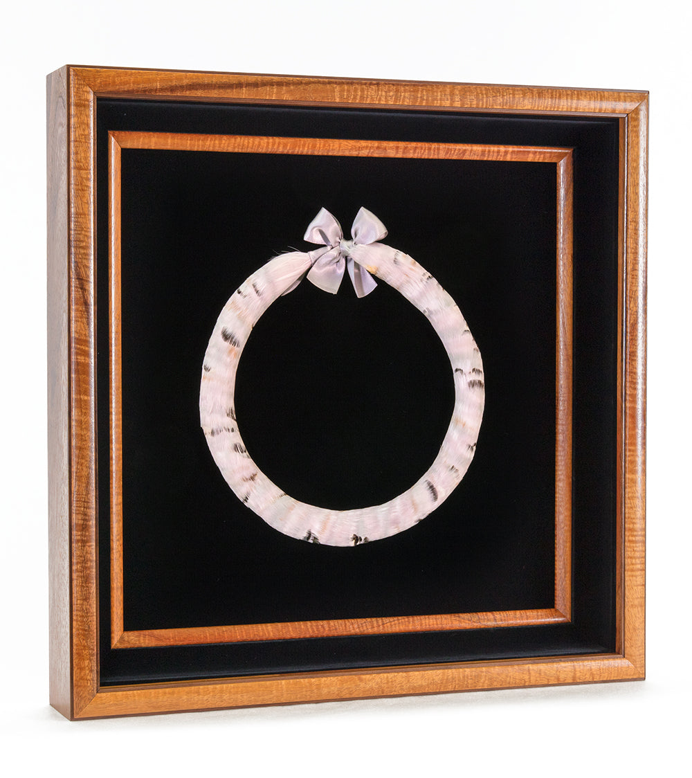 - Collar de plumas enmarcado, presentado en una caja de sombra hecha a medida, diseñada individualmente para cada pieza. Medidas aproximadas: 48 cm de largo x 8 cm de ancho x 48 cm de alto.
