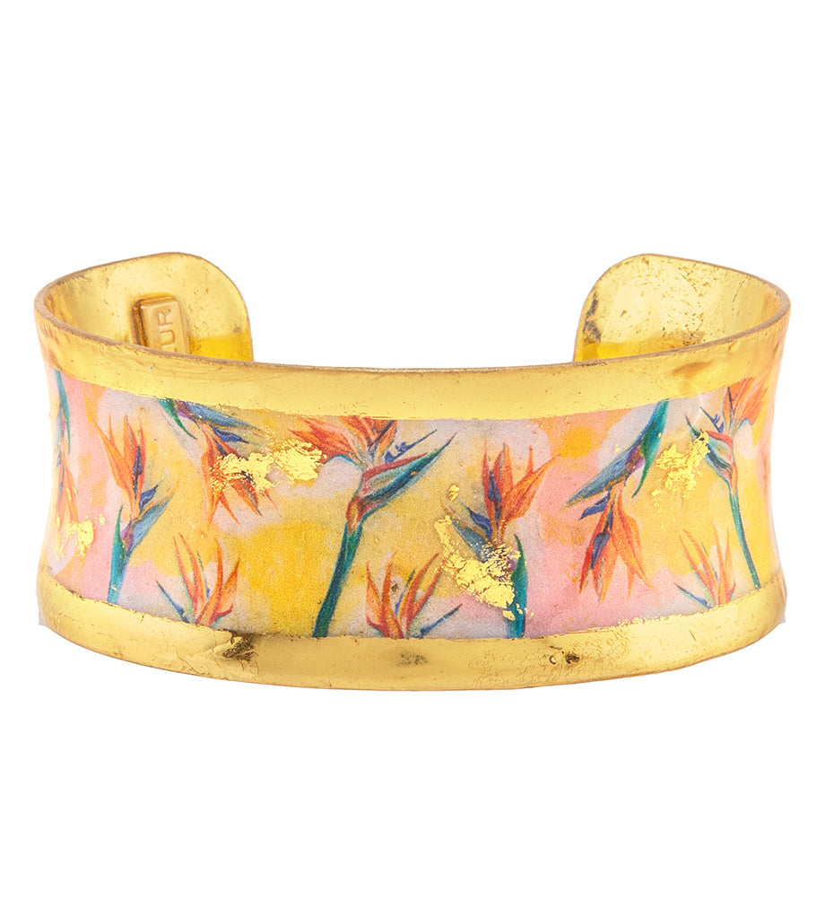 Este brazalete artesanal es una obra de arte para lucir en tu muñeca, con llamativas franjas amarillas y rosas estampadas con una de las flores favoritas de Rachel, el ave del paraíso, y toques adicionales de pan de oro brillante.