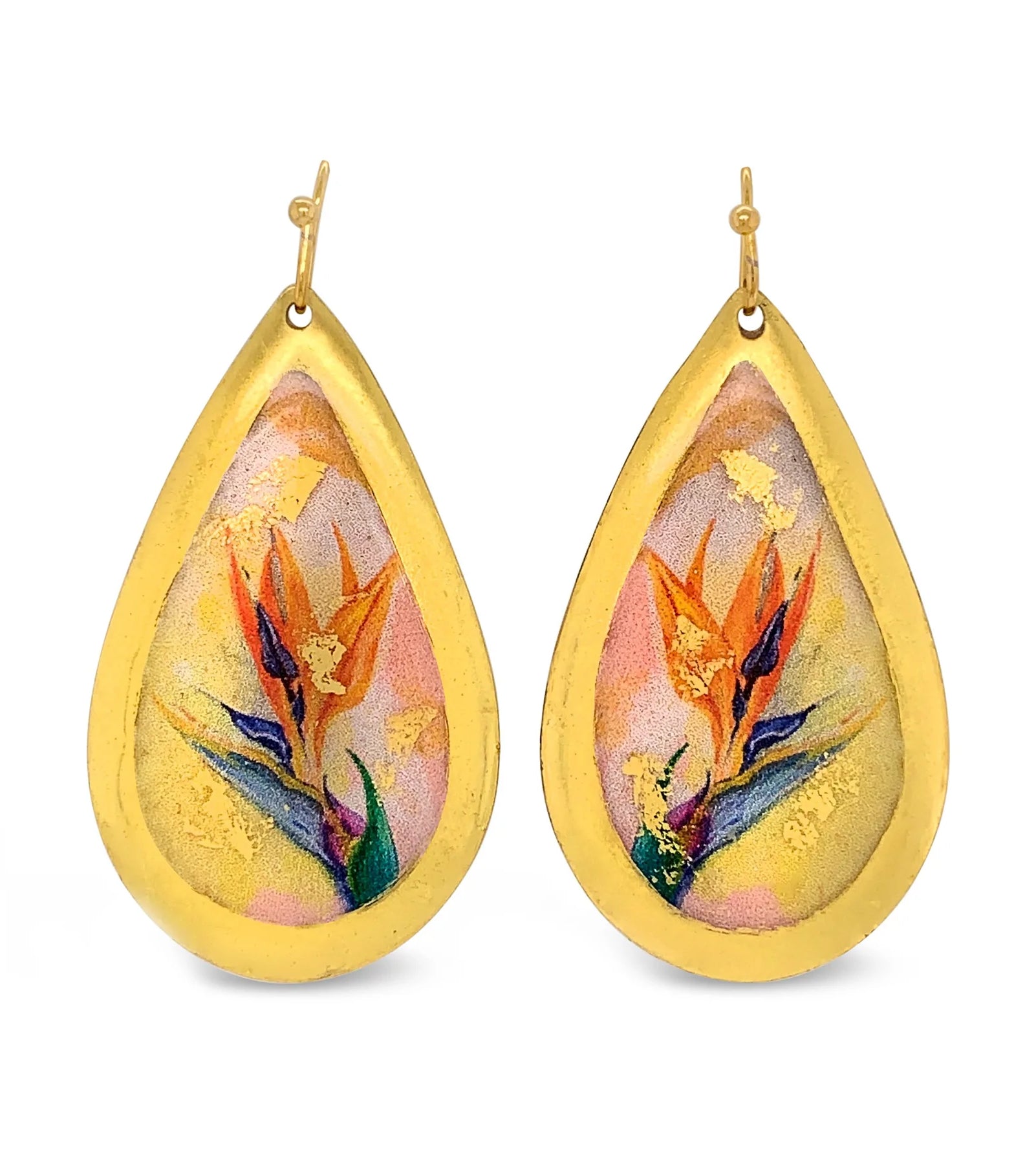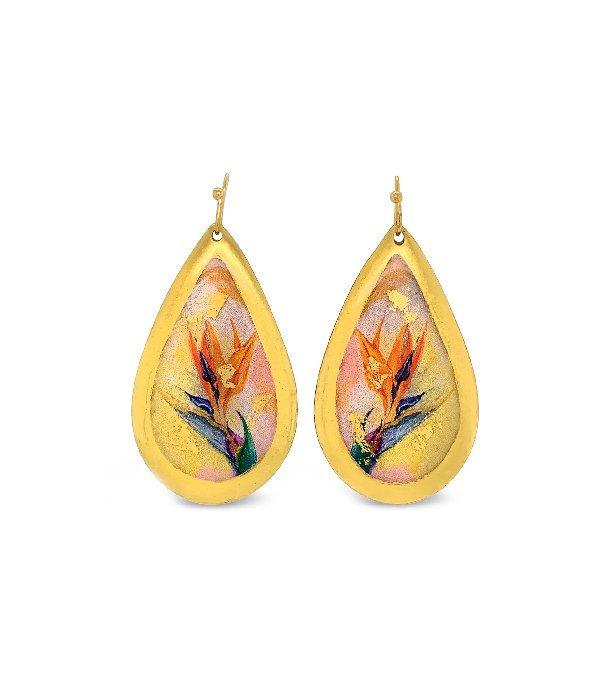 Estos pendientes en forma de lágrima, que presentan una única y hermosa ave del paraíso —una de las flores favoritas de Rachel en Florida— en una bruma onírica de rosa suave, amarillo, blanco y oro brillante, están dorados a mano con pan de oro de 22 quilates.