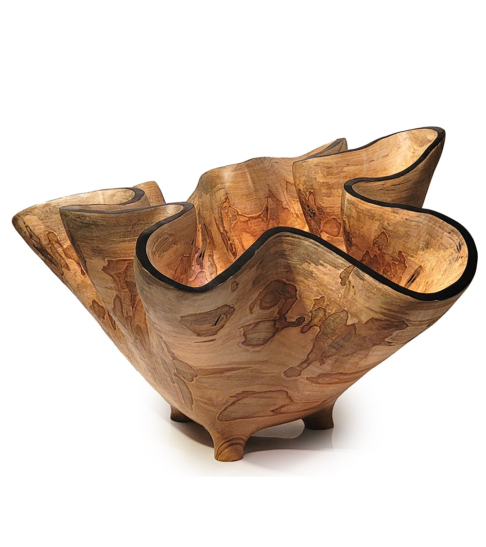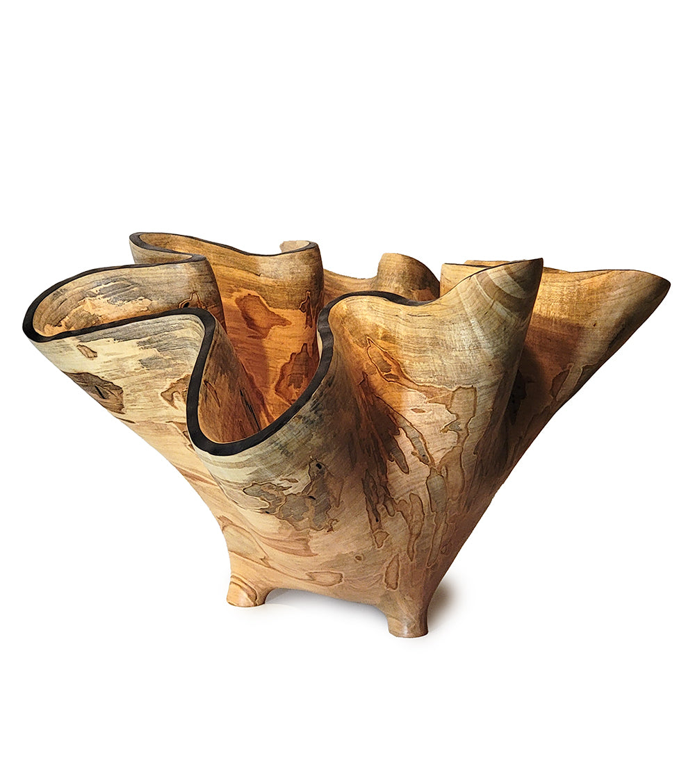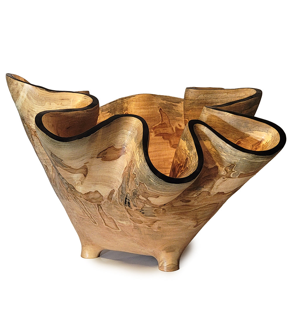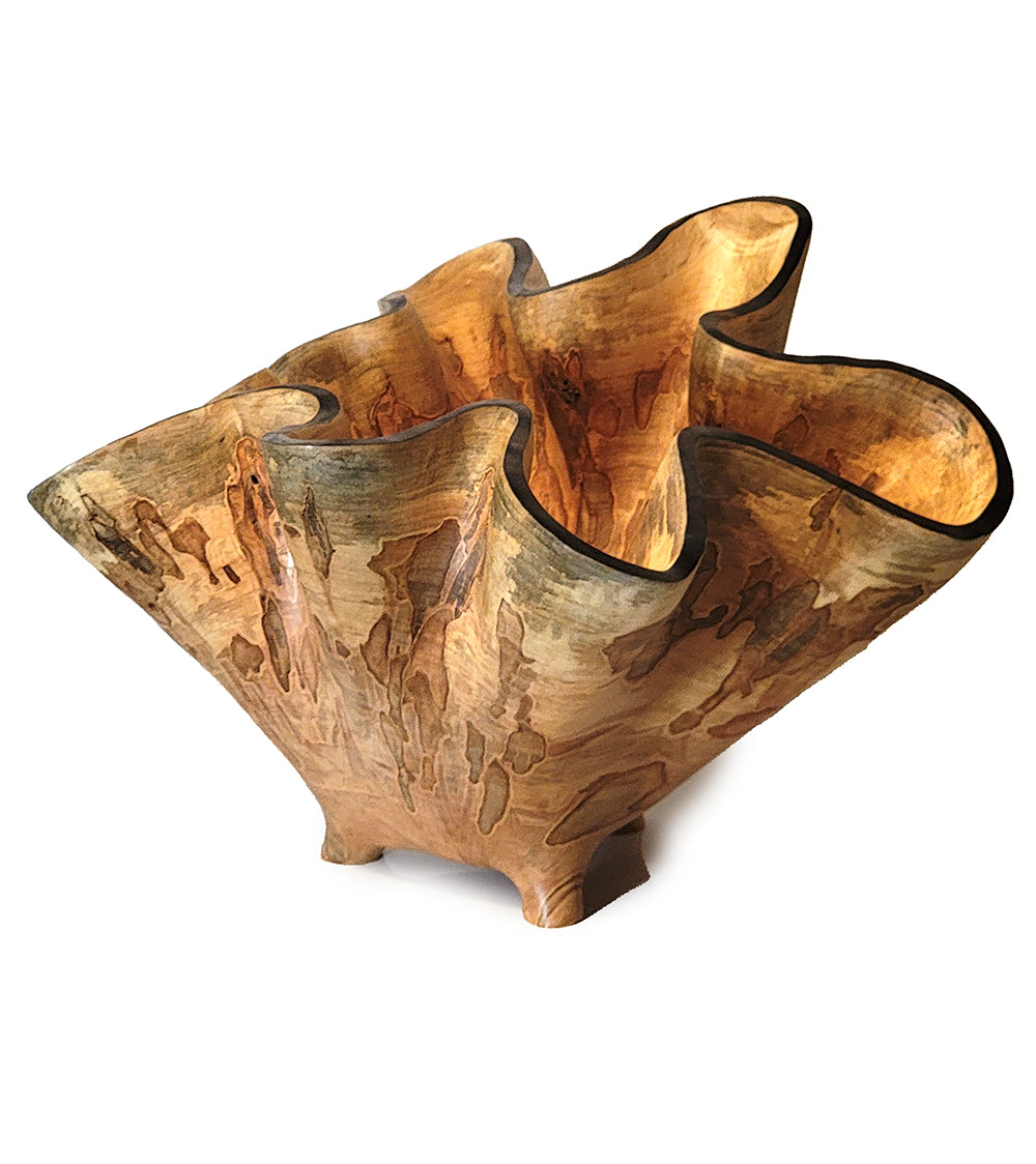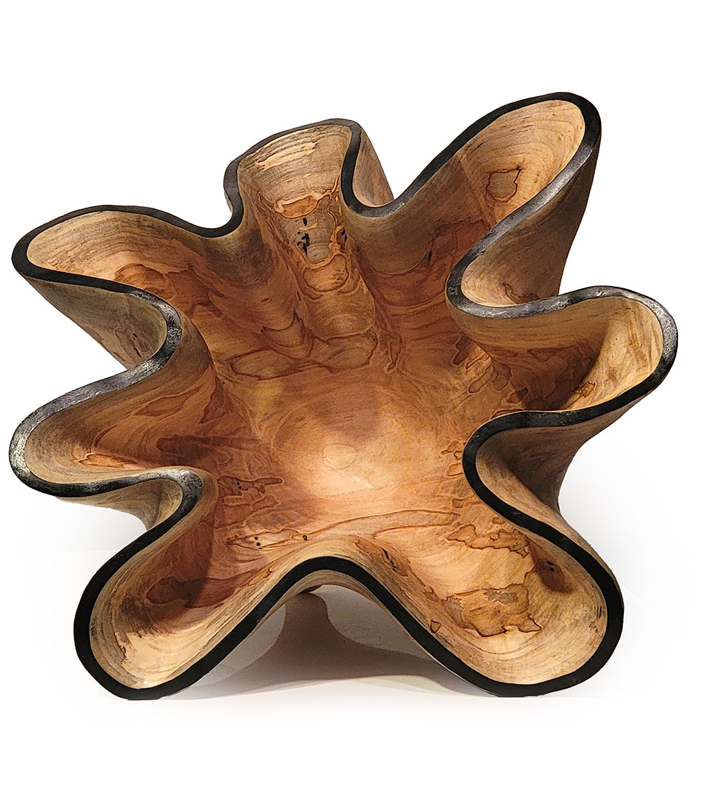 Esculpida a partir de la base de un hermoso arce plateado Ambrosia. Ribete azul oscuro, acabado con aceite de tung. 40,6 cm de ancho x 40,6 cm de profundidad x 30,5 cm de alto.