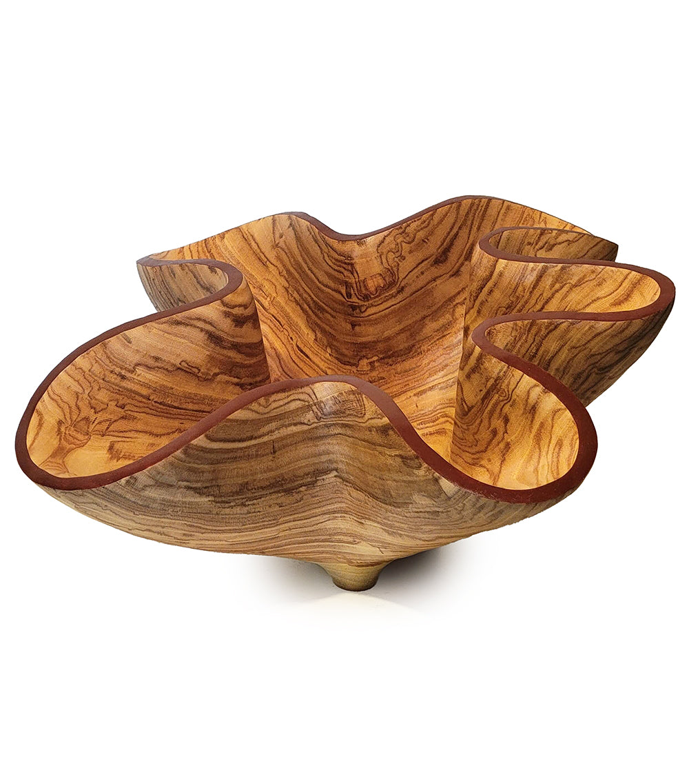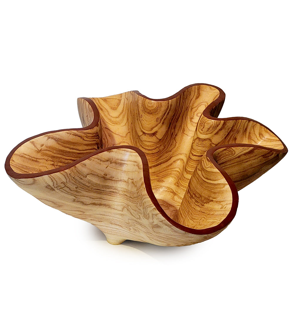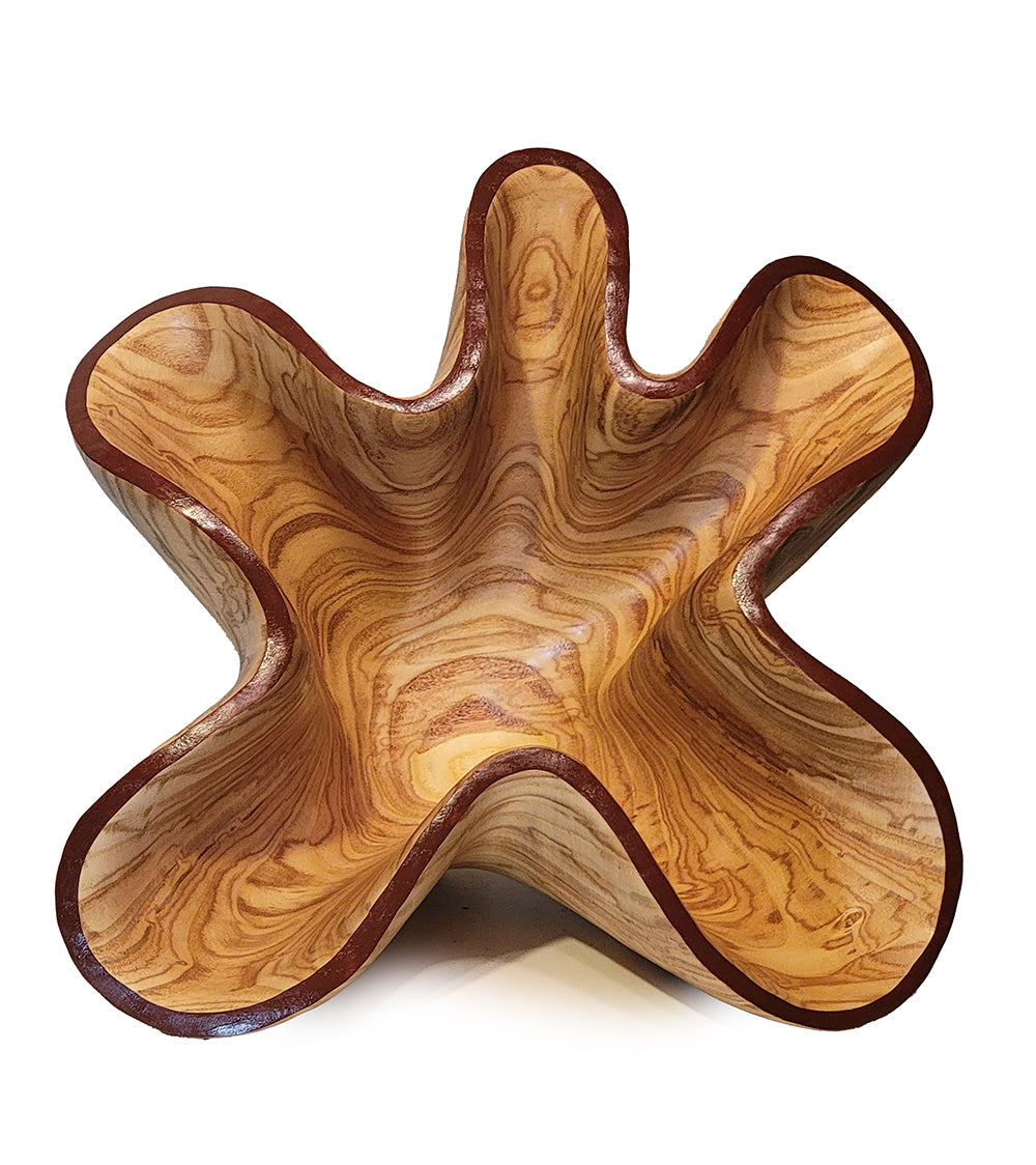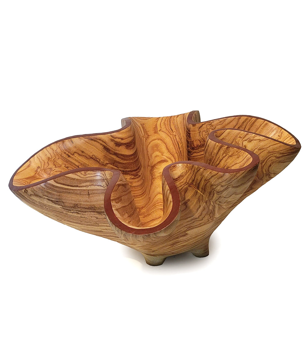 Esta escultura en forma de cuenco fue tallada en una hermosa pieza de madera de fresno olivo. Inspirada en las ondulantes capas del Cañón del Antílope en Arizona. Acabada con goma laca y aceite danés.