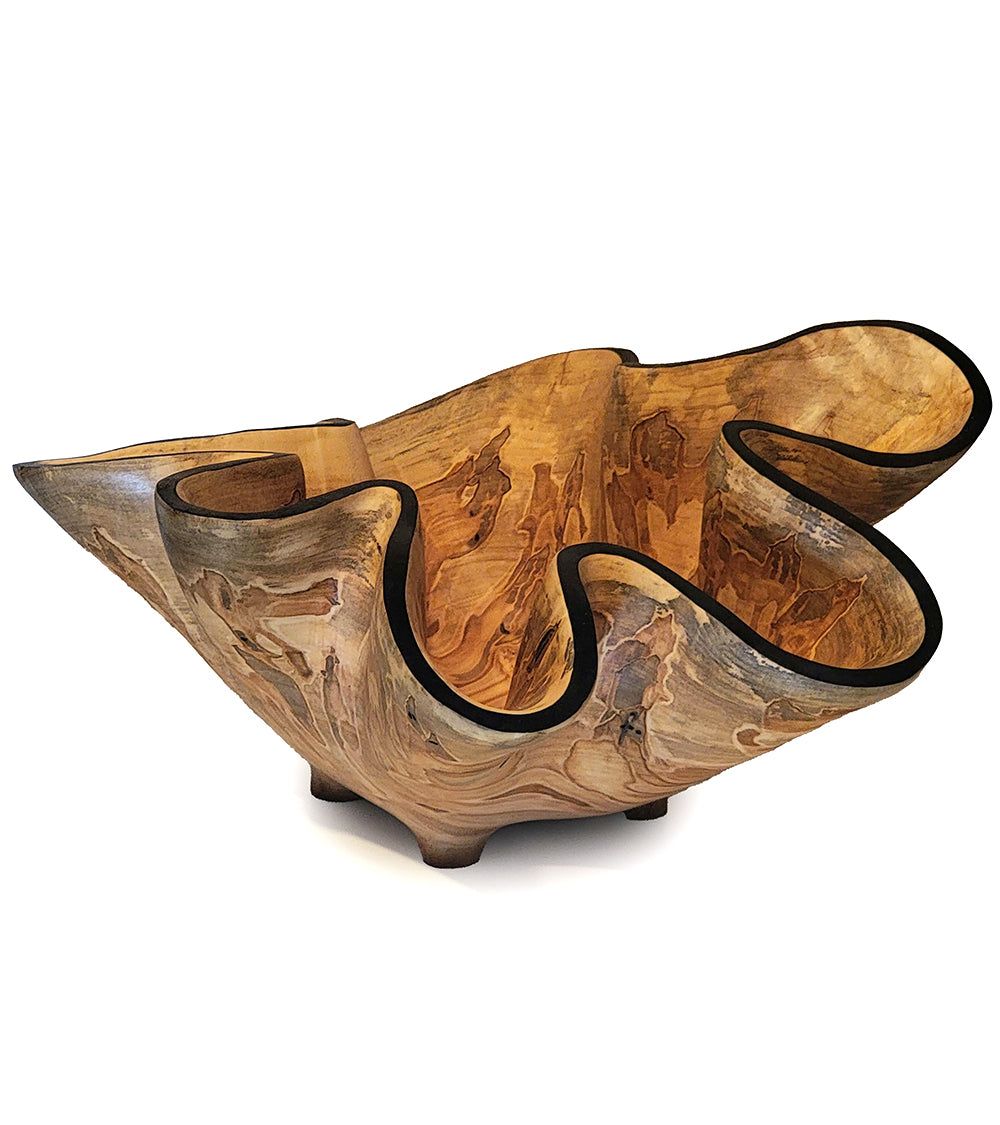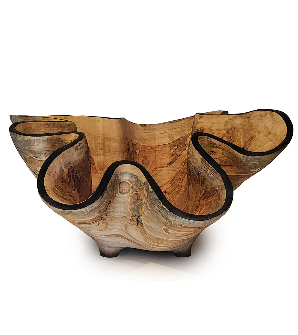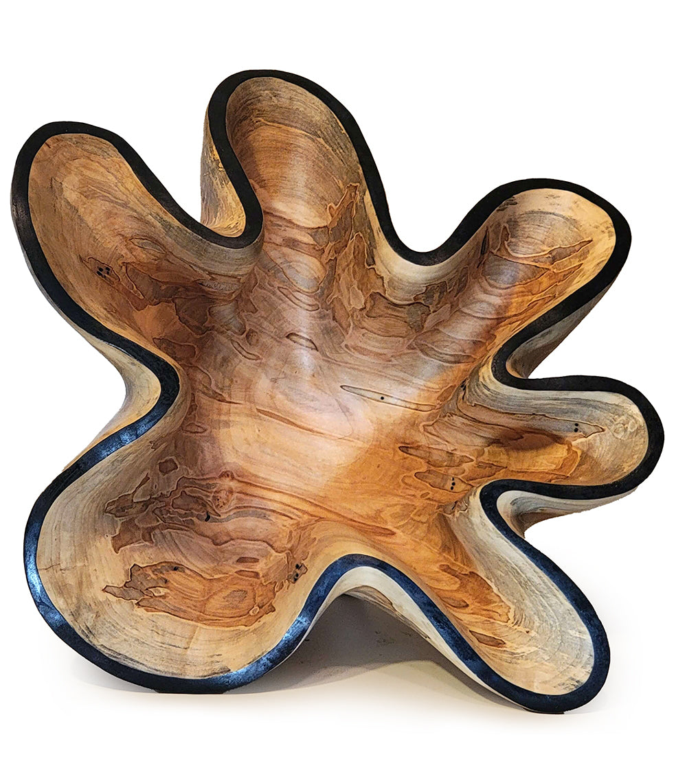 Esculpida a partir de la base de un hermoso arce plateado Ambrosia. Ribete azul oscuro, acabado con aceite de tung. 40,6 cm de ancho x 40,6 cm de profundidad x 22,9 cm de alto.