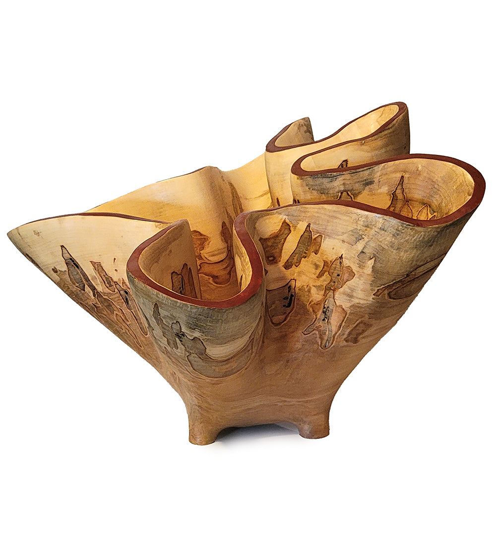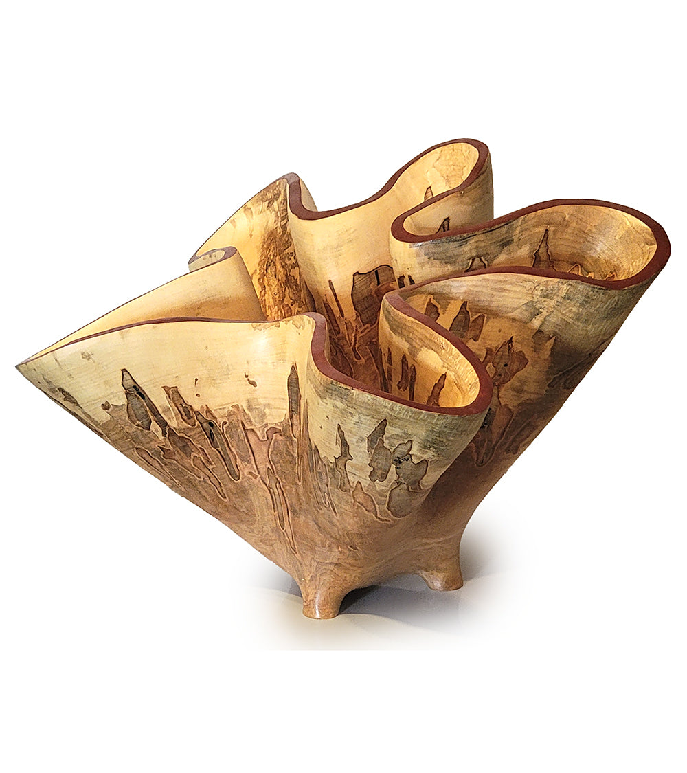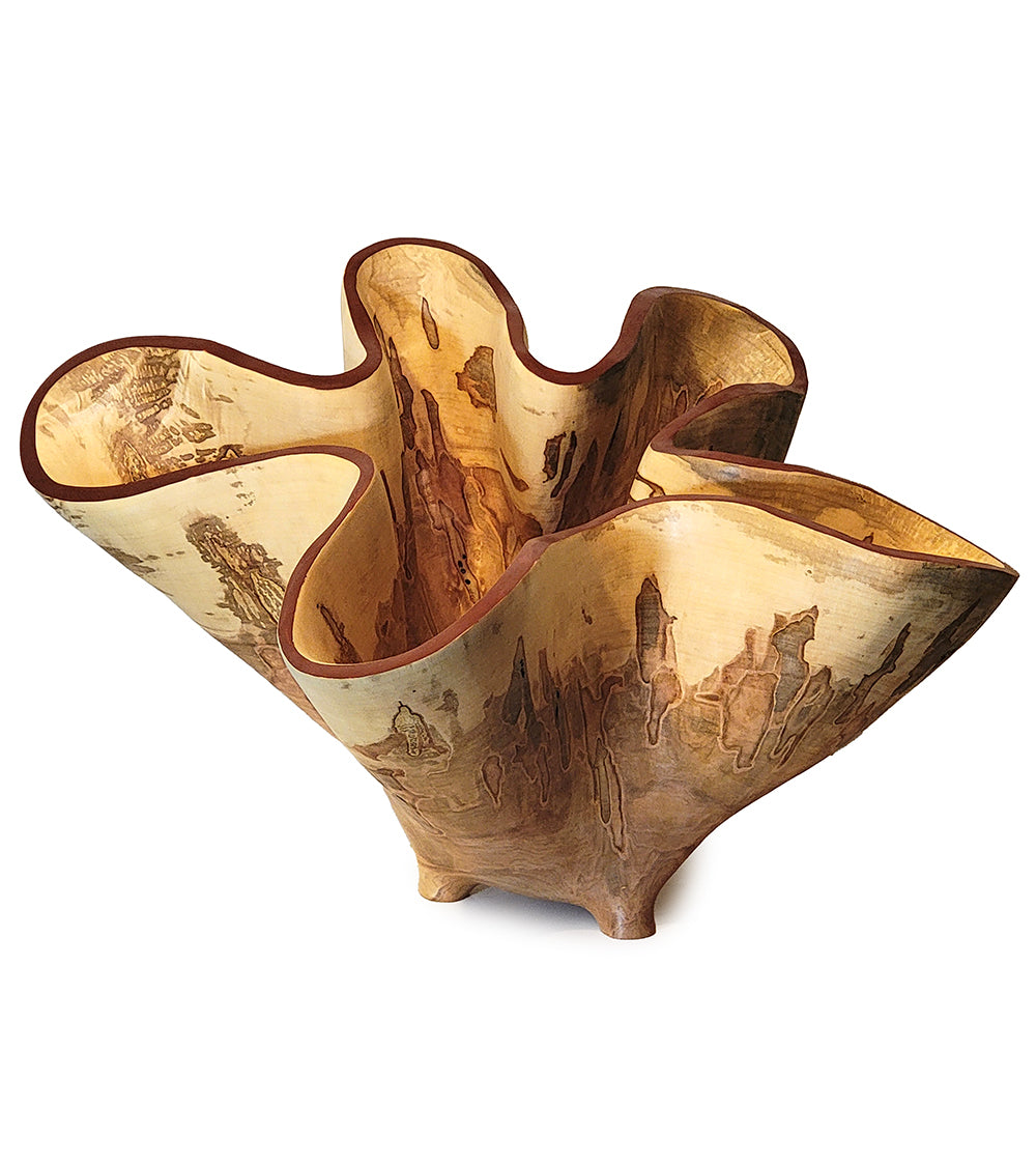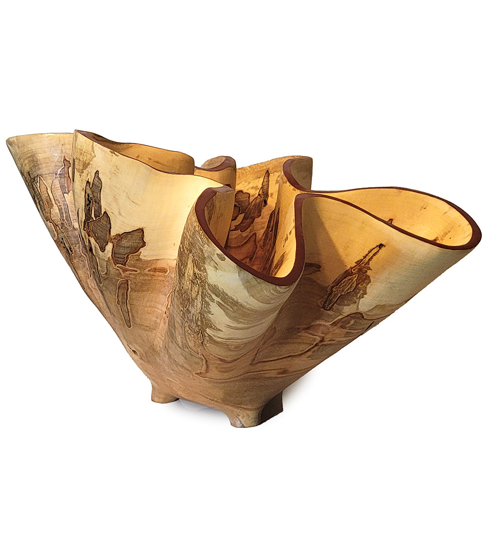 Esculpida a partir de la base de un hermoso arce plateado Ambrosia. Ribete color burdeos, acabado con aceite de tung. 40,6 cm de ancho x 35,6 cm de profundidad x 30,5 cm de alto.