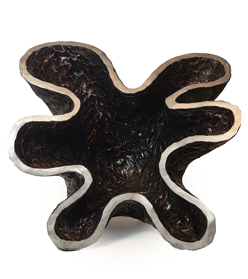 Texturizado, lijado y teñido de negro con borde plateado. Acabado.