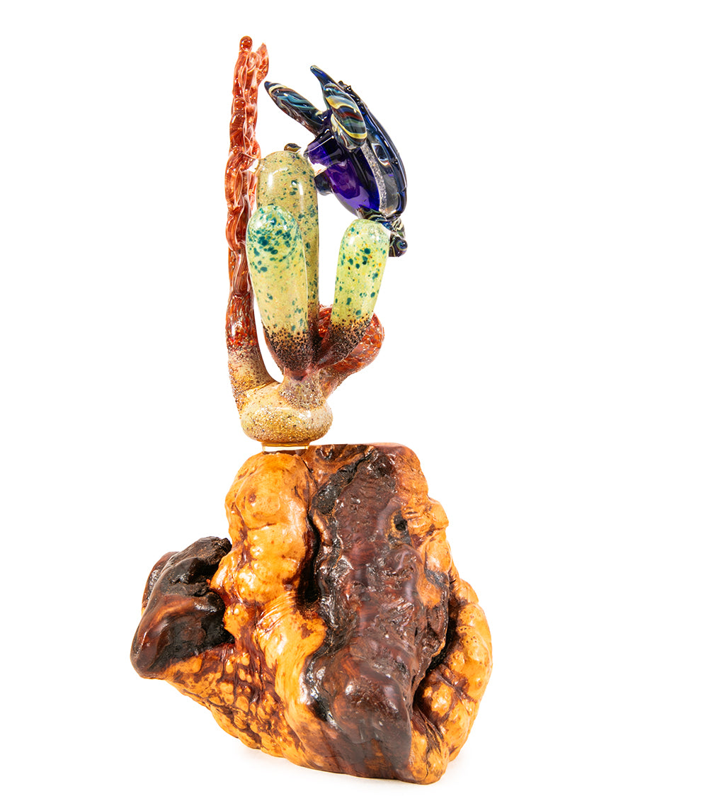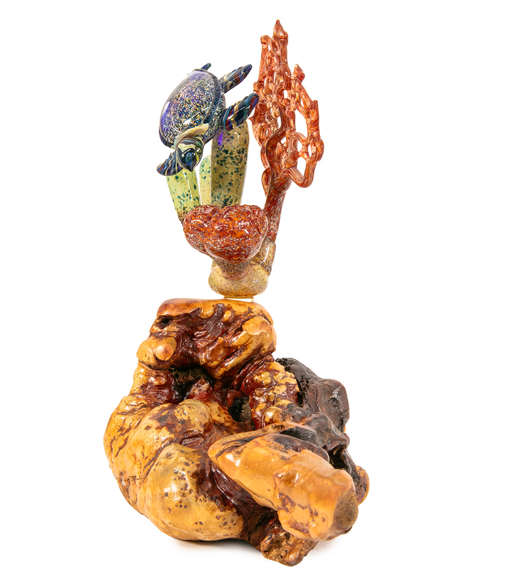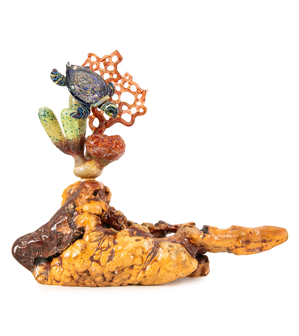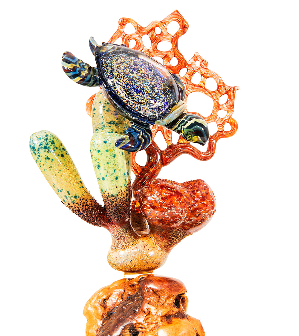 Inspirándose en los vibrantes paisajes y la vida marina de las islas hawaianas, Luke se especializa en vidrio borosilicato trabajado a la llama, el mismo material duradero que se utiliza en utensilios de laboratorio y de cocina.