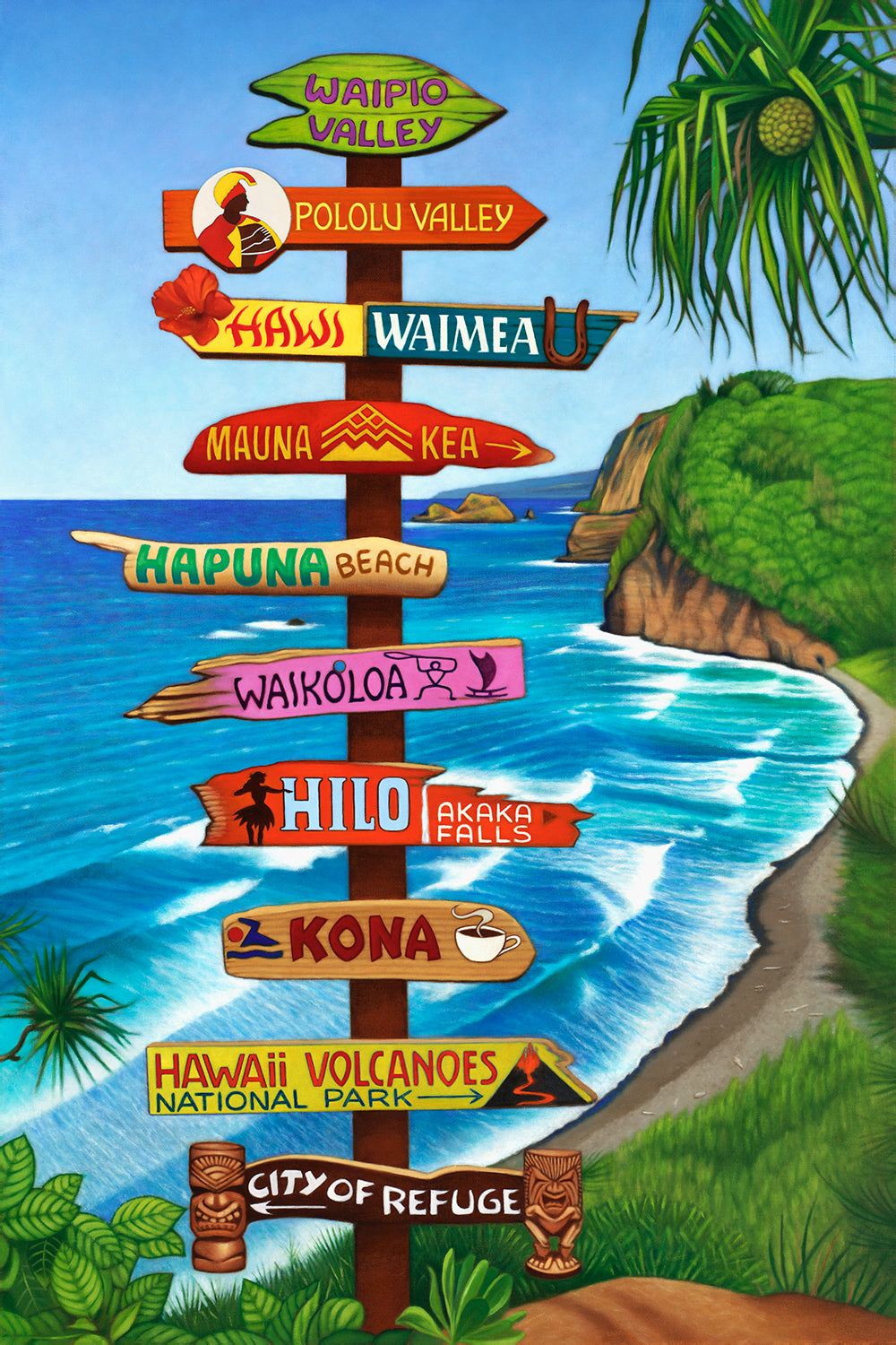 En Hawái, todos los caminos llevan a un lugar maravilloso. Esa creencia inspiró a Edyta Franczak a crear esta encantadora pintura de un letrero. Edyta no es una rotulista cualquiera. Creció en Polonia y llegó a Hawái hace diez años tras graduarse en Derecho en su país natal. Es una de las mejores saltadoras de altura de Polonia y también violinista clásica. Las pinturas de letreros de Edyta son una expresión caprichosa del placer de vivir en Hawái. Para esta pintura, construye un letrero real y luego lo pinta. Descubre todas las demás pinturas de letreros de Edyta.