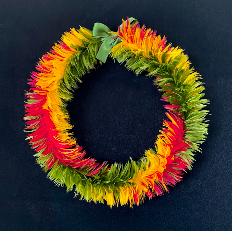 Boris elabora leis de diversos estilos con plumas de aves de diferentes especies, ninguna de ellas en peligro de extinción. Habrá ligeras variaciones en los colores de estos leis de plumas, ya que cada uno es una obra de arte hecha a mano.