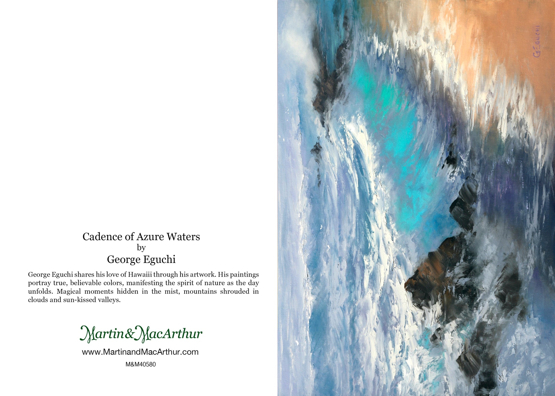 Las tarjetas de felicitación de Martin & MacArthur presentan obras de los renombrados artistas de nuestras galerías. Nos enorgullece promover a artistas locales contemporáneos de Hawái que capturan la belleza de Hawái de una manera única. Cada tarjeta está en blanco por dentro para que pueda usarse en cualquier ocasión. Todas las tarjetas incluyen un sobre para su comodidad.