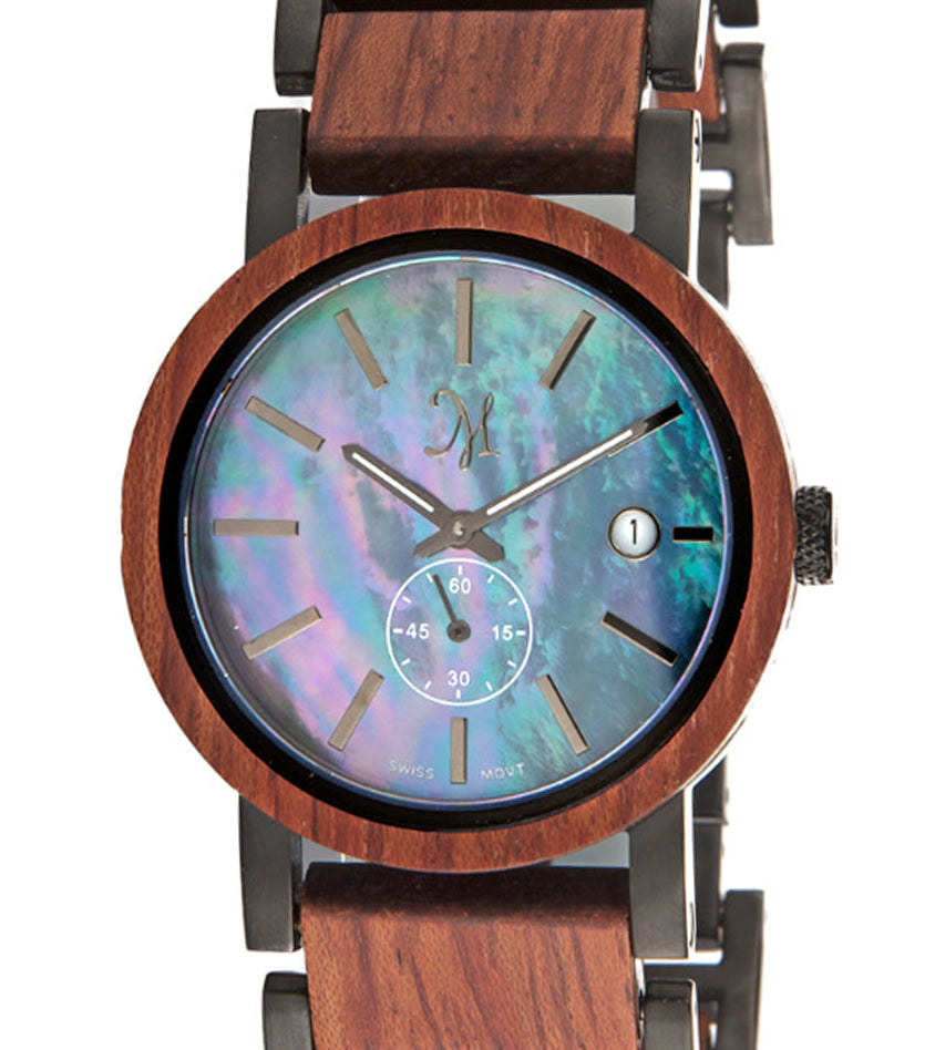 Este reloj cuenta con un mecanismo suizo de alta gama, protegido por cristal de zafiro y acero inoxidable resistente a la corrosión. La batería tiene una duración de hasta dos años y se puede reemplazar fácilmente. Nuestros relojes de madera son resistentes a las salpicaduras, pero no deben sumergirse en agua. Nuestra colaboradora Frances Lau, en la Columbia Británica, ensambla nuestros exclusivos relojes de madera siguiendo nuestras especificaciones de diseño al pie de la letra.