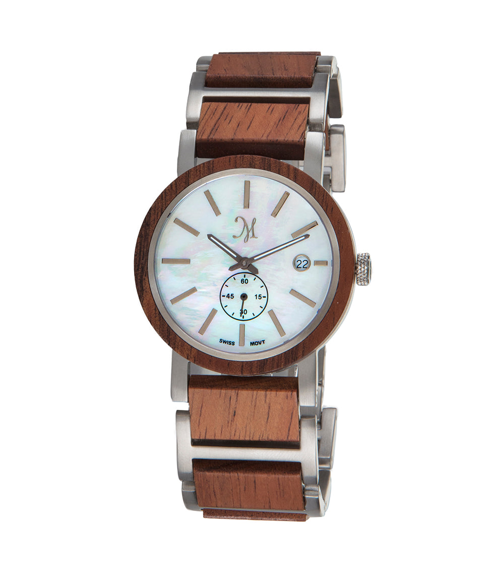 Nuestros relojes de madera de koa están elaborados con koa maciza de nuestra propia reserva privada, cosechada en la Isla Grande. Seleccionamos cuidadosamente la koa por su hermoso color y veta. Sin chapas. Koa maciza. La koa no se decolora ni se oscurece con el tiempo; al contrario, su pátina se enriquece con el uso.