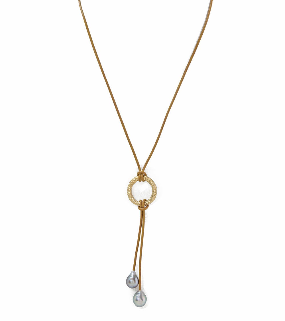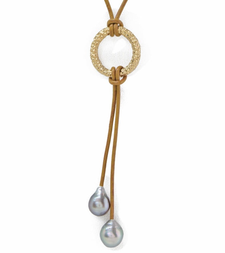 Collar de cuero con dos perlas de Tahití y detalle de coral