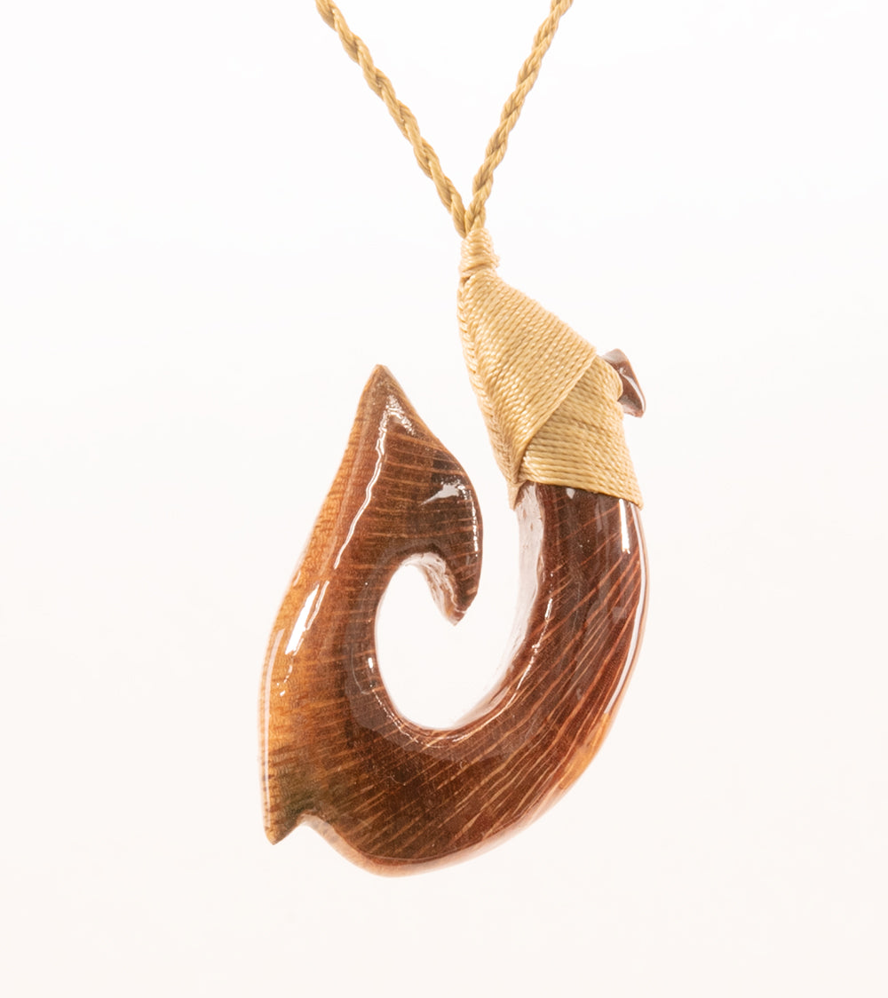 El artesano hawaiano Dewey Medeiros crea impresionantes colgantes de anzuelo con maderas duras hawaianas como koa rizado, padauk y corazón morado.