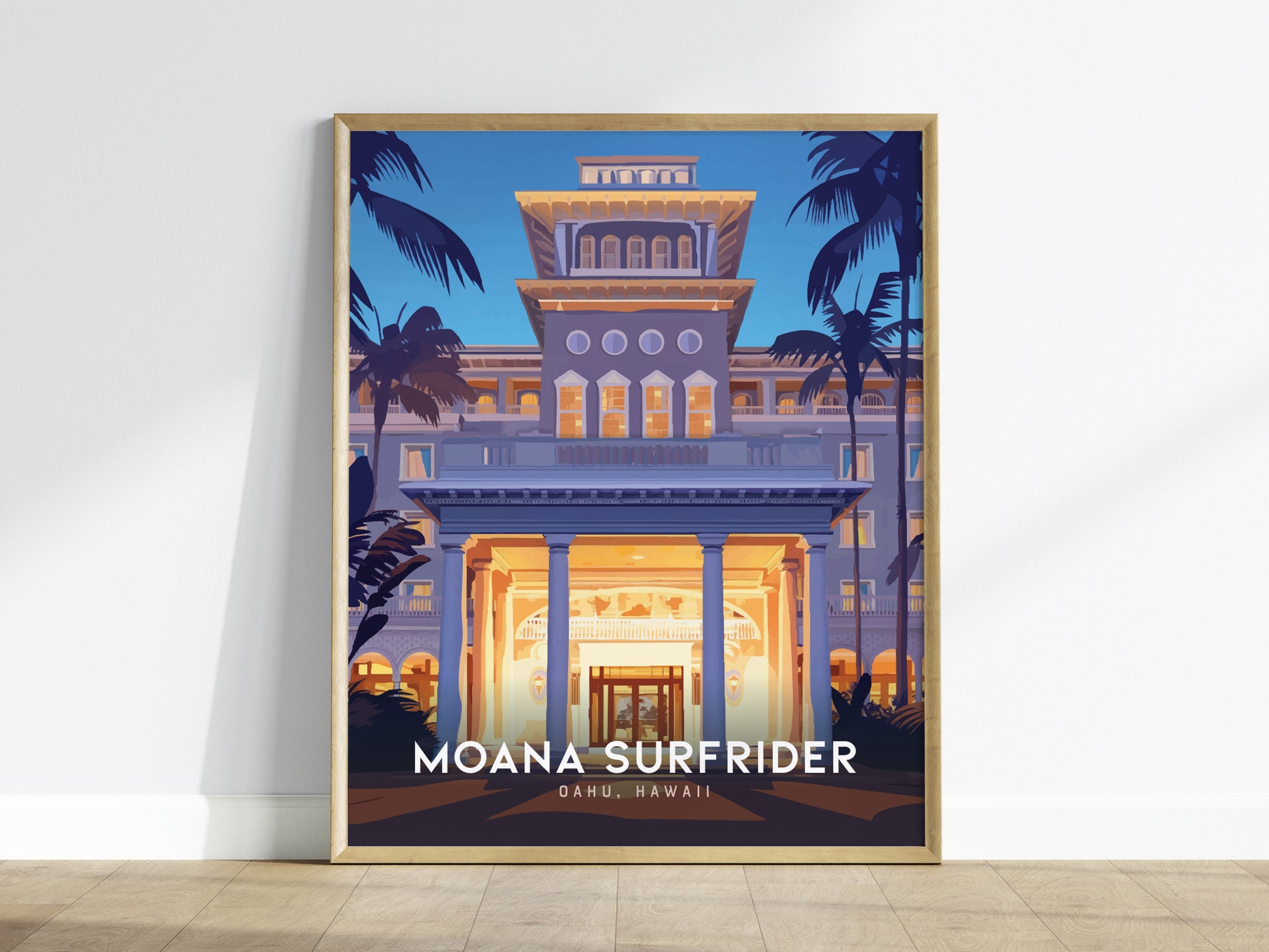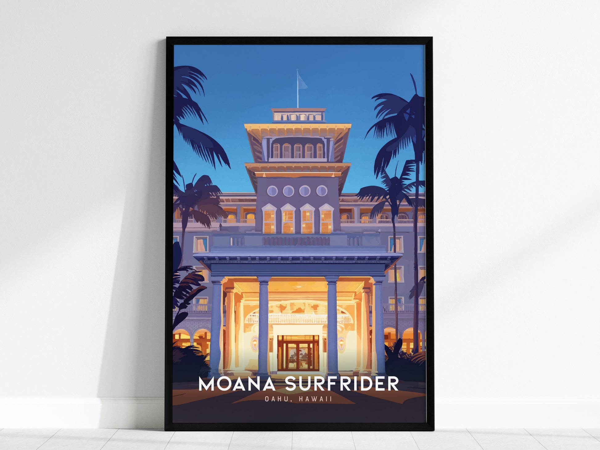 Celebra el encanto atemporal del hotel más emblemático de Waikiki con esta elegante lámina del Moana Surfrider. Conocido como la "Primera Dama de Waikiki", este histórico hotel frente al mar ha recibido huéspedes desde 1901. La obra captura la elegante arquitectura, las luminosas verandas y la entrada bordeada de palmeras al atardecer sobre Oahu, invitándote a sumergirte en una escena de lujo y espíritu aloha hawaiano.