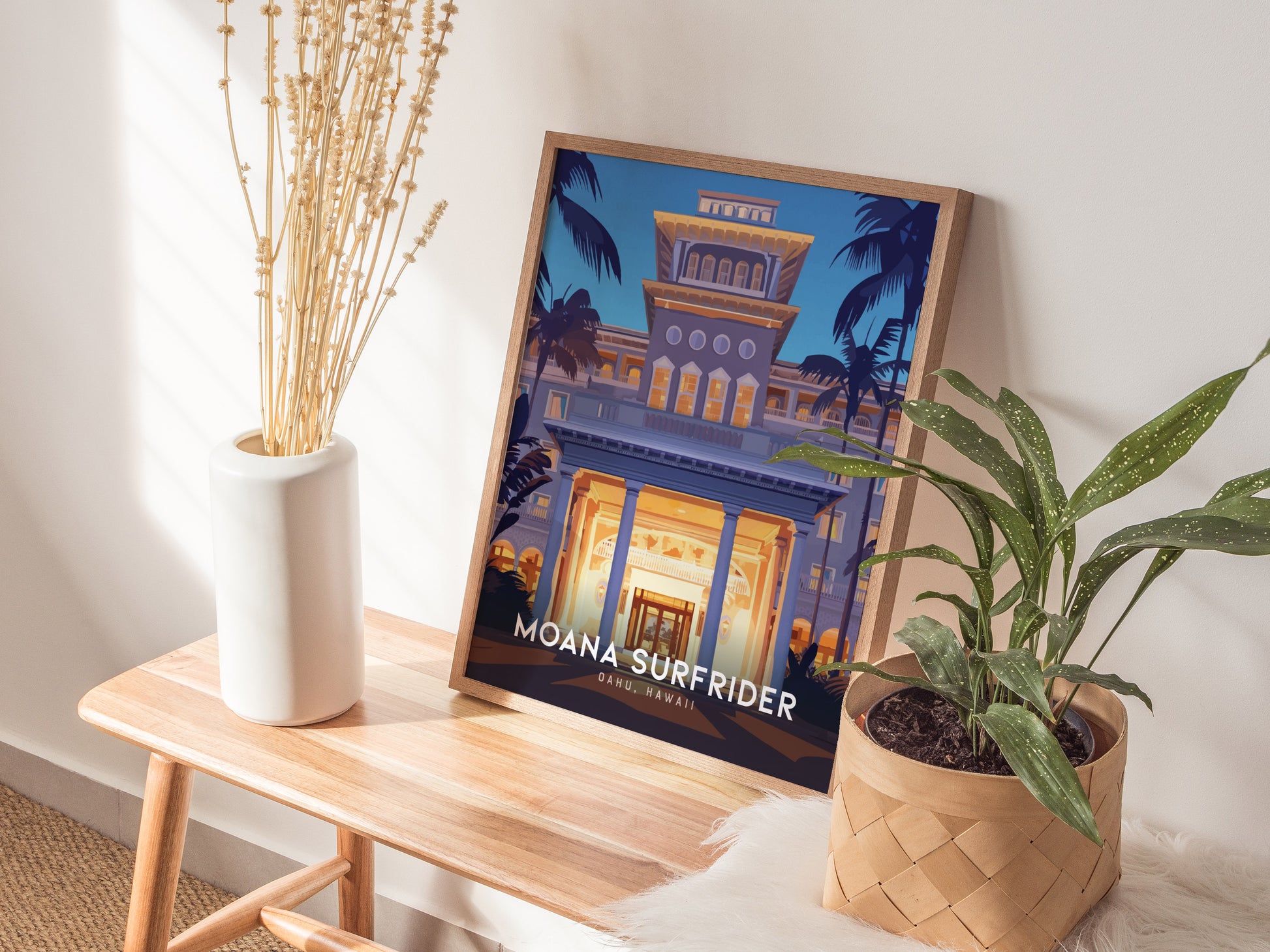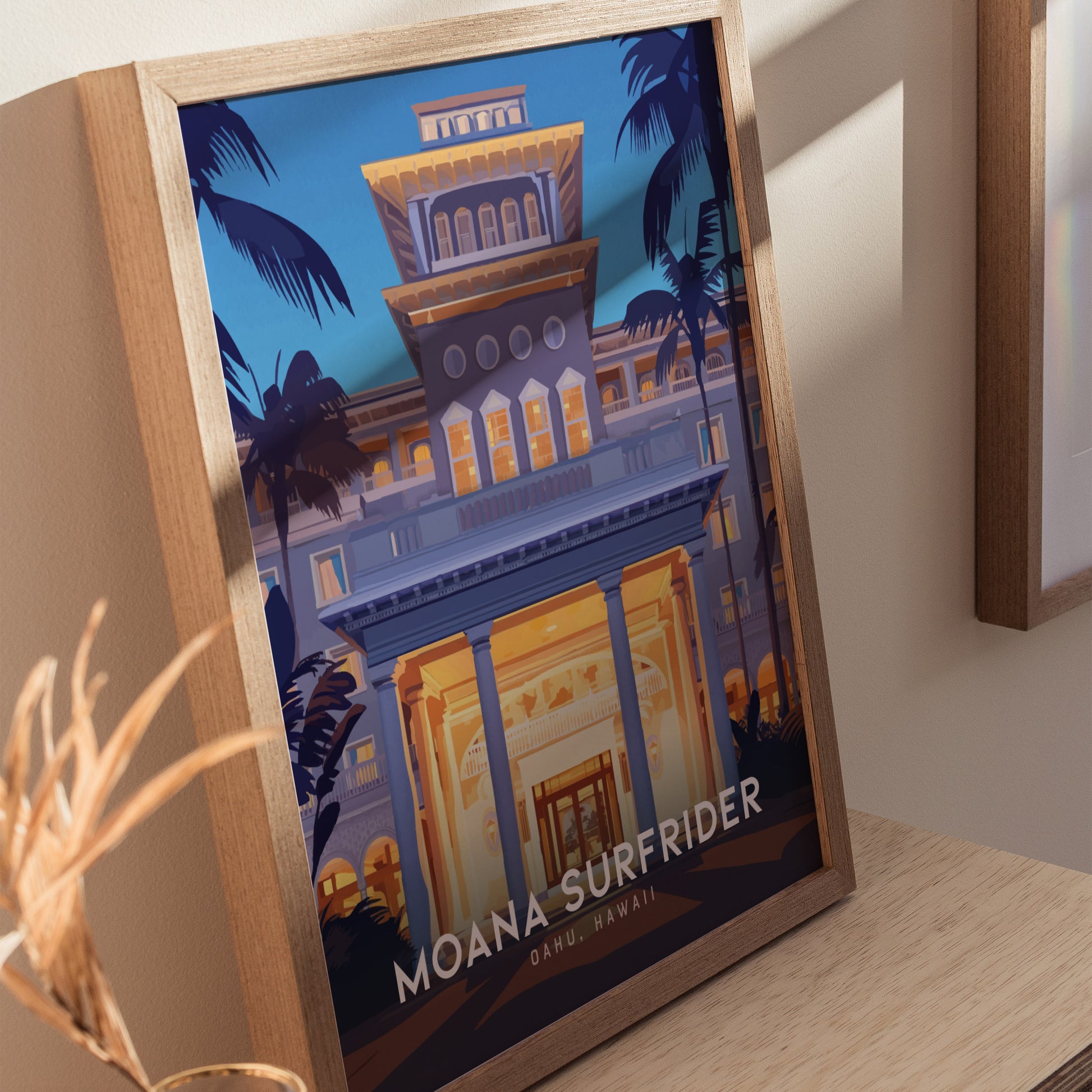 Impresa en papel mate de calidad museo, esta obra está disponible con y sin marco. La versión enmarcada viene lista para colgar, aportando al instante un toque cálido y sofisticado de estilo isleño a cualquier habitación. Ideal para decoración costera, amantes de los hoteles vintage o aficionados al Waikiki antiguo, esta lámina crea un ambiente tropical refinado.