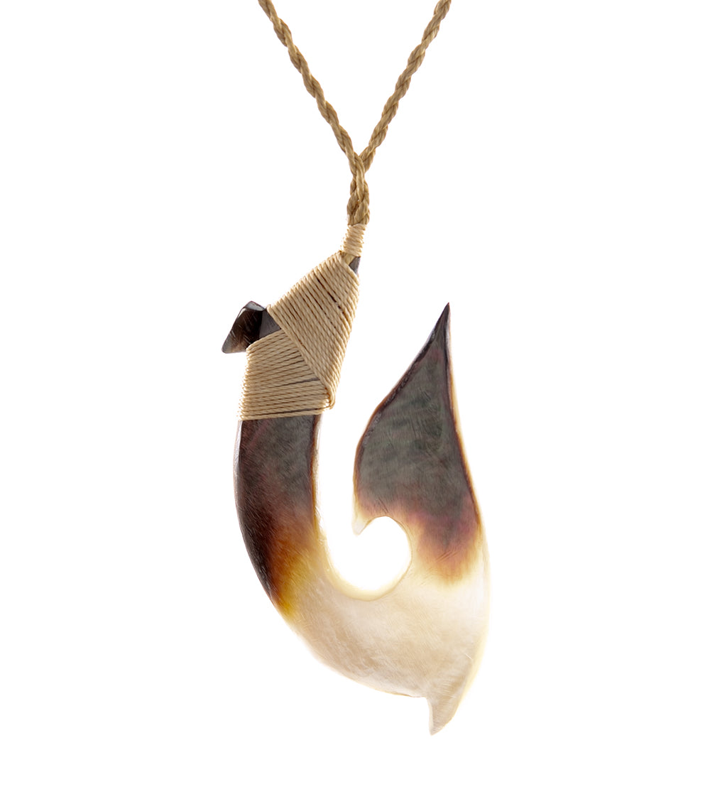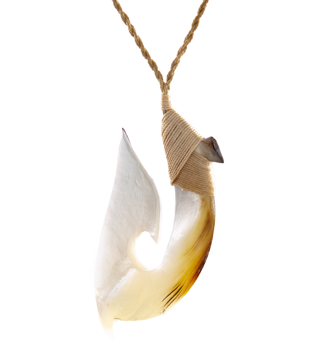 El artesano hawaiano Dewey Medeiros crea impresionantes colgantes con forma de anzuelo utilizando maderas duras hawaianas como la koa rizada, el padauk y el palo morado.