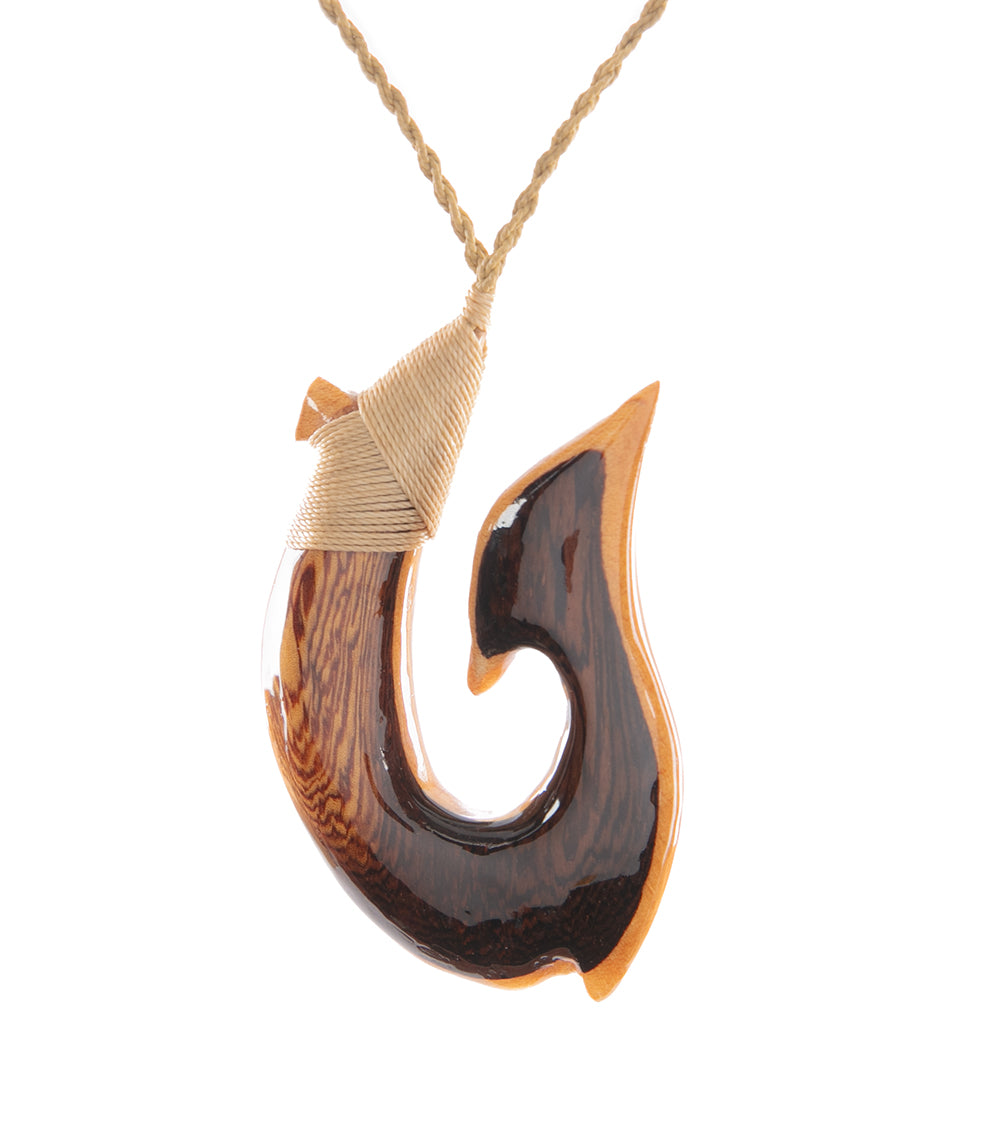 El artesano hawaiano Dewey Medeiros crea impresionantes colgantes con forma de anzuelo utilizando maderas duras hawaianas como la koa rizada, el padauk y el palo morado.