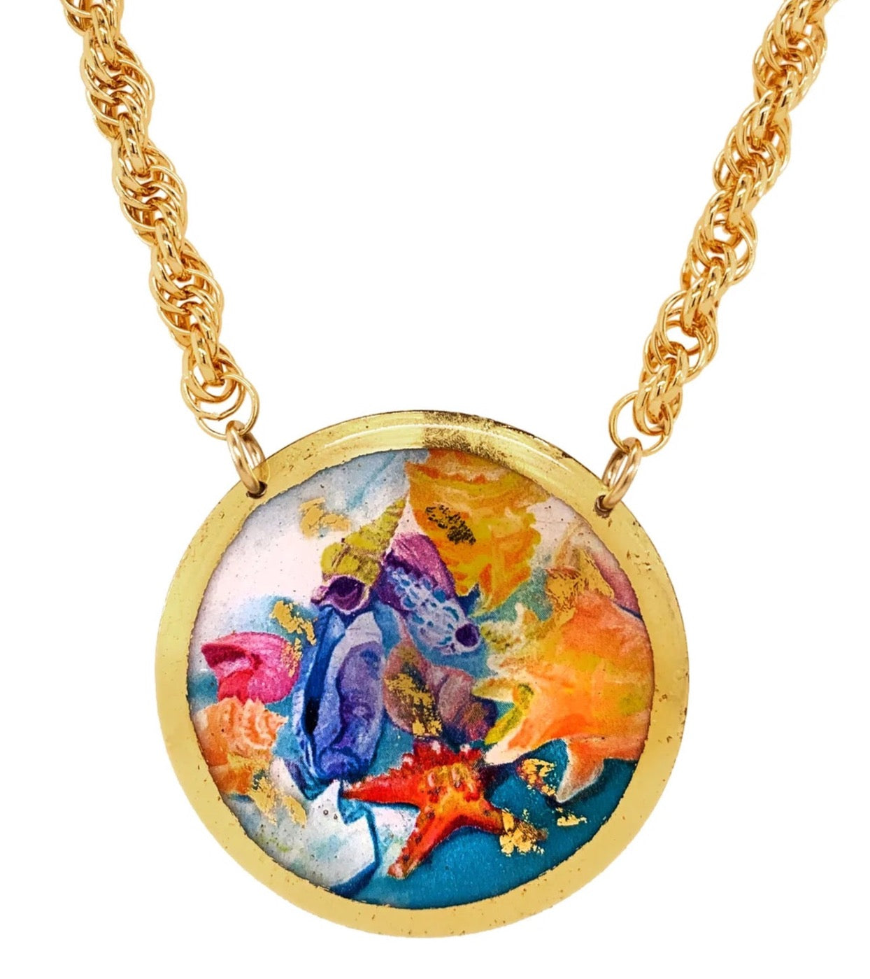 Una obra de arte colorida, tropical y portátil, este collar está dorado a mano con pan de oro de 22 quilates y presenta un arcoíris de conchas marinas realistas sobre un fondo azul océano abstracto, brillando con acentos de pan de oro de 22 quilates.