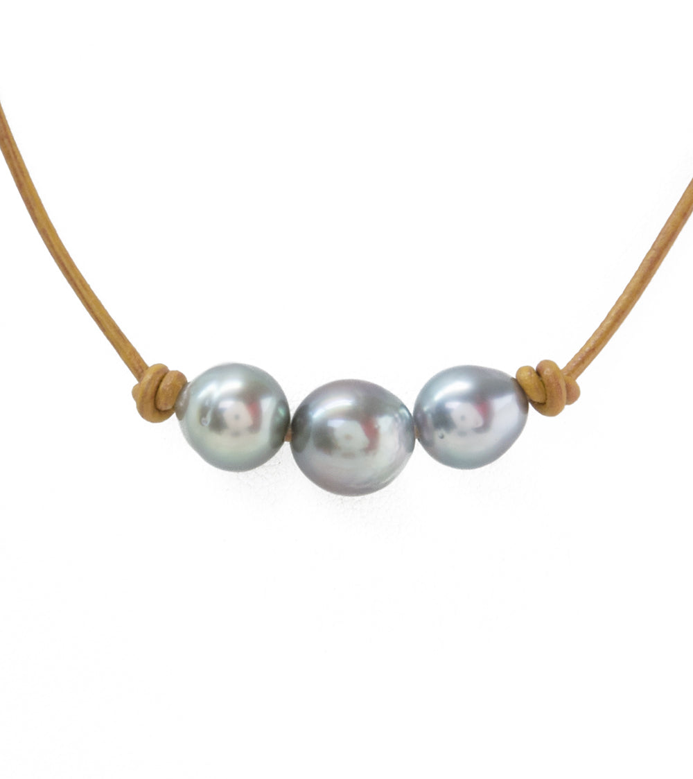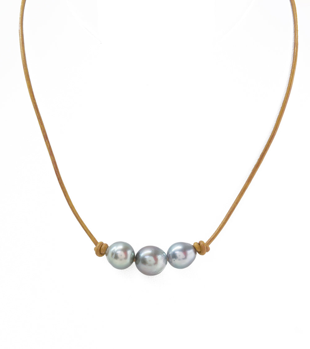 Gargantilla sencilla de cuero color canela con cuatro perlas de Tahití