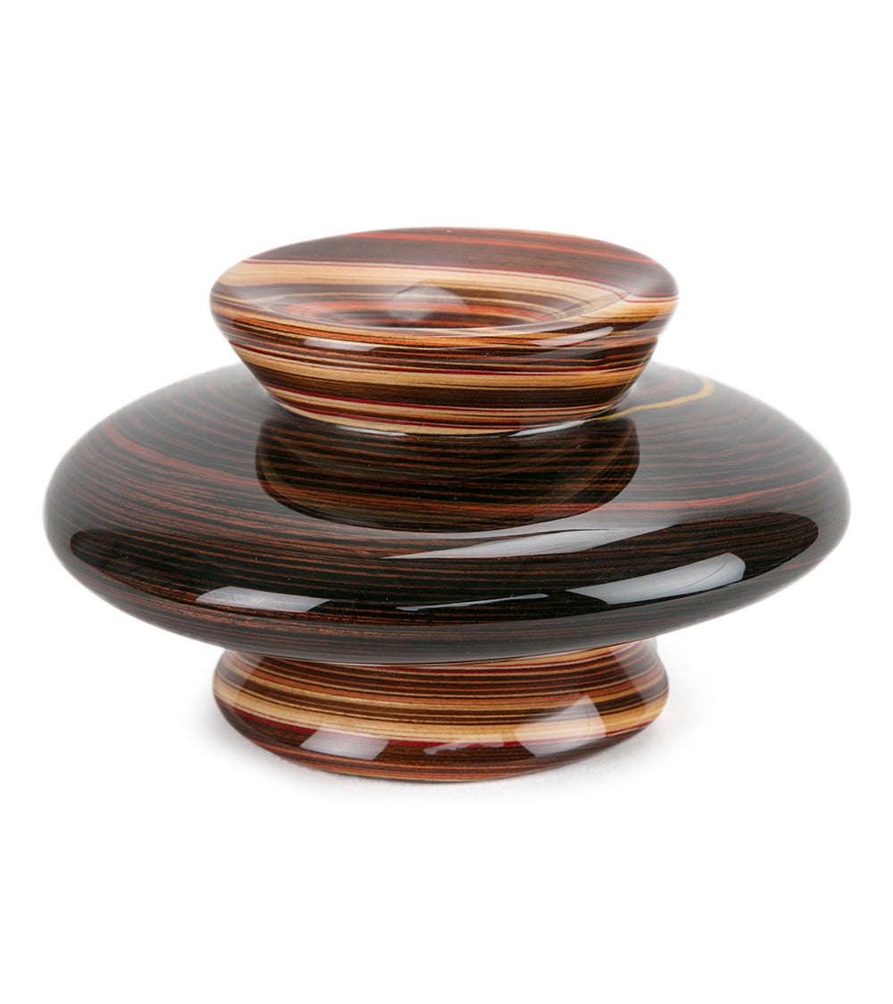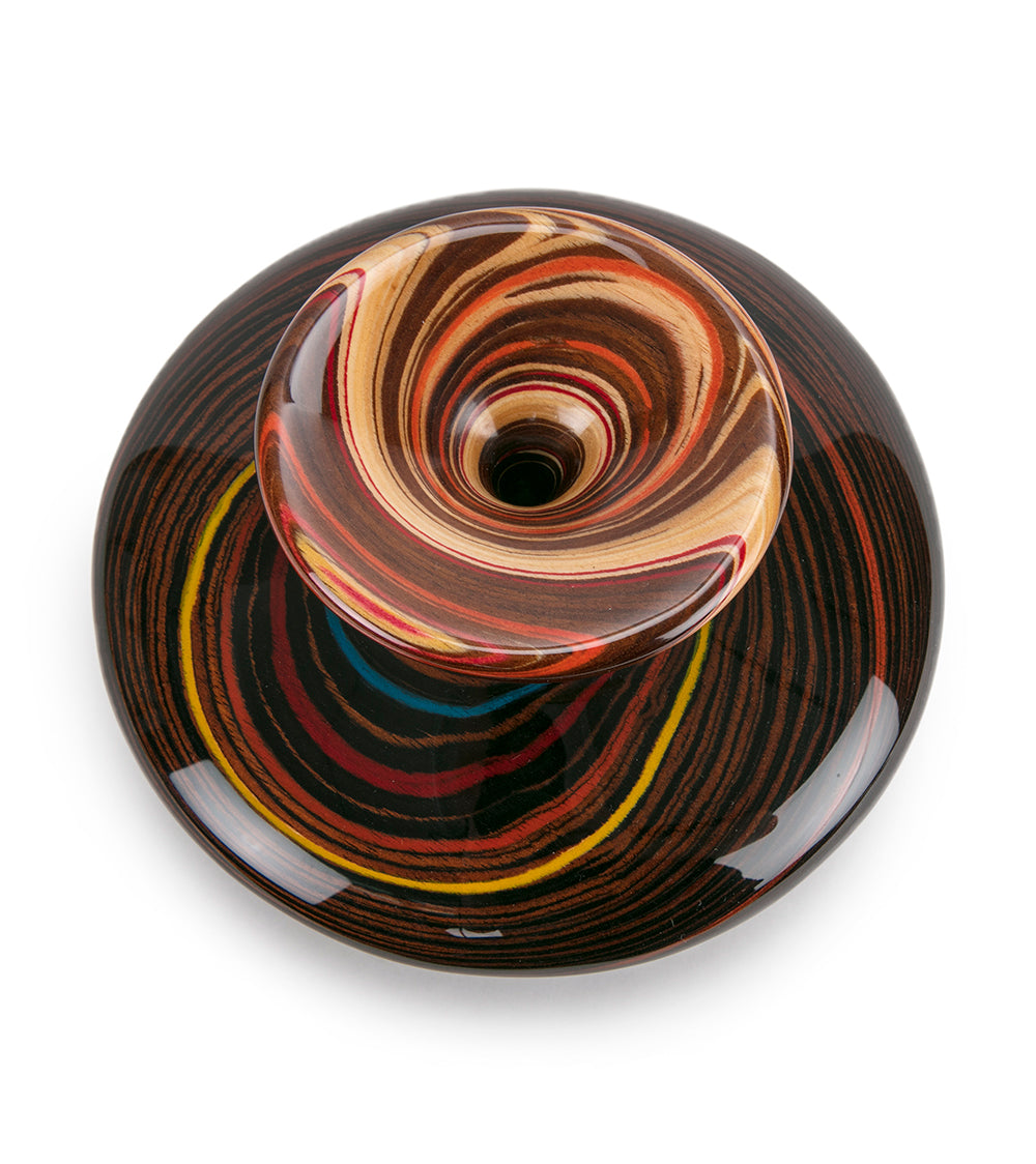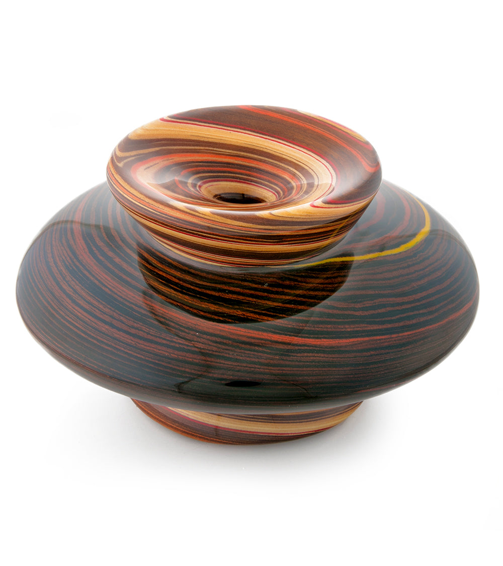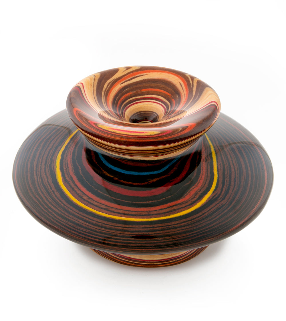 Rock comienza con las maderas exóticas más selectas del mundo, como el obeche africano, el arce italiano y el abedul finlandés. Delgadas capas de estas hermosas maderas se lijan, se secan y, en ocasiones, se tiñen con dos o más pigmentos contrastantes. Estos elementos se unen luego en capas alternas de color y textura de madera. Posteriormente, Rock esculpe a mano cada diseño, revelando sinuosos patrones de forma y color. Finalmente, la pieza se completa con más de diez capas de barniz protector.