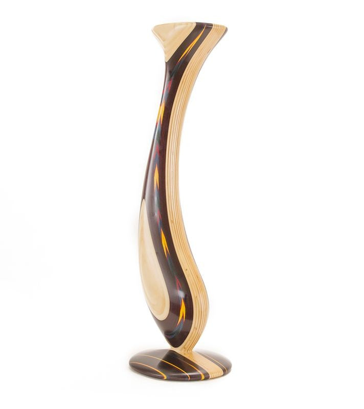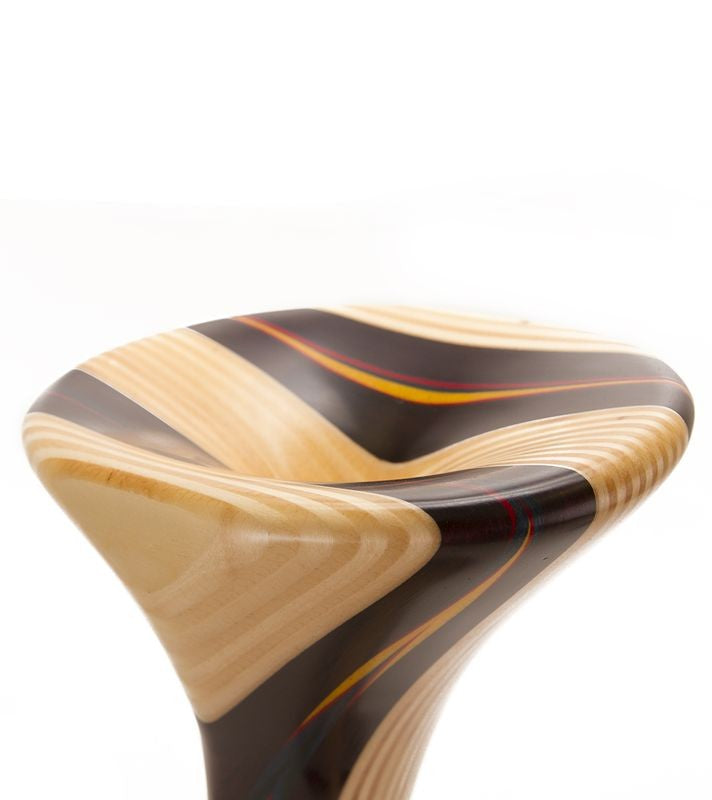 Rock comienza con las maderas exóticas más selectas del mundo, como el obeche africano, el arce italiano y el abedul finlandés. Delgadas capas de estas hermosas maderas se lijan, se secan y, en ocasiones, se tiñen con dos o más pigmentos contrastantes. Estos elementos se unen luego en capas alternas de color y textura de madera. Posteriormente, Rock esculpe a mano cada diseño, revelando sinuosos patrones de forma y color. Finalmente, la pieza se completa con más de diez capas de barniz protector.