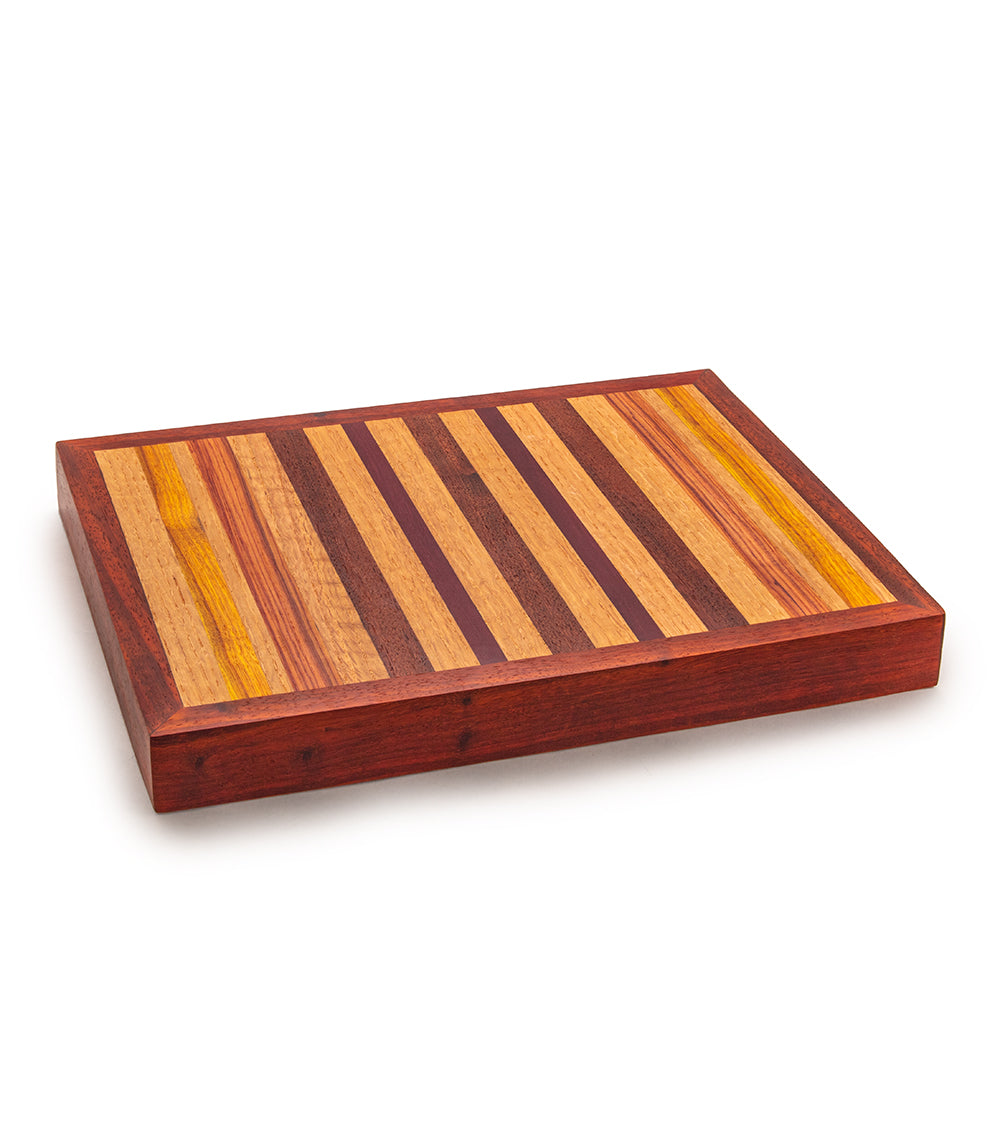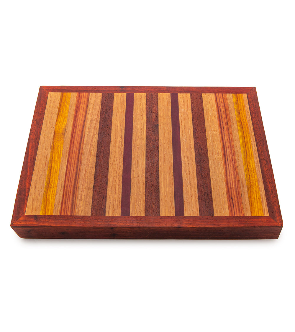 ハワイの職人デールは、ハワイアンウッドの象嵌細工を施したカッティングボードを製作しています。そのスタイルと優雅さは、「優雅なハワイアンリビング」を彩るにふさわしいものです。ハワイやその他の熱帯地域から持続可能な方法で調達された木材を使用し、一つ一つが唯一無二の機能的な芸術作品となっています。これらのカッティングボードは、退役したアメリカ空軍のデールによってハワイで丁寧に作られています。