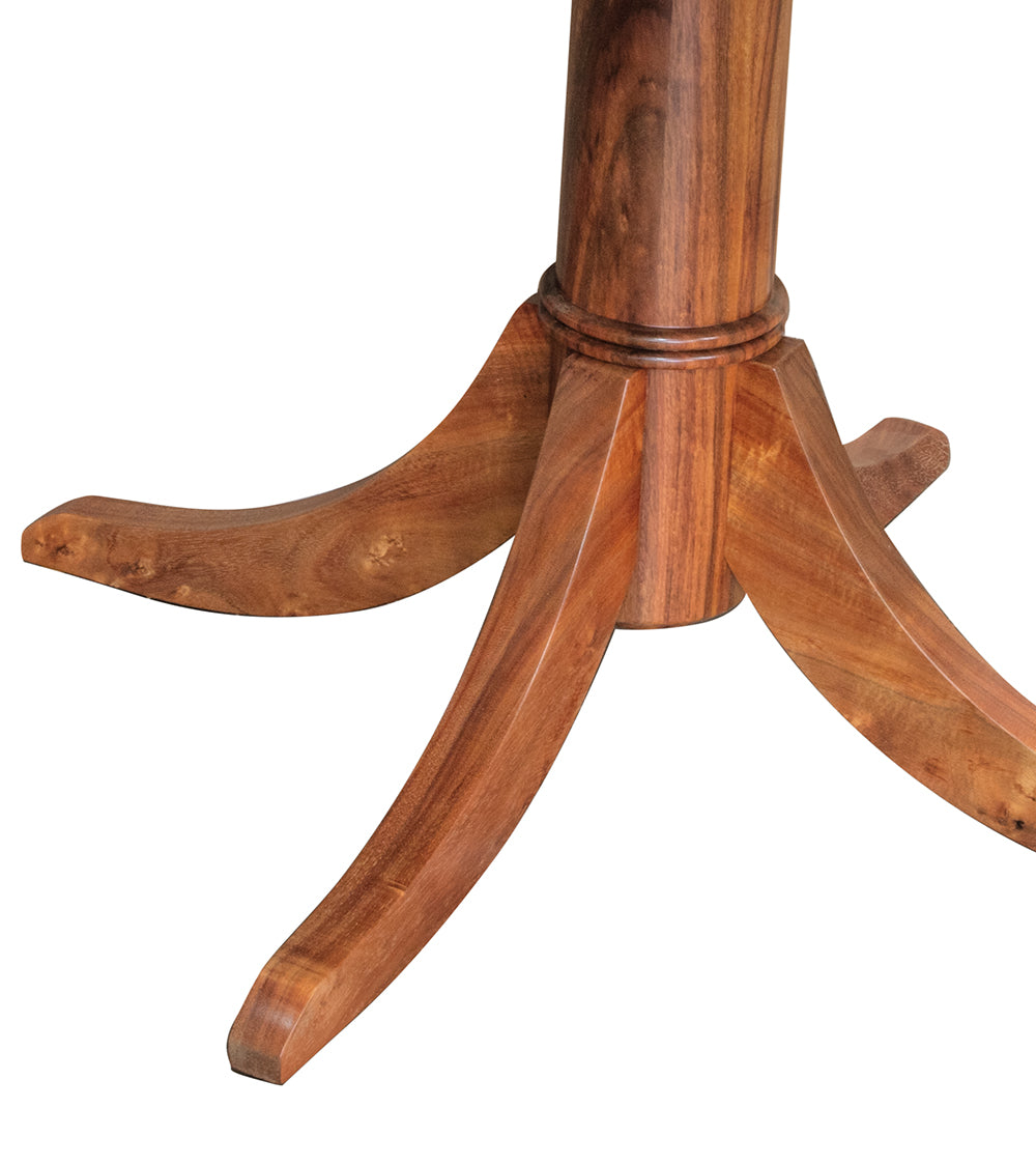 職人の技が光る、現代的な傾斜台座を備えた新しいコア材ダイニングテーブル。厳選されたカーリーコア材の深みのある、風に揺れる色合いが際立つようデザインされています。ハワイ産の上質なコア材を使った革新的なデザインです。
