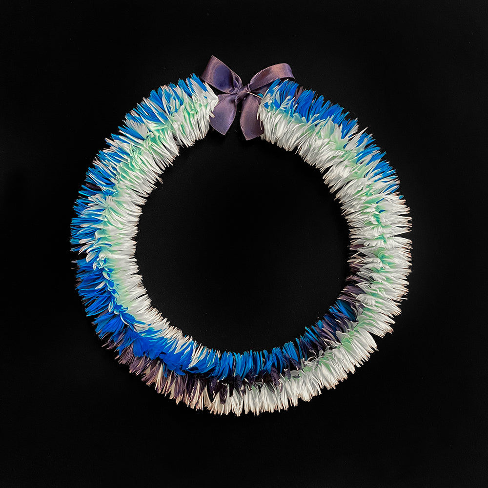 熟練のハワイアン・フェザーレイ・アーティスト、ボリス・ケカイウルイカヒキナ・フアンが、この素晴らしいハワイアン・フェザーレイを制作しました。彼は、故アンティ・メアリー・ルー・ケクエワという著名なフェザーレイ職人から受け継いだ、ハワイの伝統的な技法を用いて、一枚一枚のフェザーを丁寧に手作業で結び付けています。