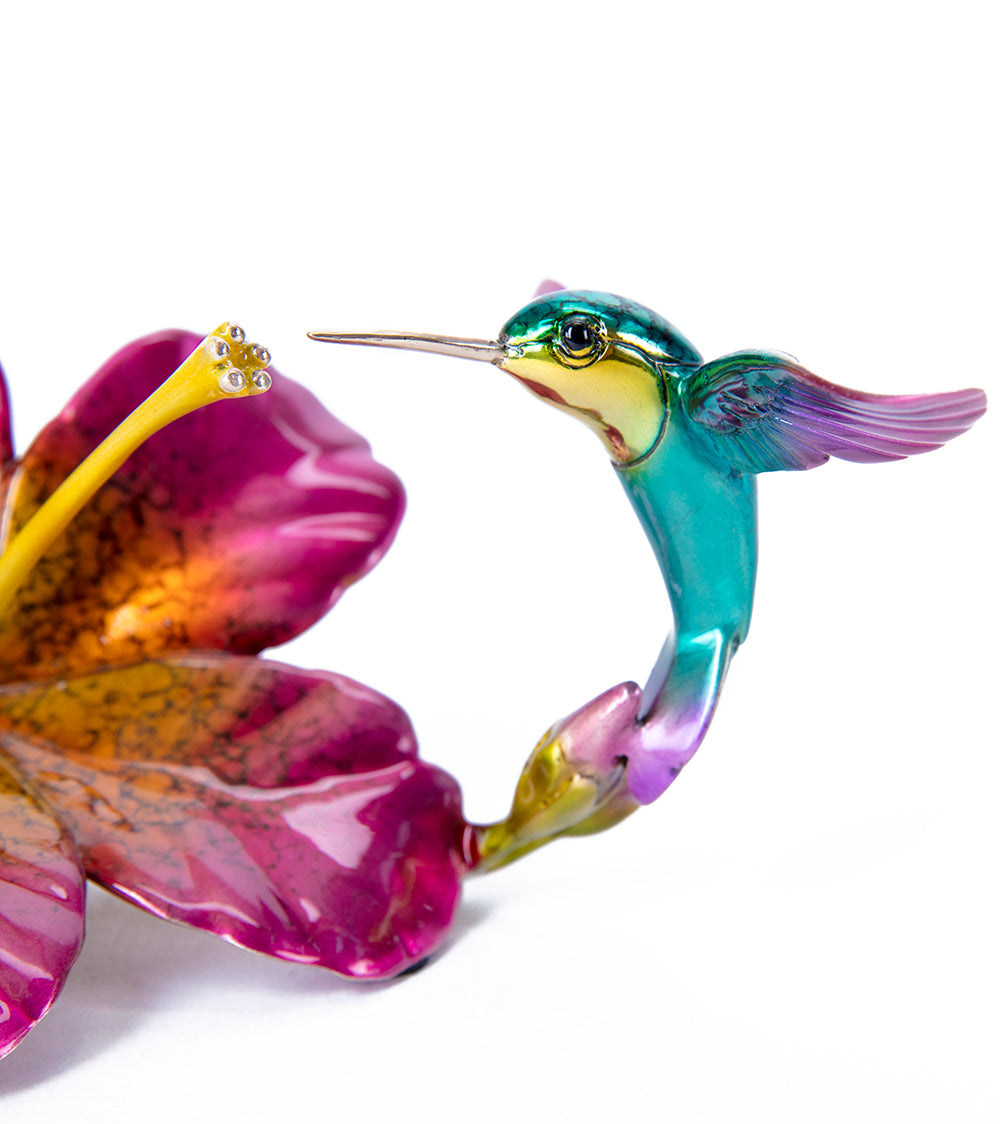 職人ホセ・ムニョスは、花に止まるハチドリの美しいブロンズ彫刻を制作しています。彼は、飛ぶ姿や細い枝に止まるハチドリの姿を巧みに捉えています。ブロンズ彫刻一つ一つに、鮮やかな緑青が施されています。