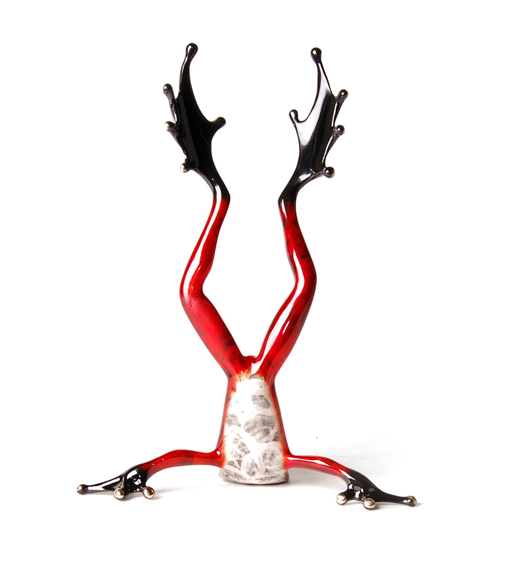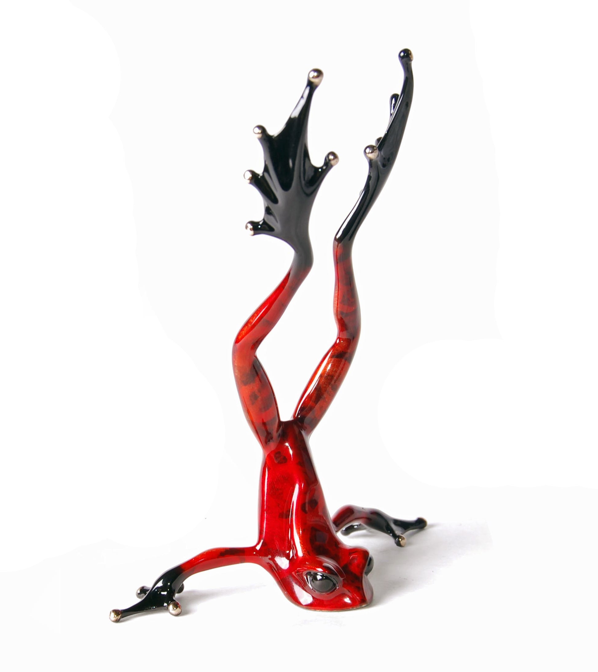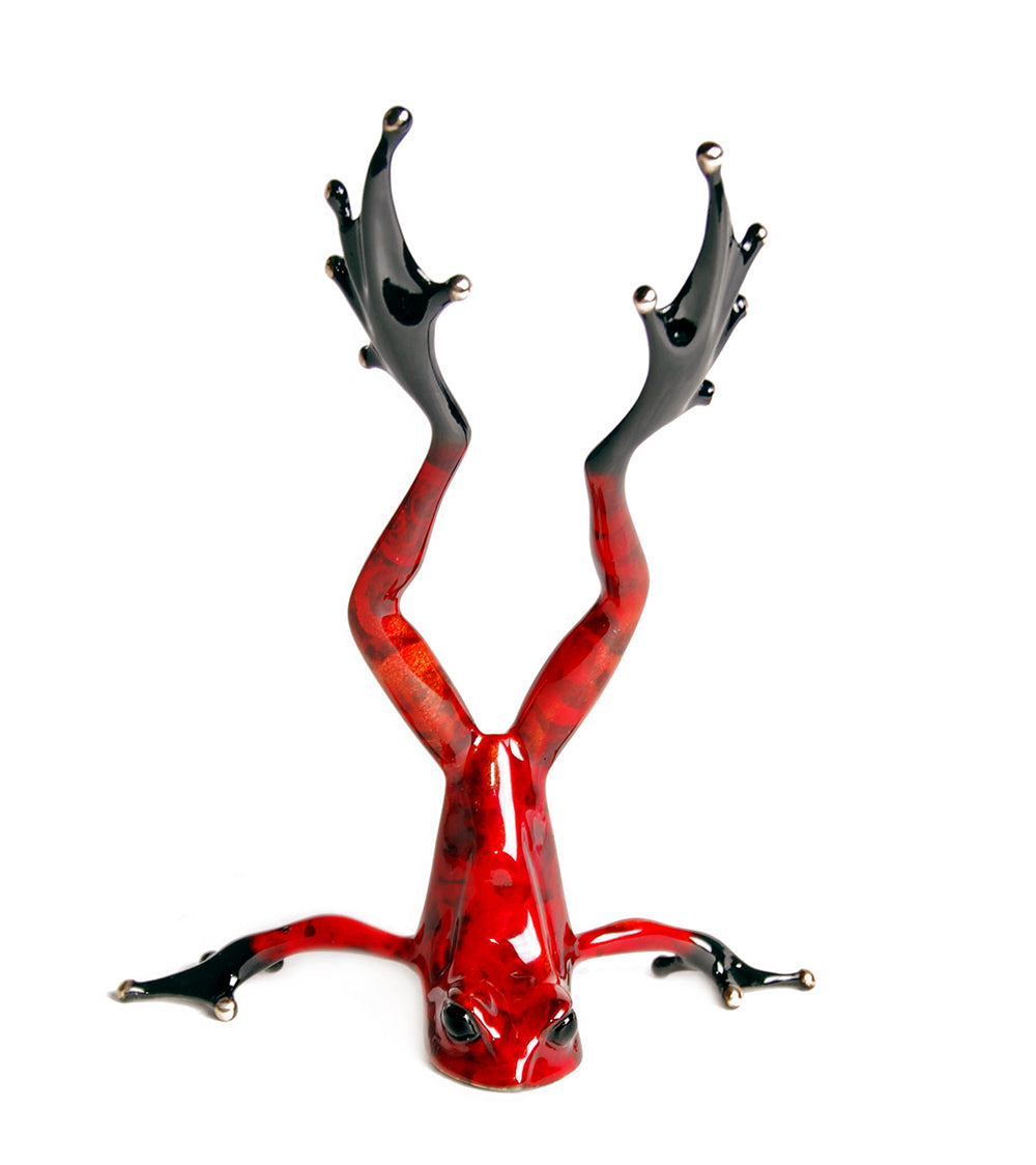 イギリスで育ったティム・コテリルは、カエル、イモリ、ヒキガエルを求めて緑豊かな田園地帯を歩き回っていました。1990年にカリフォルニア州ベニスに誘われ、そこでお気に入りの両生類のブロンズ像を作り始めました。彼は、人間と同じように、カエルにもそれぞれ個性と気質があると信じています。世界中にティムのコレクターがおり、彼らは様々な種類のカエルを集めています。アジア文化ではカエルは幸運の象徴とされており、実際、ティムのカエルを飼うと運気が上がると人々は言います。それぞれのカエルには、アーティスト自身による真贋証明書が付属しています。