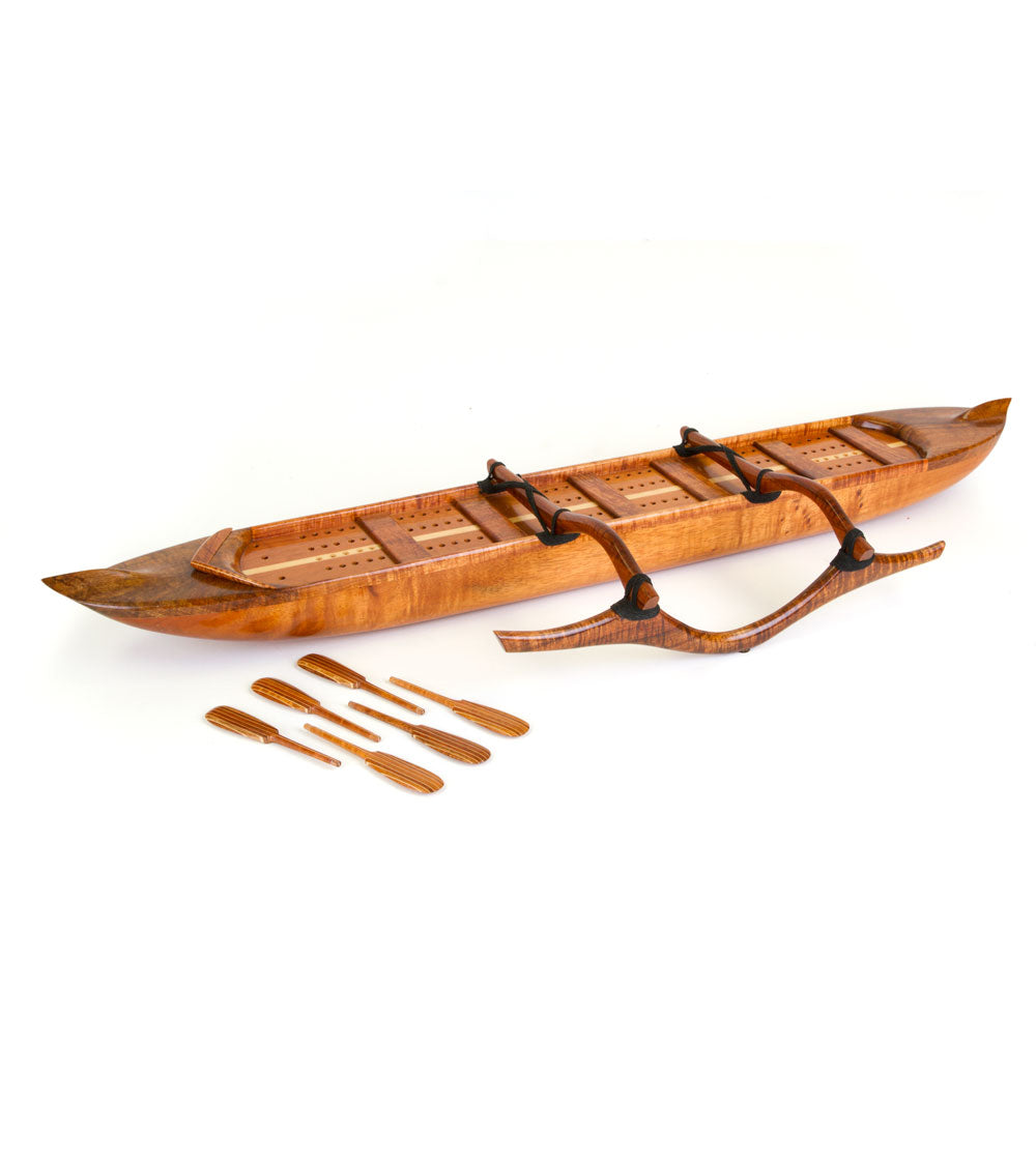ハワイの木工職人グレッグ・イーブスは、杢目の美しいカーリーコア材を用いて、美しいハワイアンカヌーのスケールモデルを製作しています。ペグにはコアメープル材のパドルを使用した、革新的なクリベッジカヌーセットも製作しました。グレッグのクリベッジカヌーにはそれぞれシリアルナンバーが付けられ、証明書が付属しています。