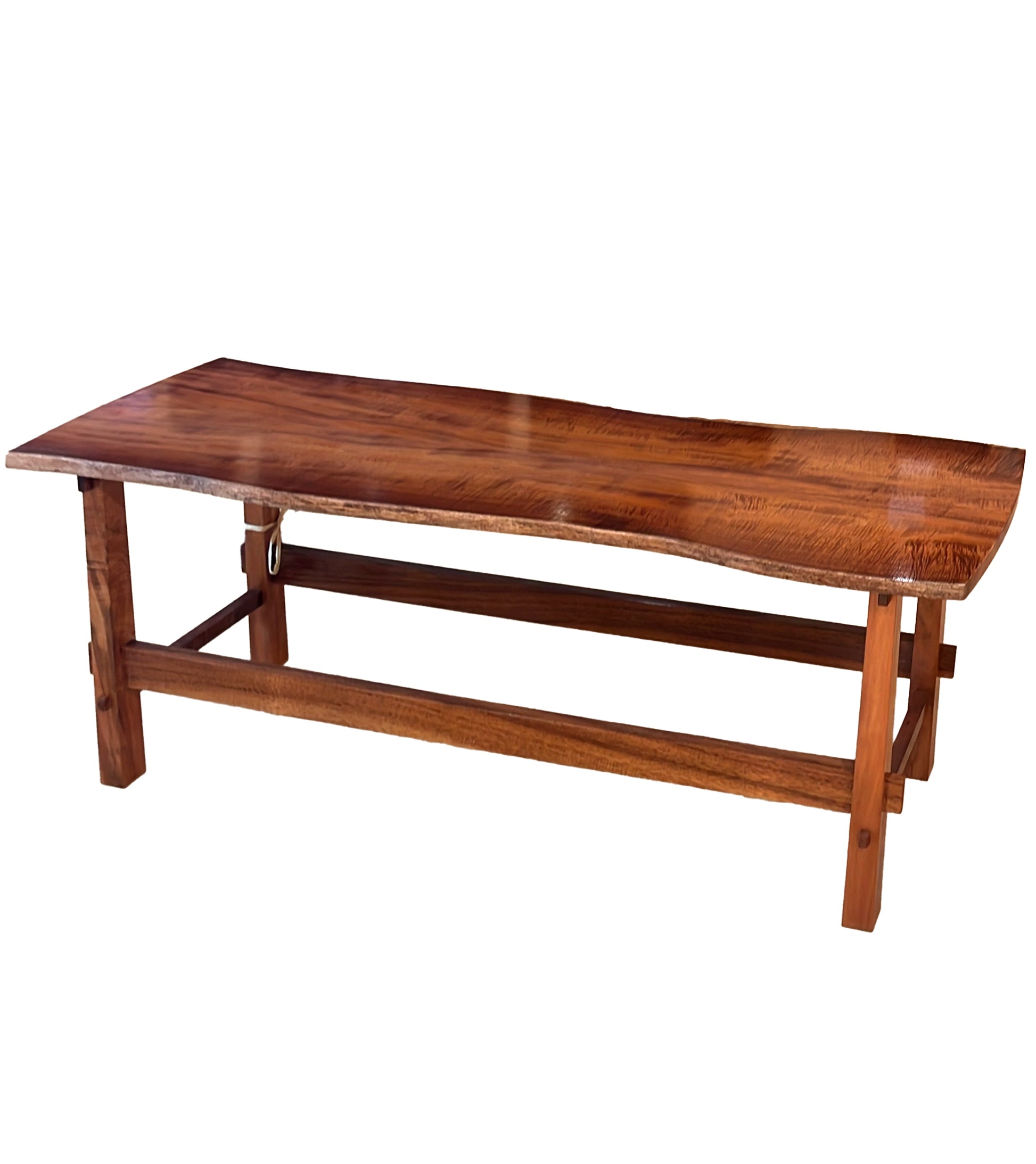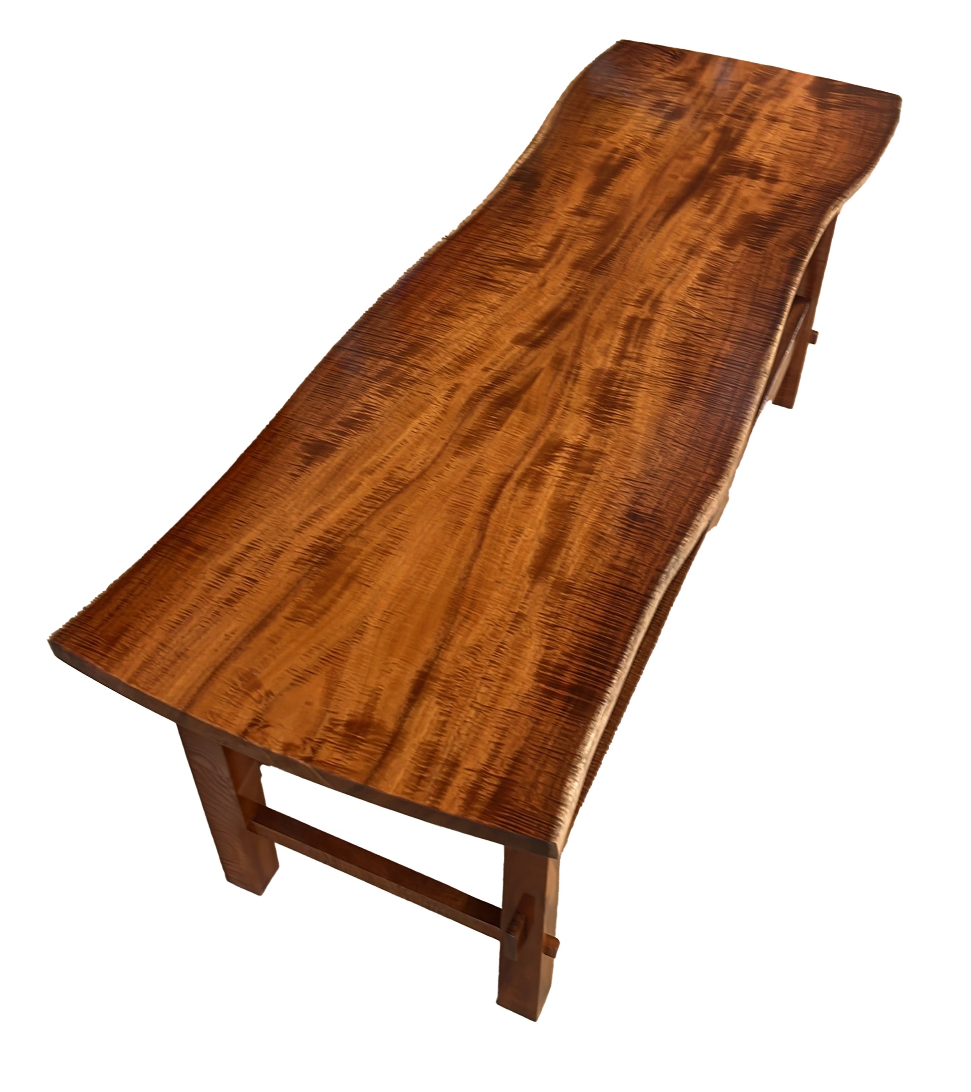 ビッグアイランドの熟練職人アレックス・フランチェスキーニが、ダークなカーリーコア材を使用して、美しく彫刻されたフリーフォームのコーヒーテーブルを製作しました。