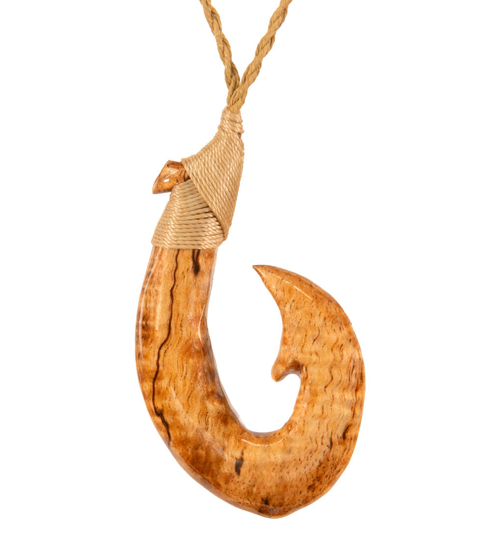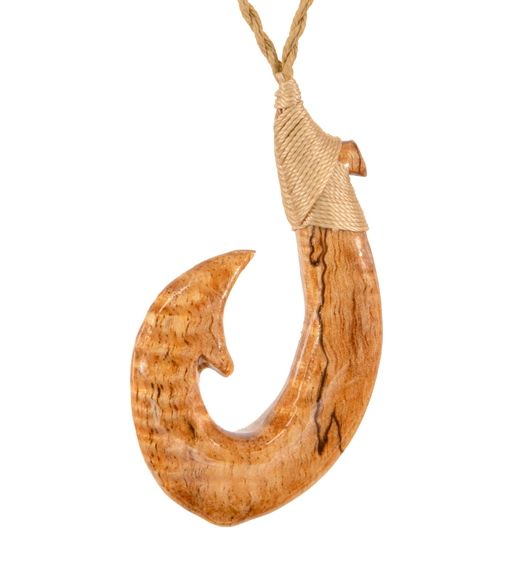 ハワイの職人デューイ・メデイロスは、カーリーコア、パドーク、パープルハートなどのハワイの堅い木材を使用して、見事な釣り針ペンダントを製作しています。