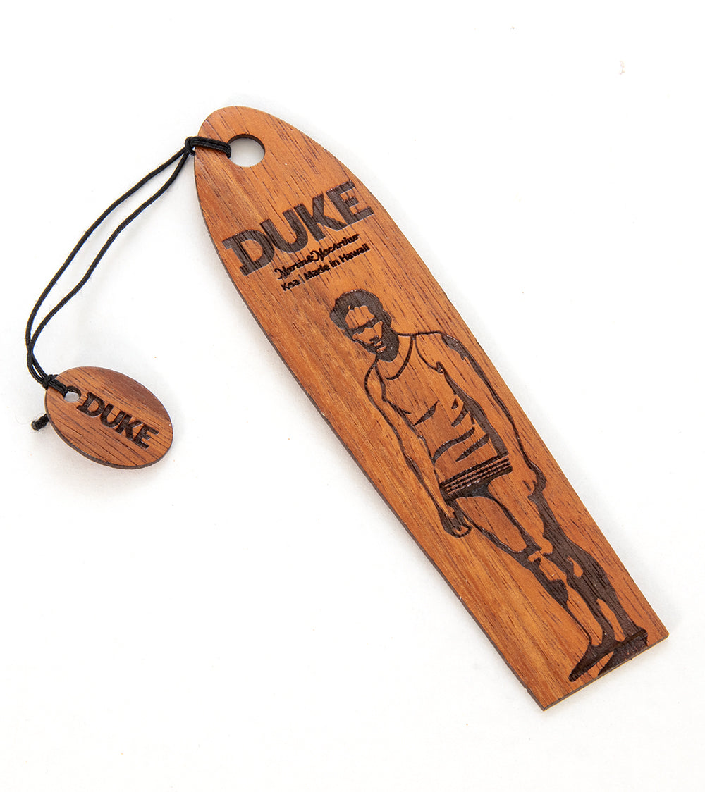 ハワイのマーティン&マッカーサー社の職人が、デューク・カハナモク(1890~1968年)の肖像をレーザー彫刻したコア材のブックマークを製作しています。ハワイ島のプランテーションで伐採されたコア材を厳選し、自社で保管しています。