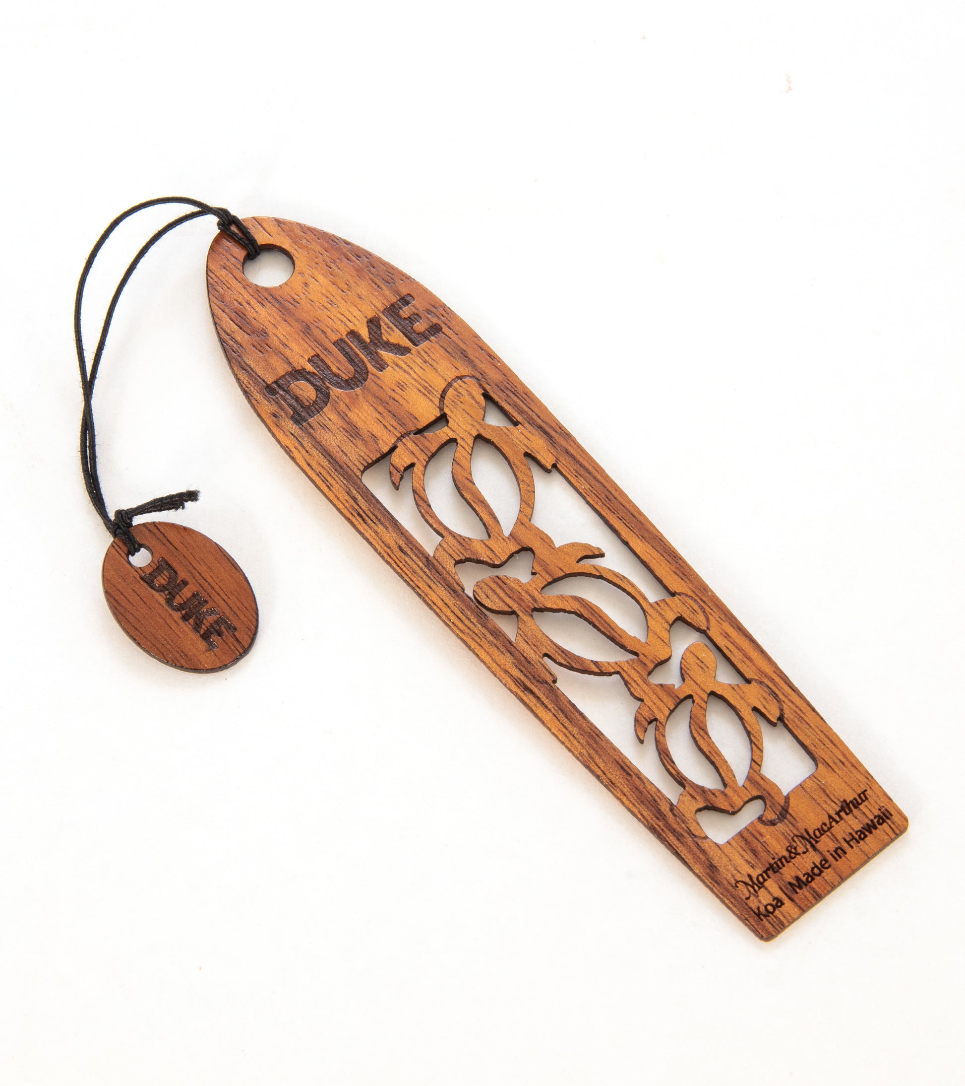 ハワイのマーティン&マッカーサー社の職人が、デューク・カハナモク(1890~1968年)の肖像をレーザー彫刻したコア材のブックマークを製作しています。ハワイ島のプランテーションで伐採されたコア材を厳選し、自社で保管しています。