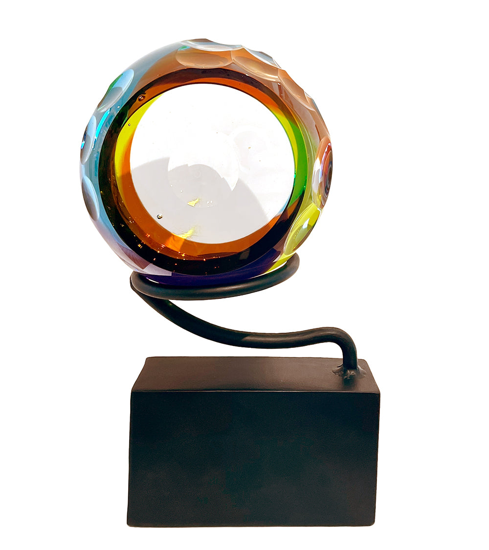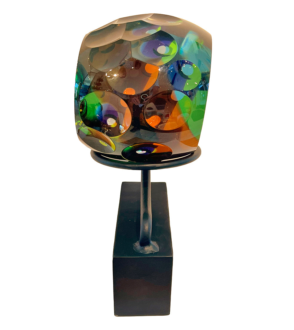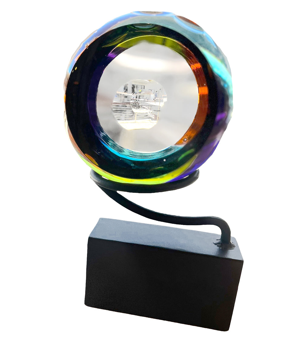 驚くべき光学的効果と色彩を持つ「Owl Eyes」は、単なるペーパーウェイトではありません。直径6インチのドーム型で、ファセットエッジと光学レンズを備えています。内側からの光反射の度合いによって見え方が変化する、優美なマルチカラーの透明感。