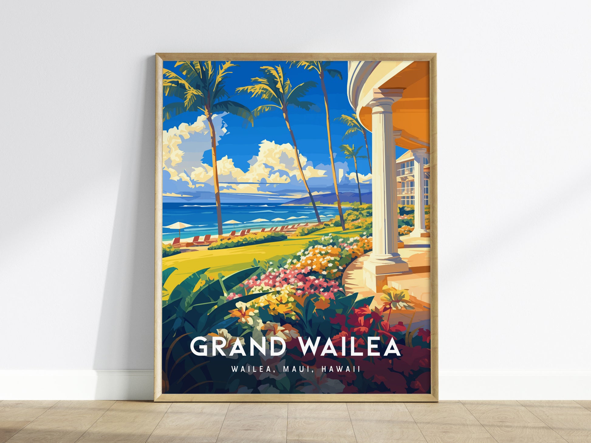グランド・ワイレア・ホテルの豪華さと絵のように美しい魅力を、美しく仕上げられたポスターで体感してください。この素晴らしいアートワークは、名高いホテルの緑豊かで細部まで手入れの行き届いた敷地から、ワイレアビーチの魅惑的な砂浜を望む景色を描いています。ハワイの穏やかなそよ風を思わせる、揺れるヤシの木々に囲まれたこの風景は、グランド・ワイレアが誇る贅沢で穏やかな雰囲気を凝縮しています。旅の繊細なディテールやトロピカルな風景を愛する人にぴったりのこのポスターは、マウイ島の最高級リゾートライフをご自宅やオフィスにお届けします。