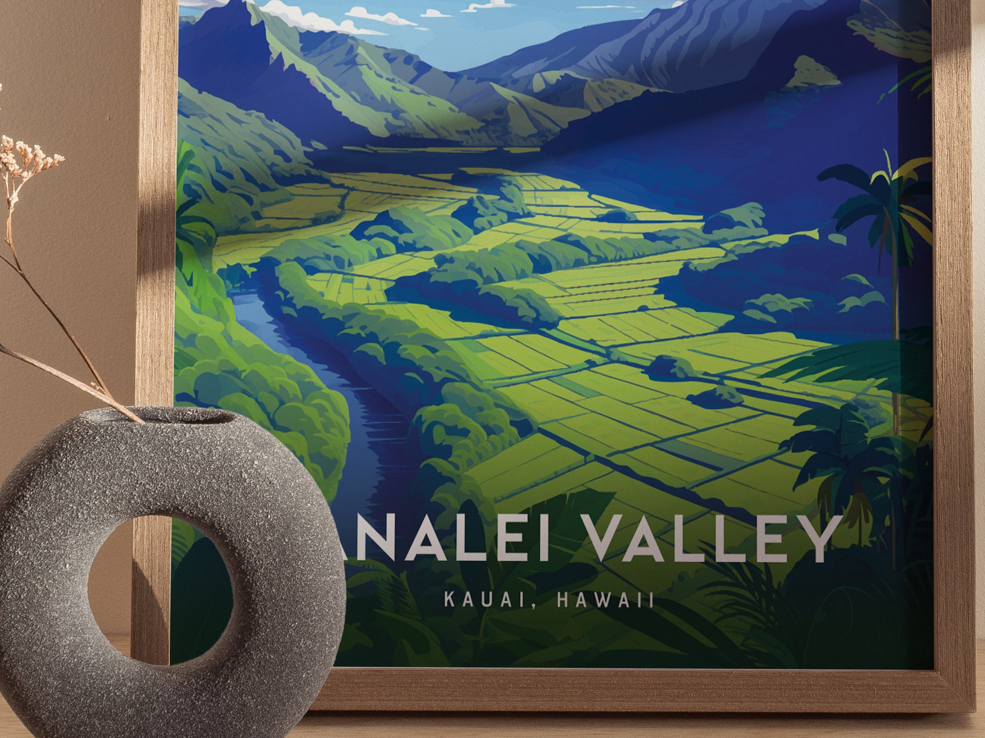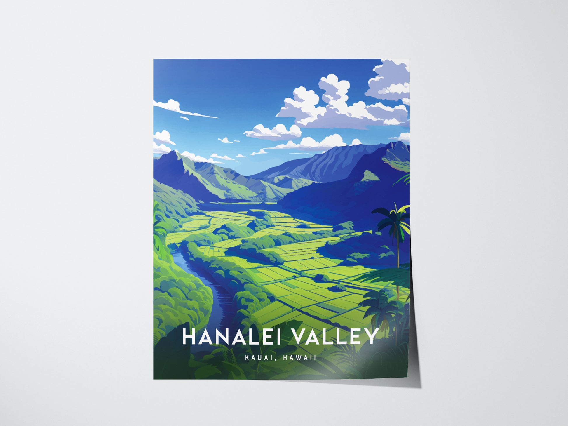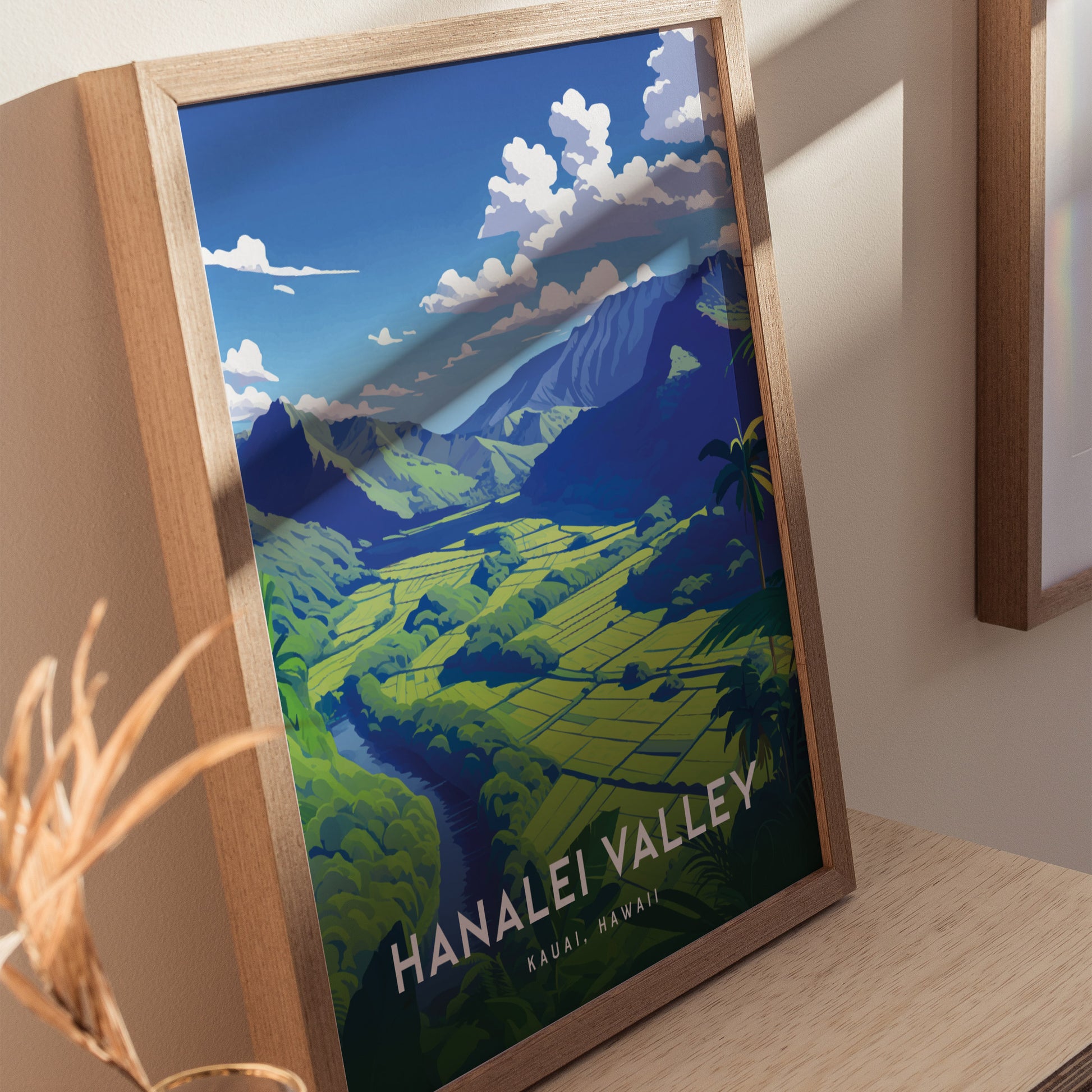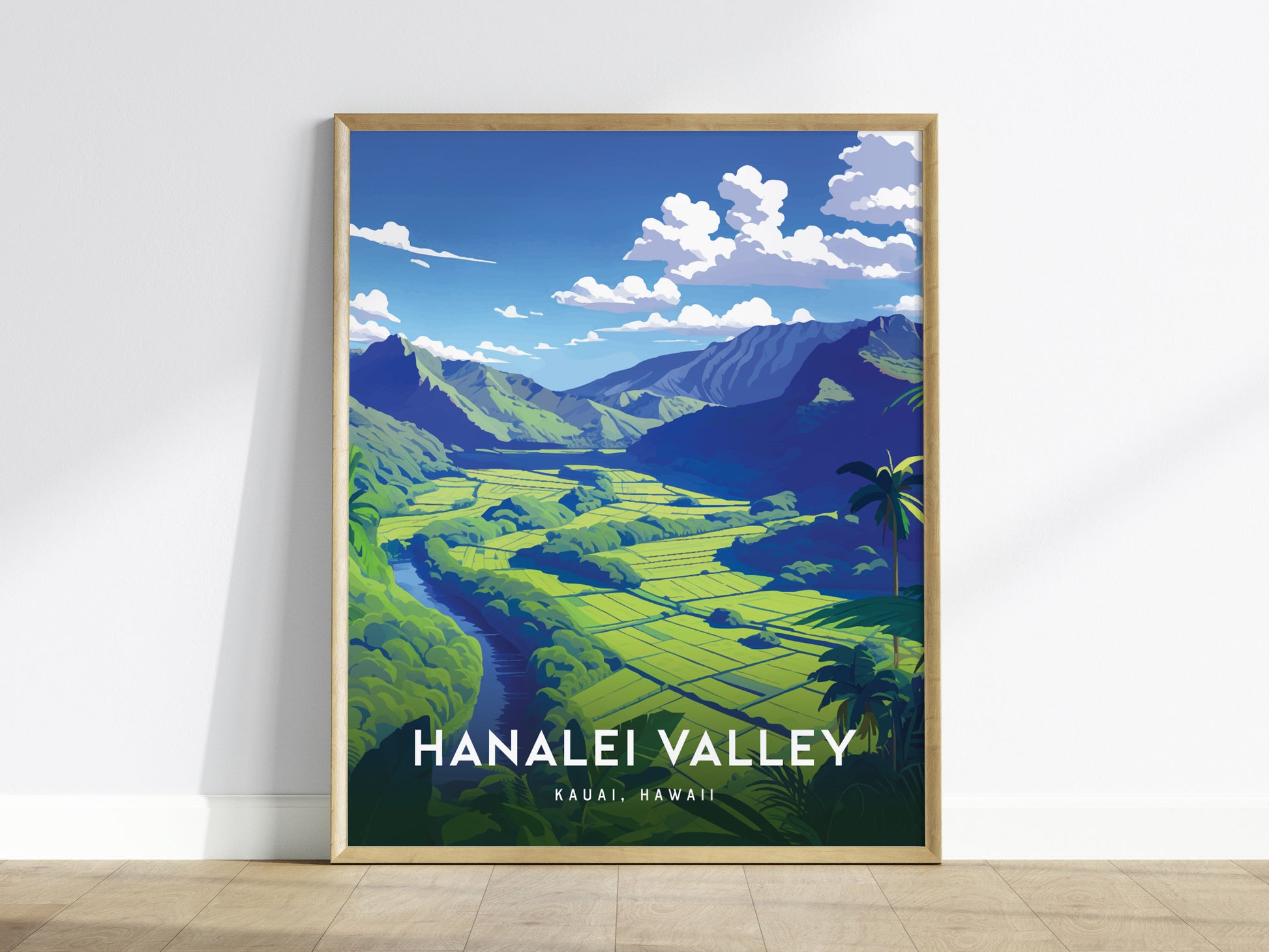 ハナレイ渓谷のポスター – 緑豊かなタロイモ畑とハワイの山々をアートで表現