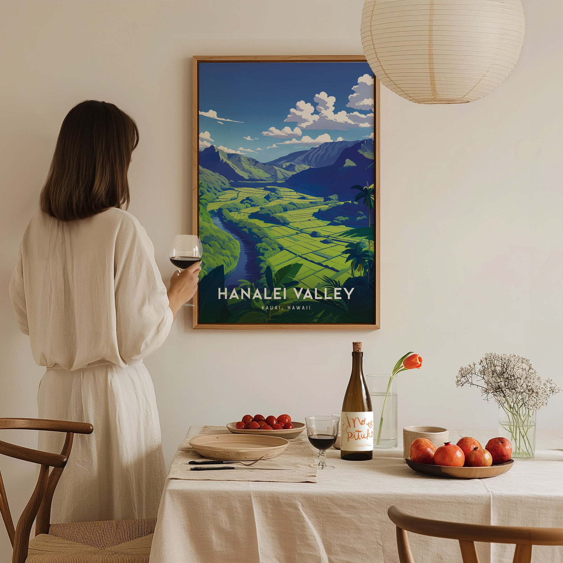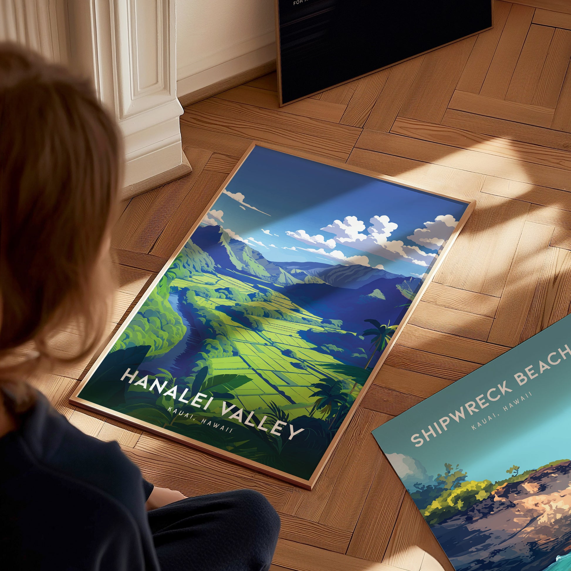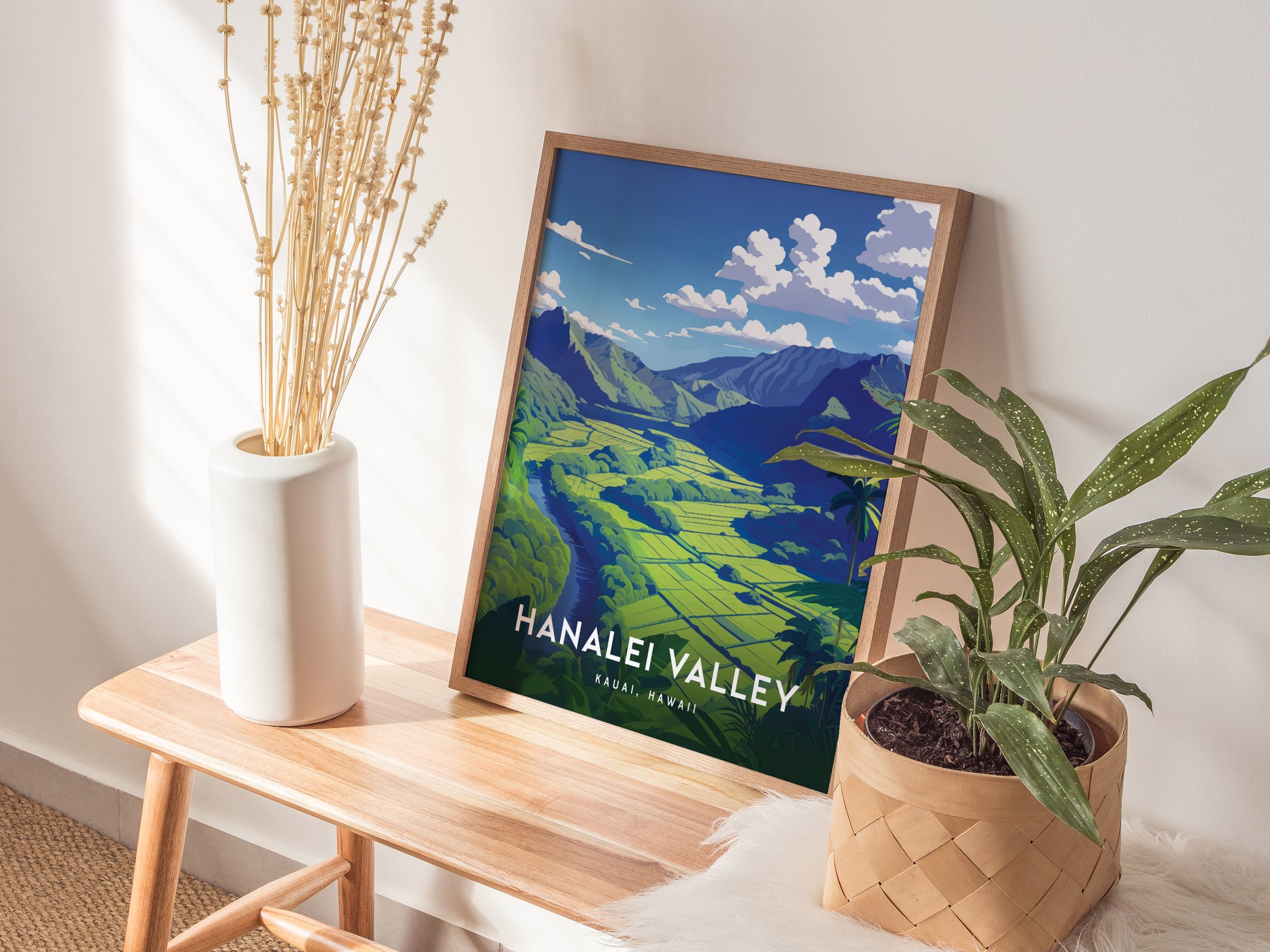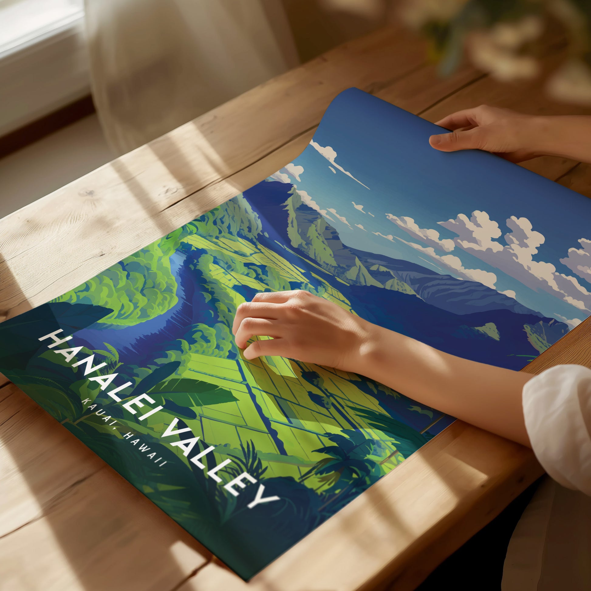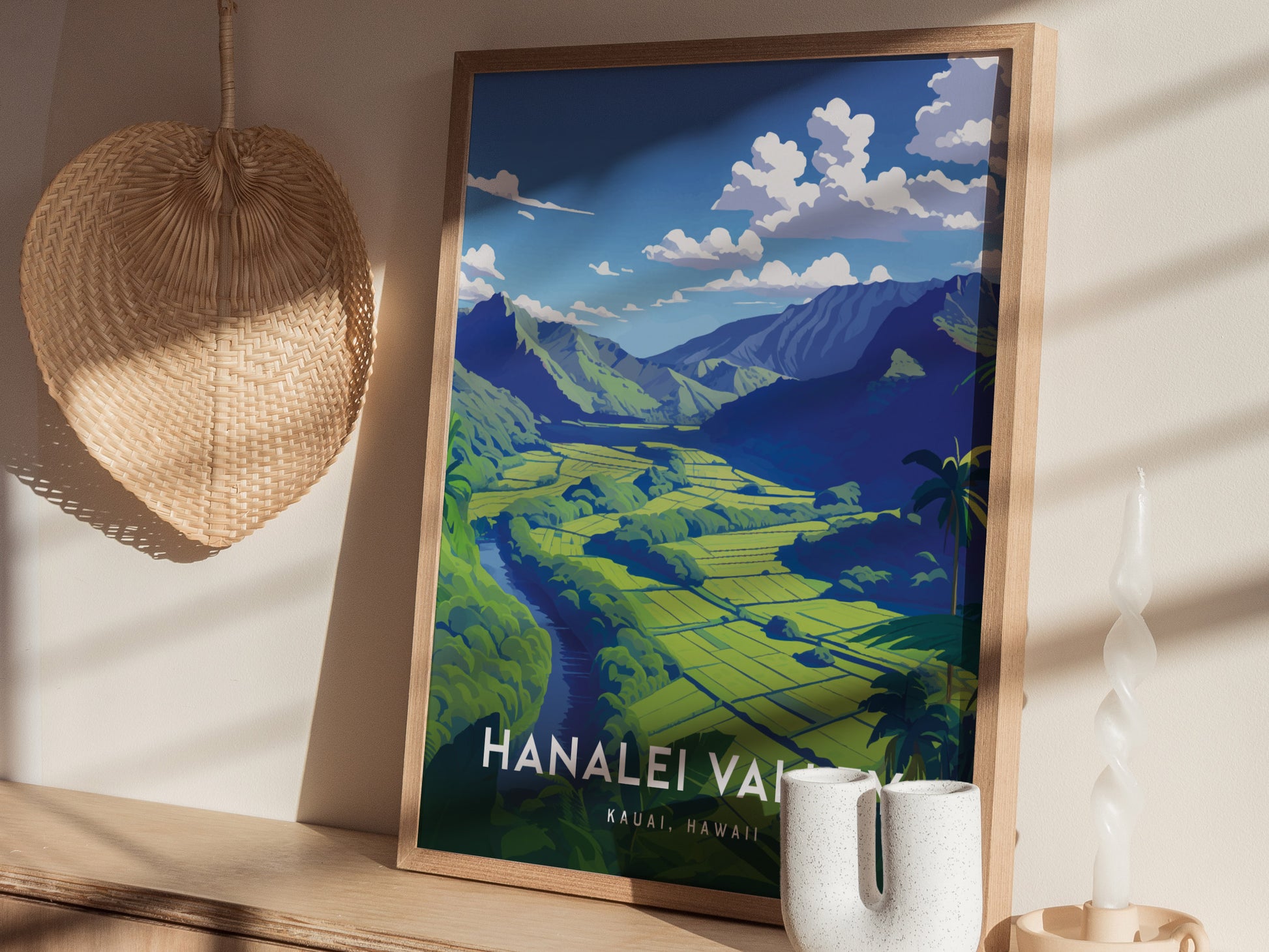 ハナレイ渓谷のポスター – 緑豊かなタロイモ畑とハワイの山々をアートで表現