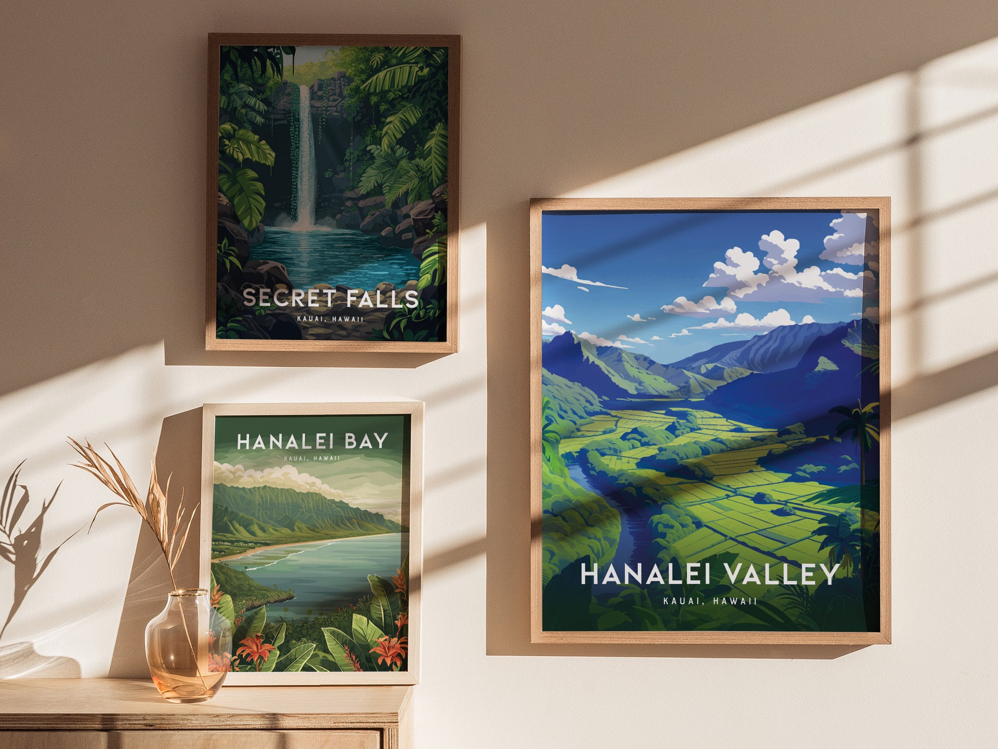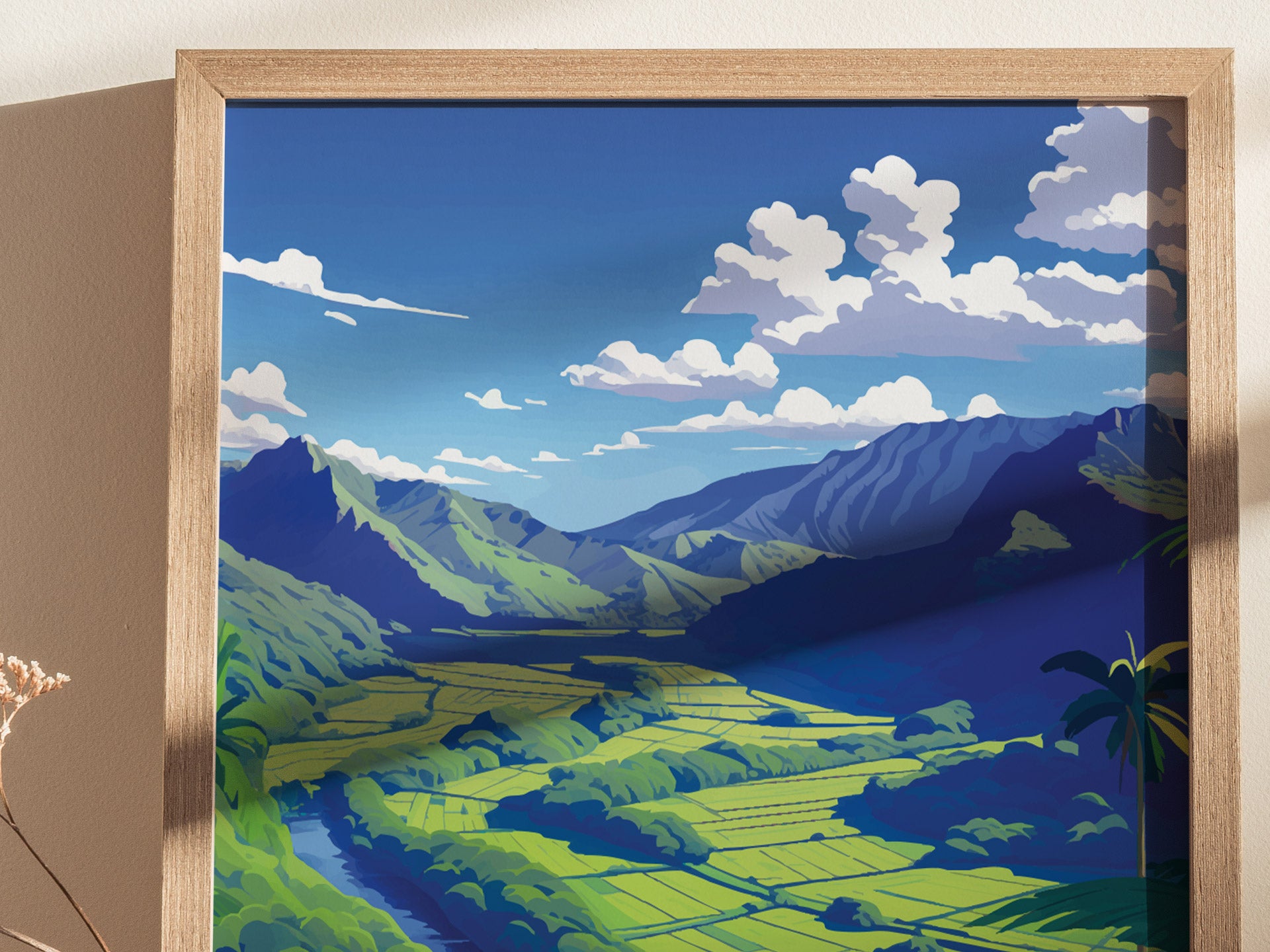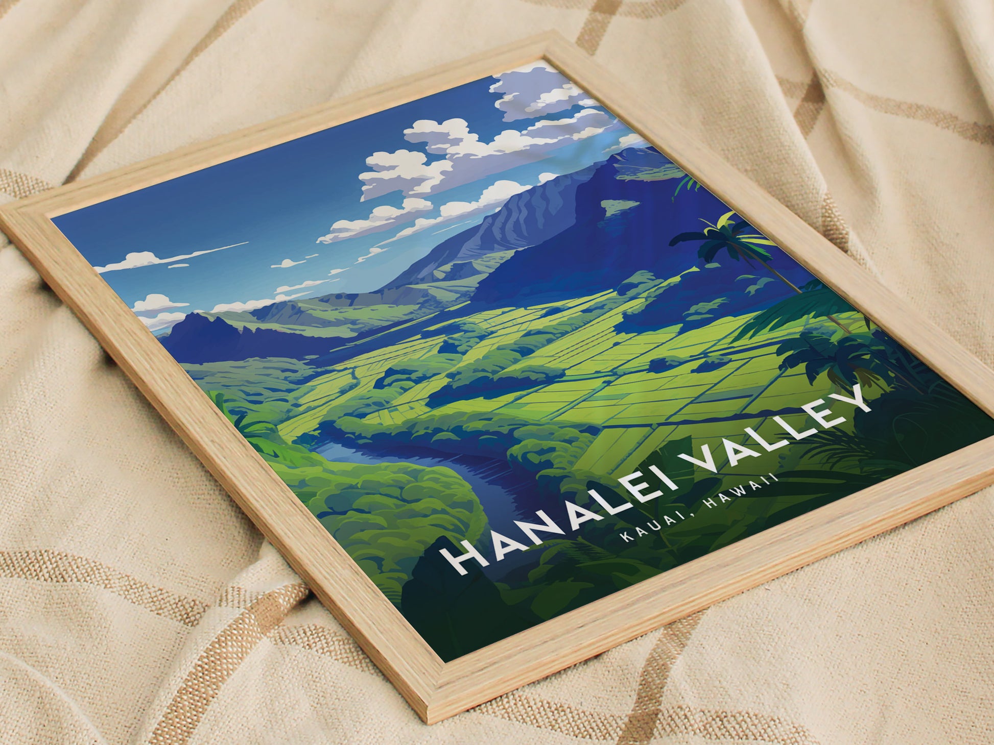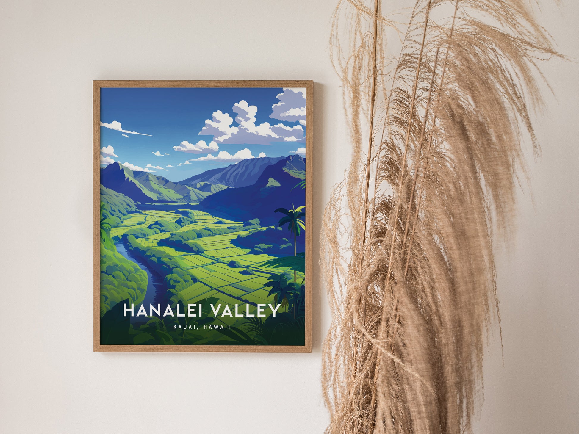 カウアイ島ノースショアの中心部、ハナレイ渓谷を鮮やかに描いたこのイラストをぜひご覧ください。エメラルドグリーンのタロイモ畑からワイオリ渓谷を取り囲む稜線まで、息を呑むようなこの風景は、ハワイを象徴する景観の一つであるハナレイ渓谷の静かなリズムと自然の調和を捉えています。霧のかかった山々と曲がりくねったハナレイ川に囲まれたこのアートプリントは、ハワイの文化と歴史に深く根ざしたこの地の、時代を超えた美しさを称えています。