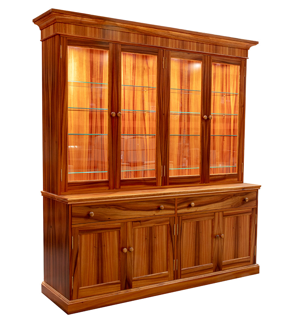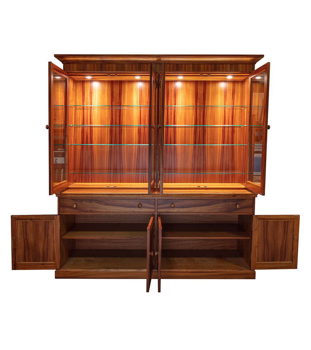 コア材を使用したヘリテージ・チャイナ・ハッチは、クラシックなデザインで、高級陶磁器やサーブウェアのディスプレイに最適です。3段のガラス製ディスプレイ棚は高さ調節が可能で、どんなお宝も飾ることができます。内部のハロゲンライトは、扉のヒンジに触れるだけで魔法のように点灯・消灯します。この素敵なディスプレイケースのスタイルを崩すような、邪魔なオンオフスイッチはありません。下部の引き出しは収納力をさらに高めます。ハワイ州ホノルルにあるMartin & MacArthurの家具工房で、熟練の職人によって丁寧に作られています。