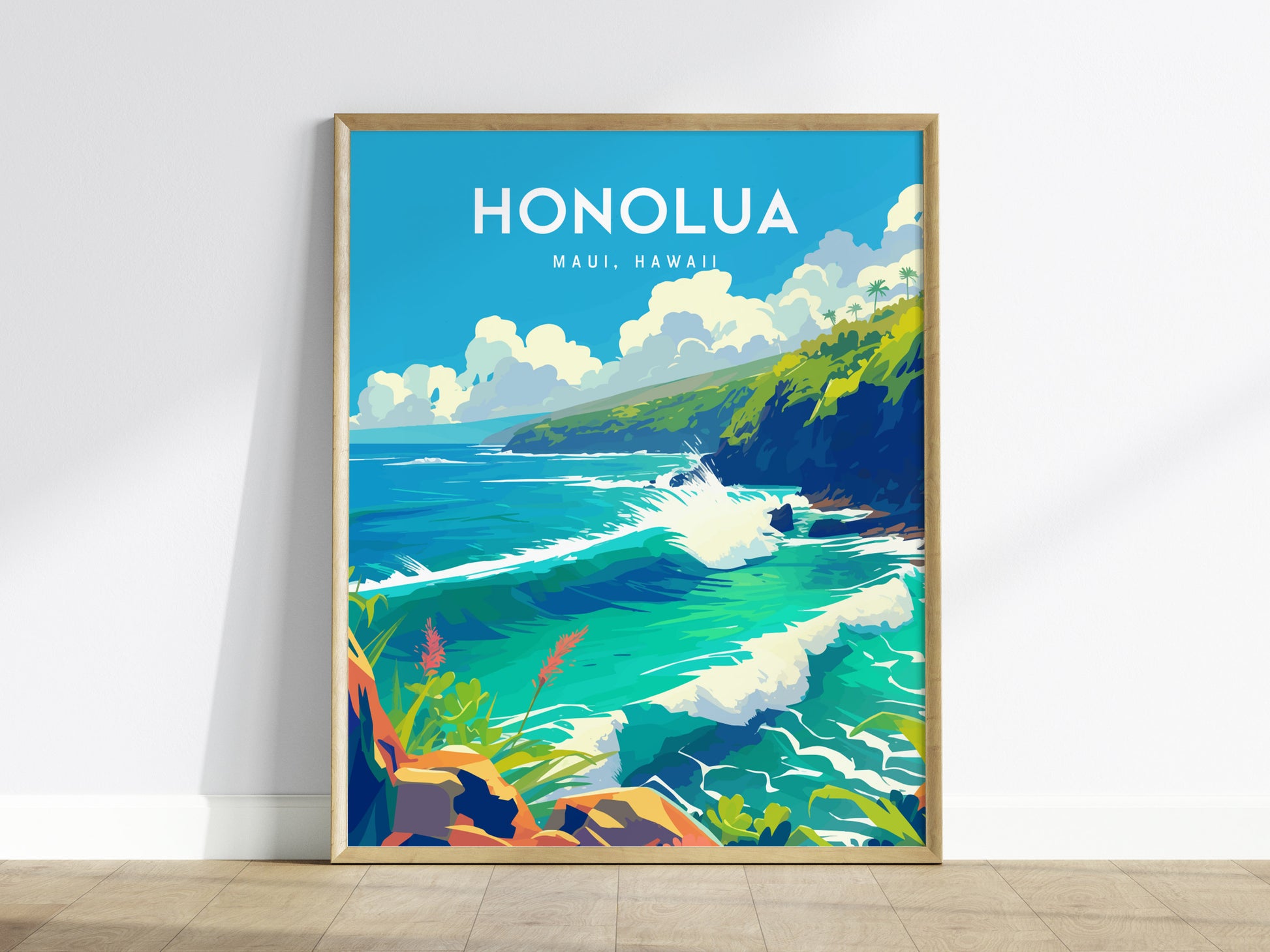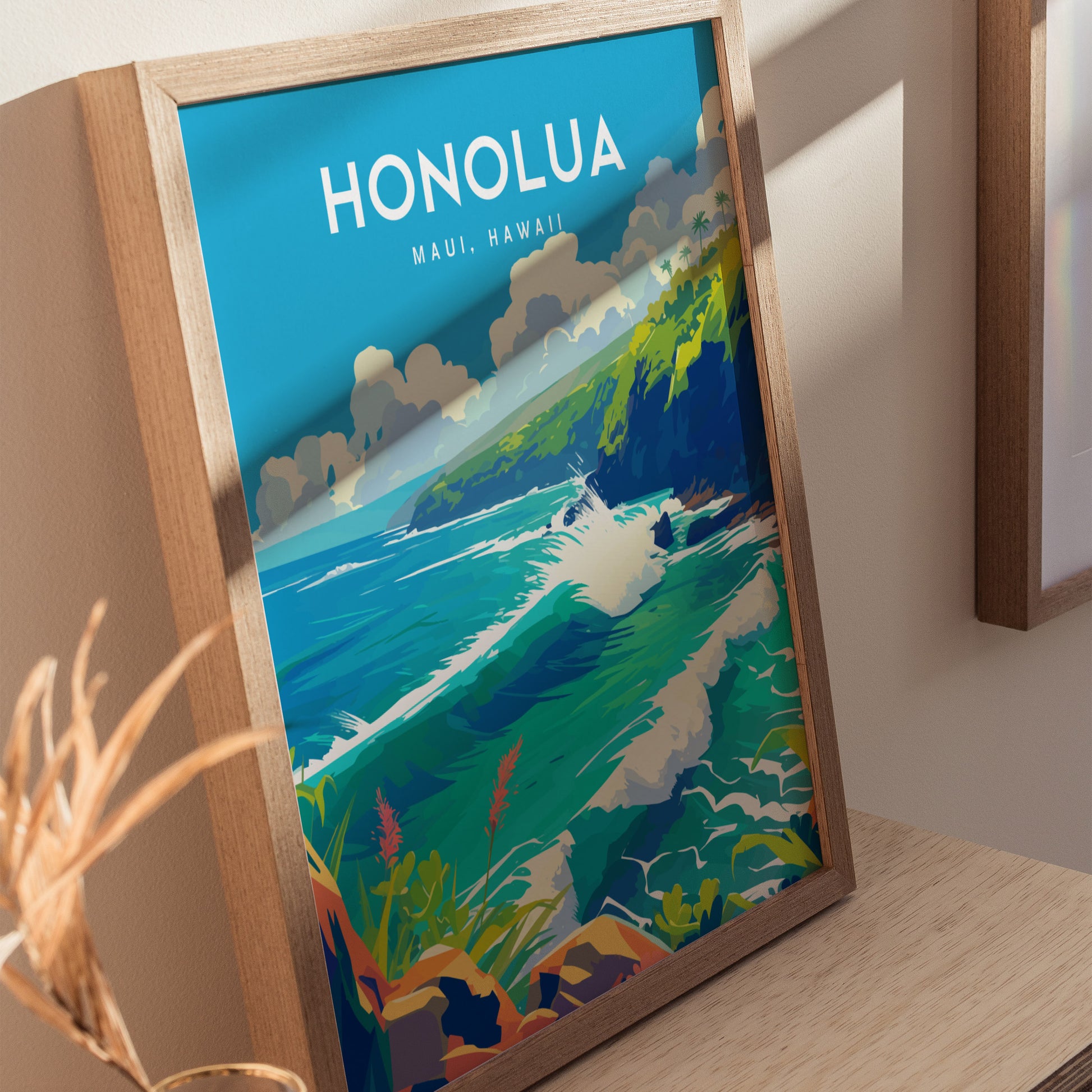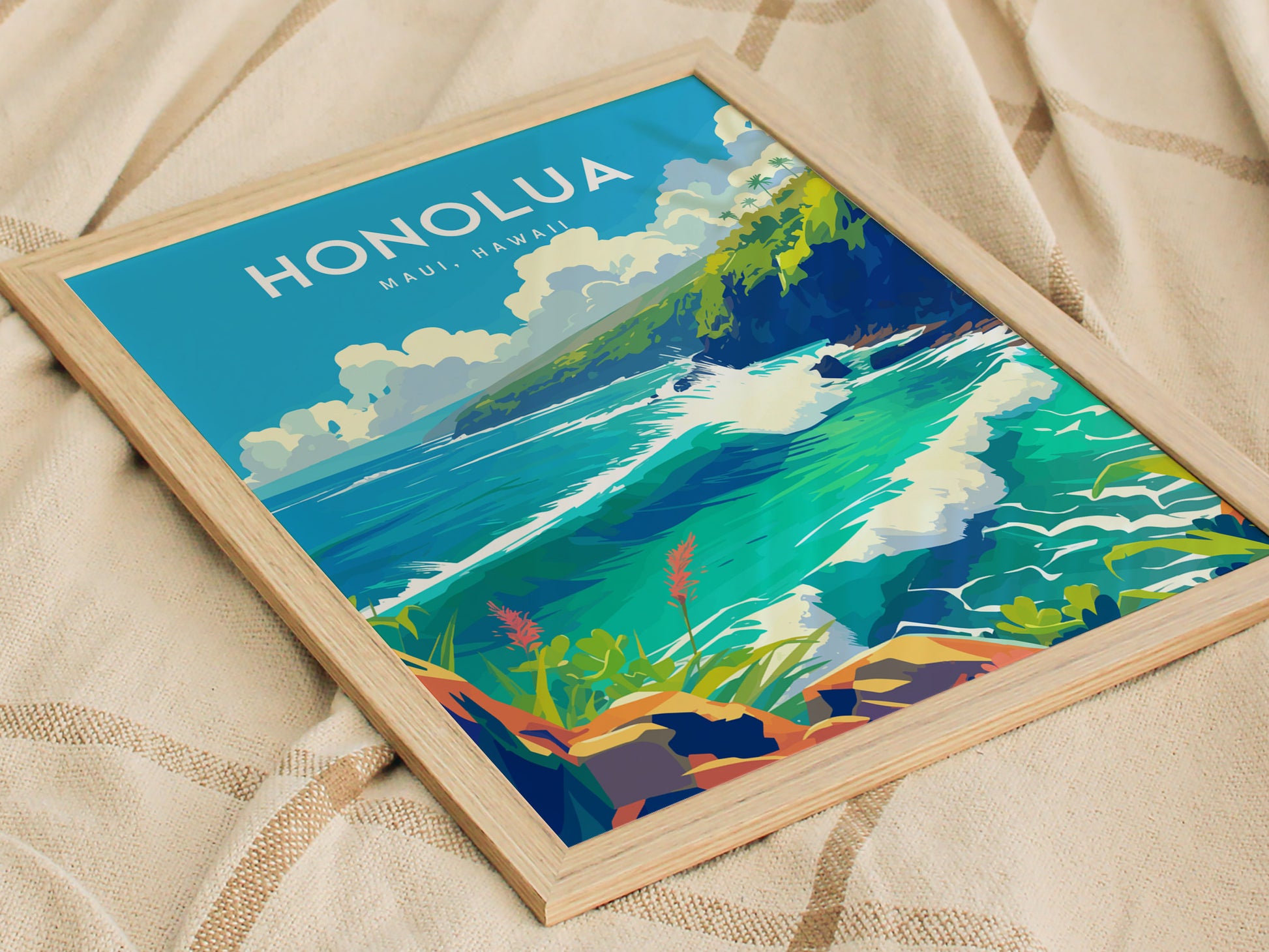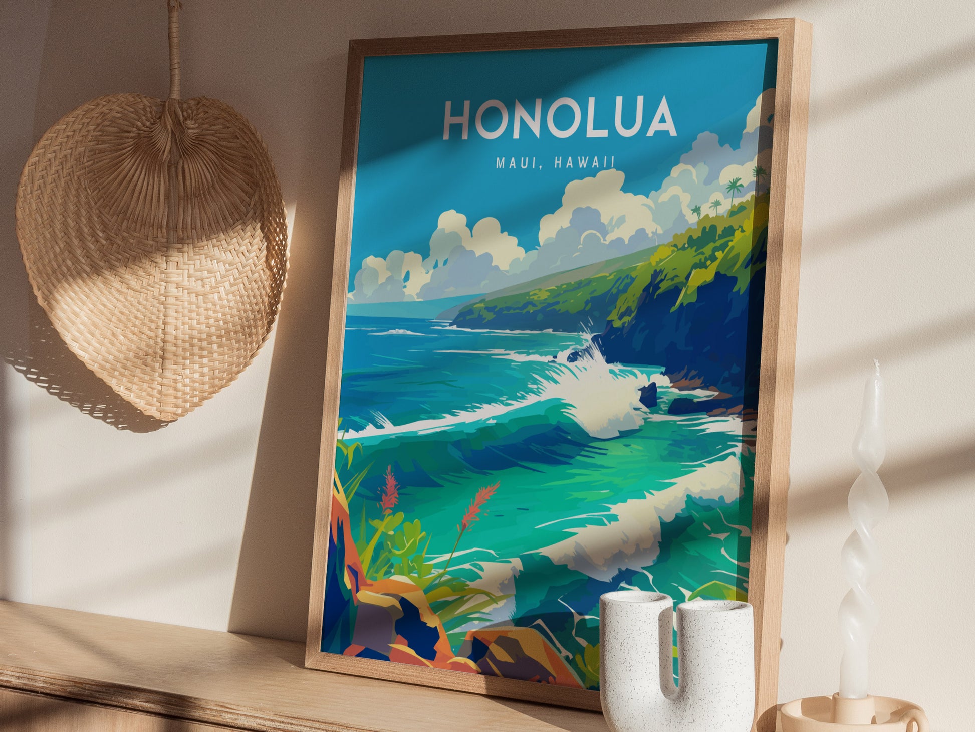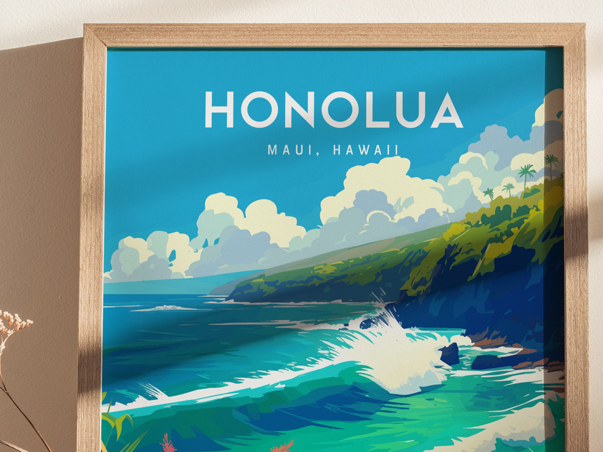「ホノルア、マウイ島、ハワイ」のポスターは、この海の楽園の真髄を美しく表現しています。過去の海の冒険を思い起こしたり、将来の訪れを夢見たり、あるいはマウイ島の海の美しさを日々の生活に取り入れたりするきっかけとなるでしょう。海の呼び声を感じるすべての人にとって、このポスターはホノルア湾がもたらす独特で魅惑的な美しさを称えるものです。