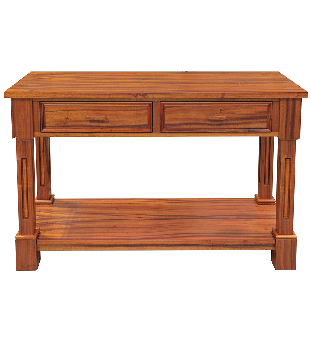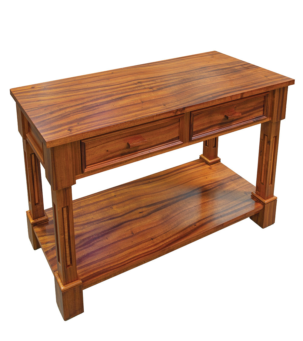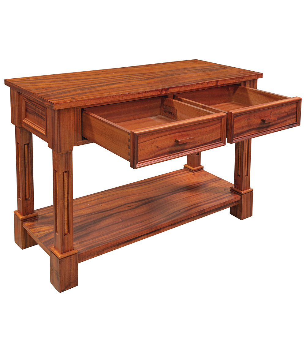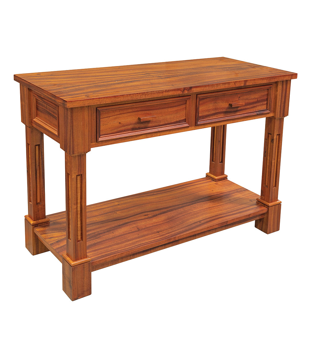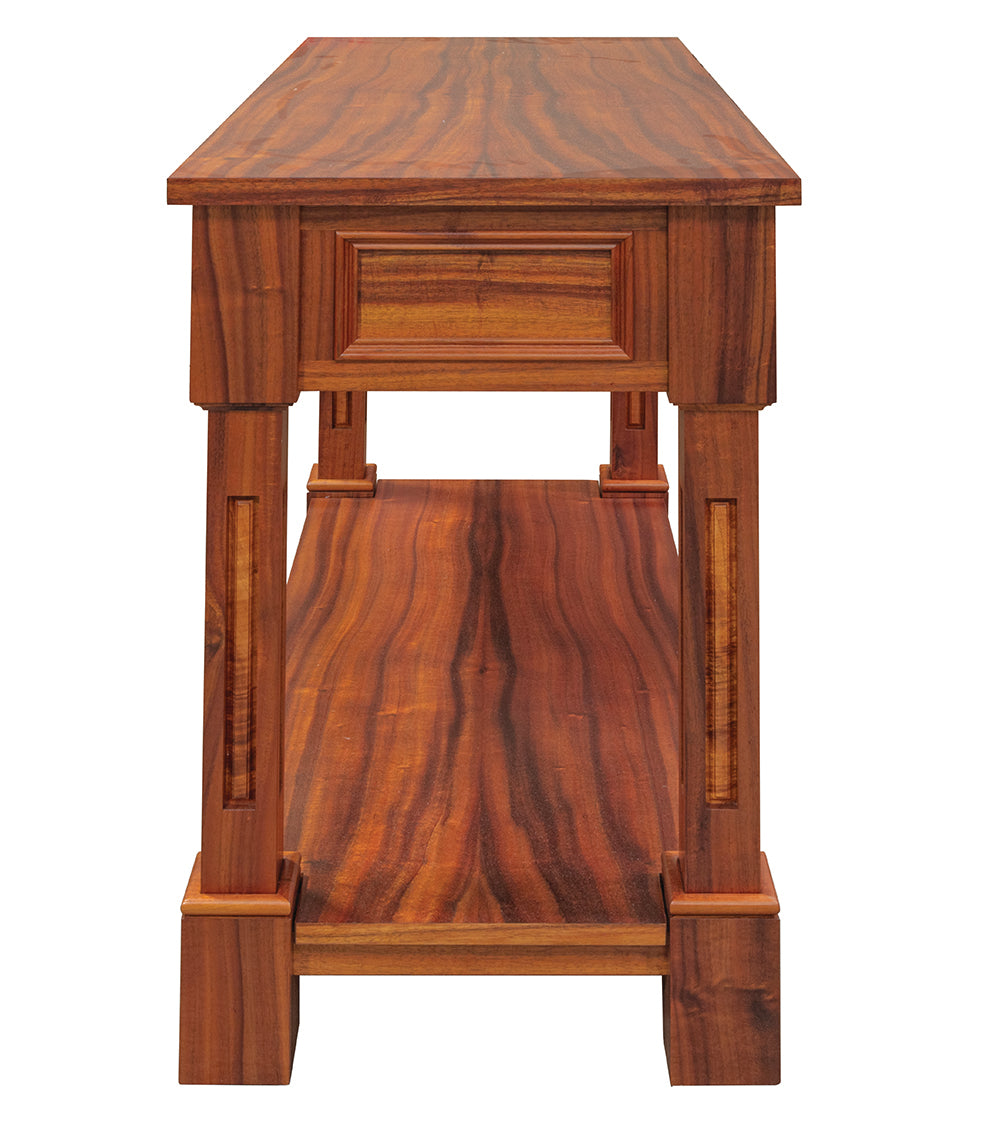 エレガントなカンパラサイドボードは、2つの引き出しとクラシックな脚を備えたオープンスタイルです。下には棚があり、大きなものを置くのに最適です。引き出しは自動的に静かに閉まり、楽に動きます。ハワイ島で伐採されたコア材を使用し、ホノルル(ハワイ州)のMartin & MacArthur社の熟練した職人によって丁寧に仕上げられています。