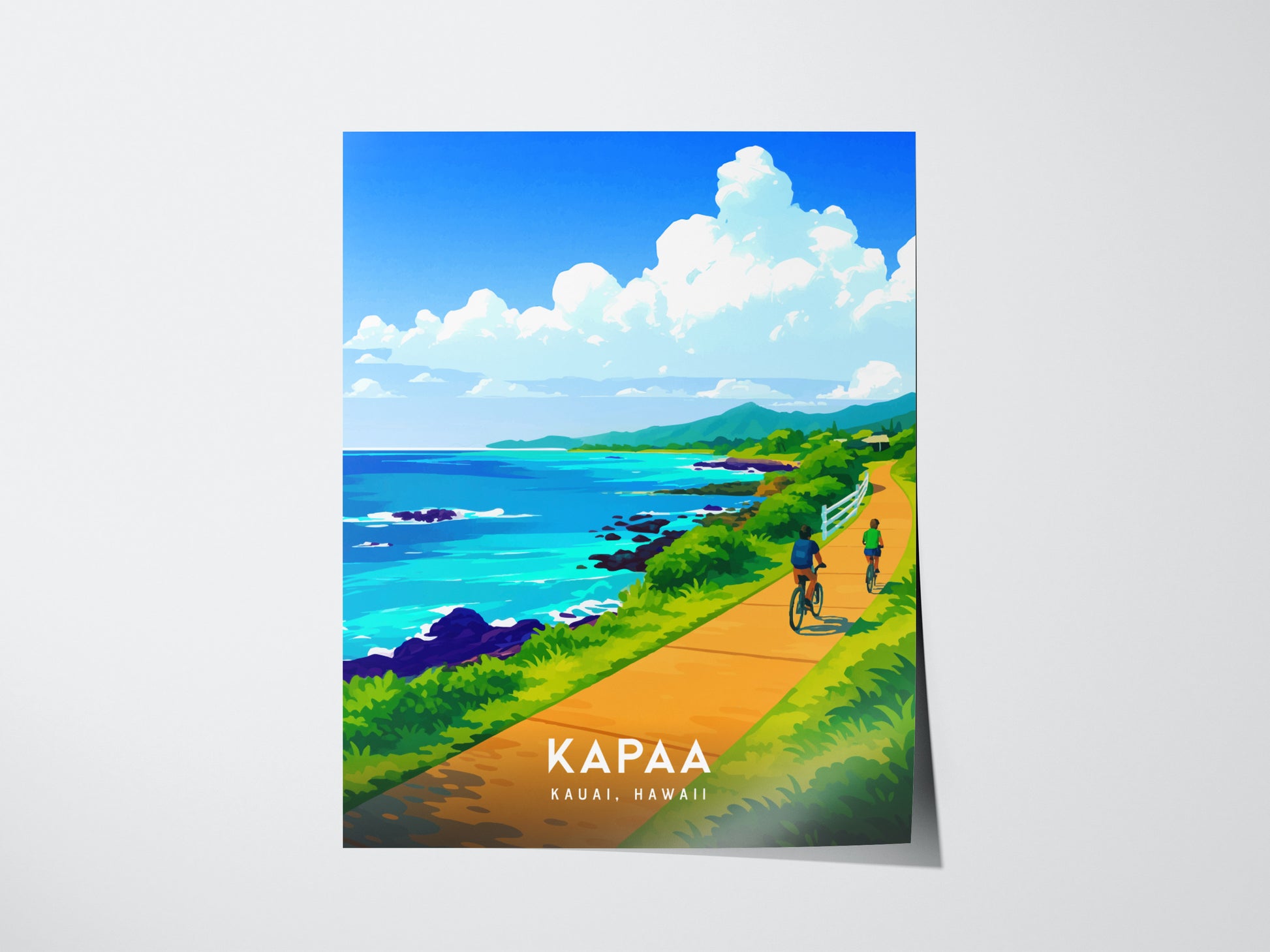 実際に自転車でこの道を走ったことがある人も、カパアで休暇を過ごした人も、あるいはただ海辺の晴れた日々を夢見ている人も、このプリントは大切な思い出となるでしょう。サイクリスト、海を愛する人、そしてハワイのガーデン・アイルのゆったりとした雰囲気を大切にする人への、心のこもった贈り物にもなります。