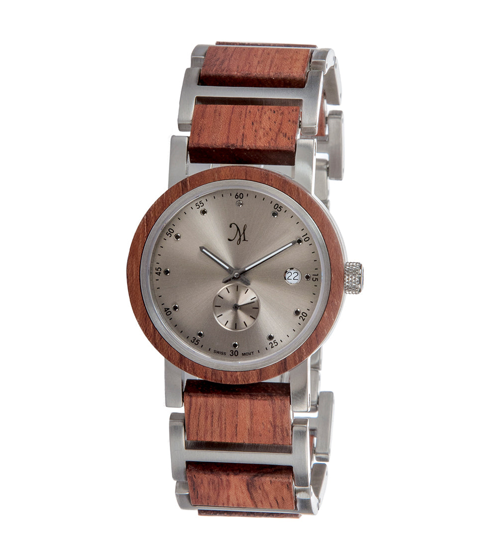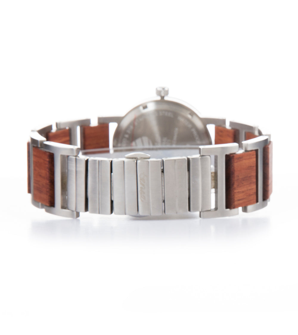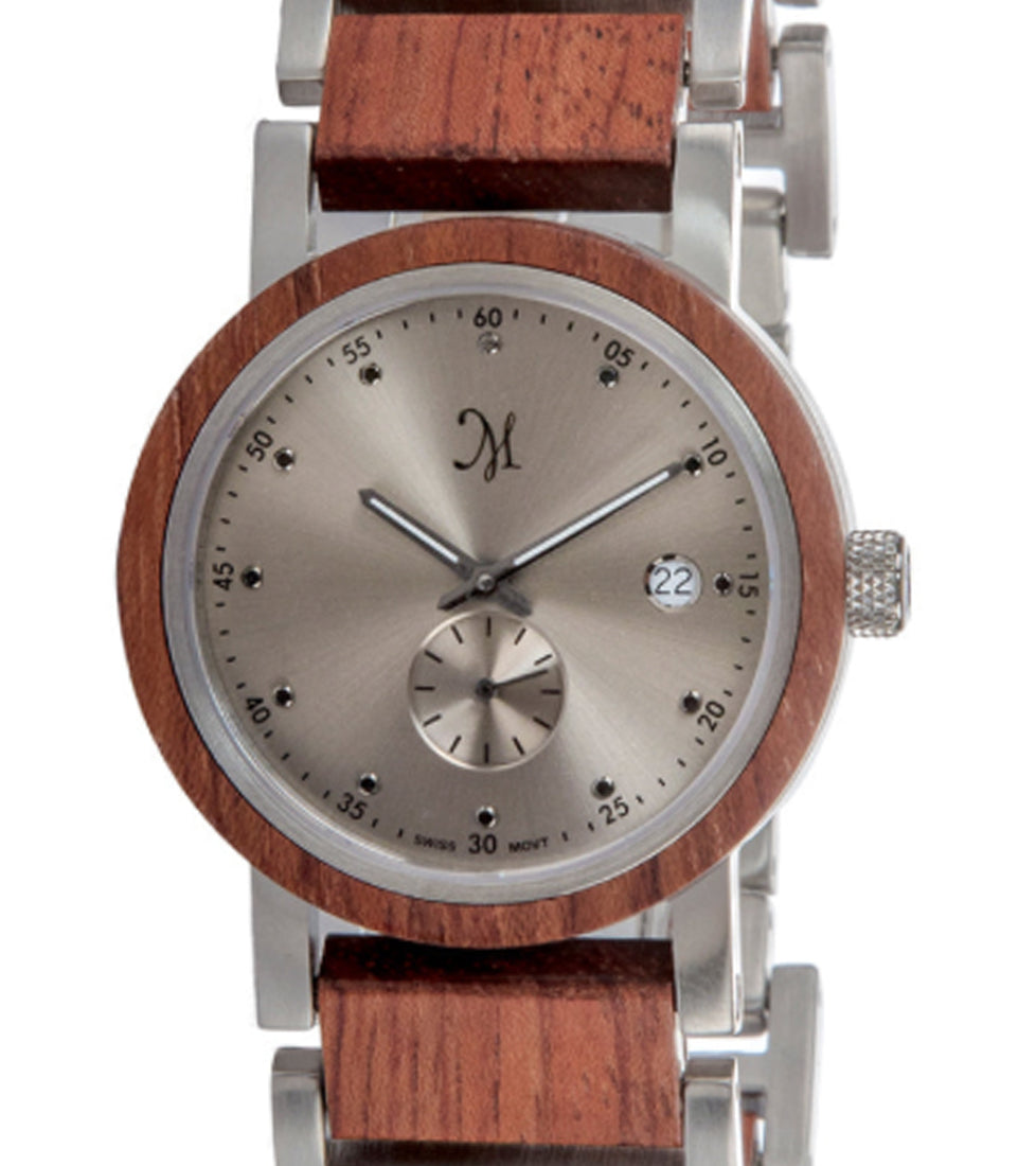 この時計は、サファイアクリスタルと耐腐食性ステンレススチールで保護された最高級スイス製ムーブメントを搭載しています。電池は最大2年間持続し、簡単に交換できます。当社の木製時計は防滴仕様のため、水に浸さないでください。ブリティッシュコロンビア州のパートナーであるフランシス・ラウ社が、当社の設計仕様に厳密に従って、独自の木製時計を組み立てています。