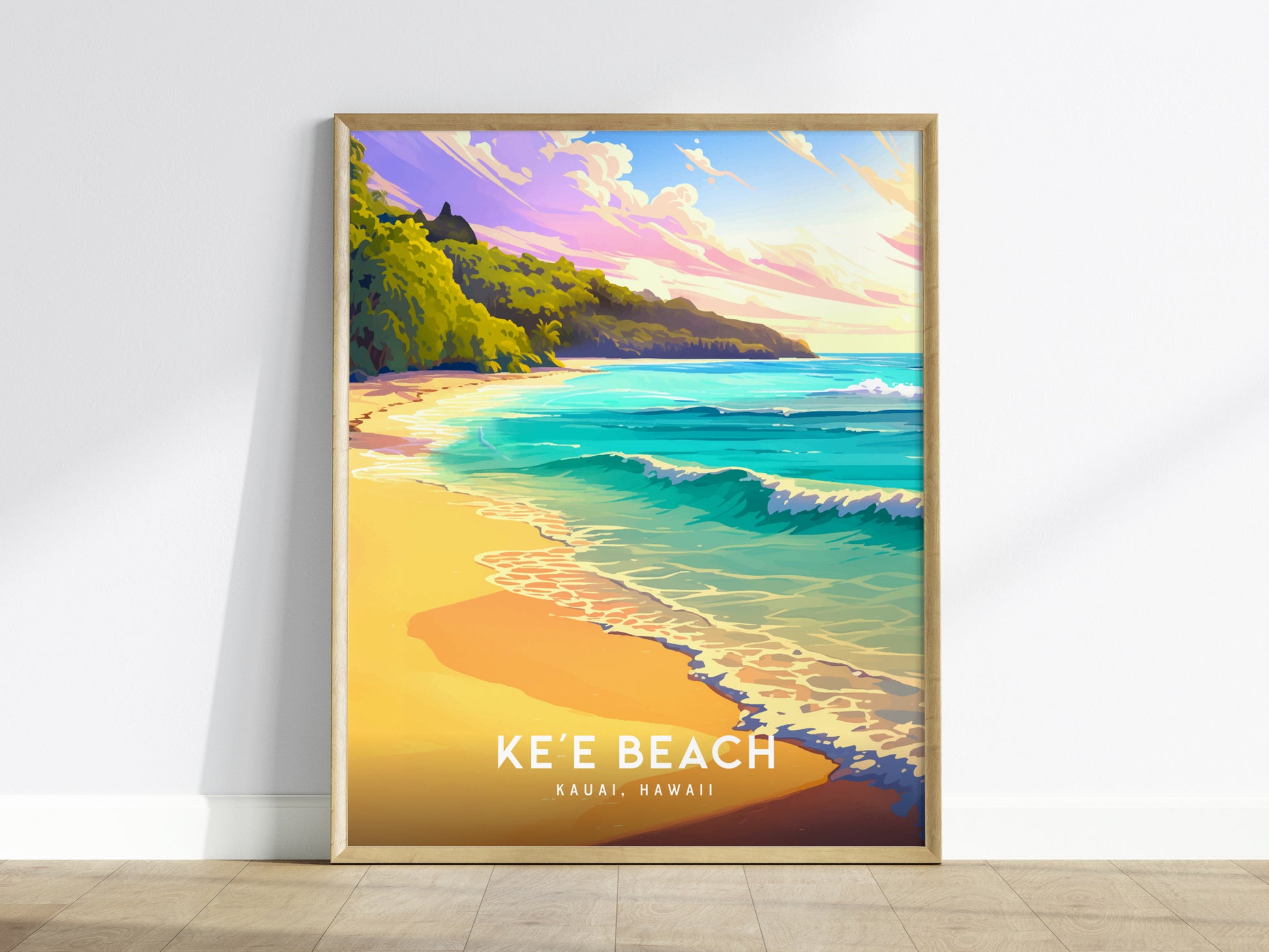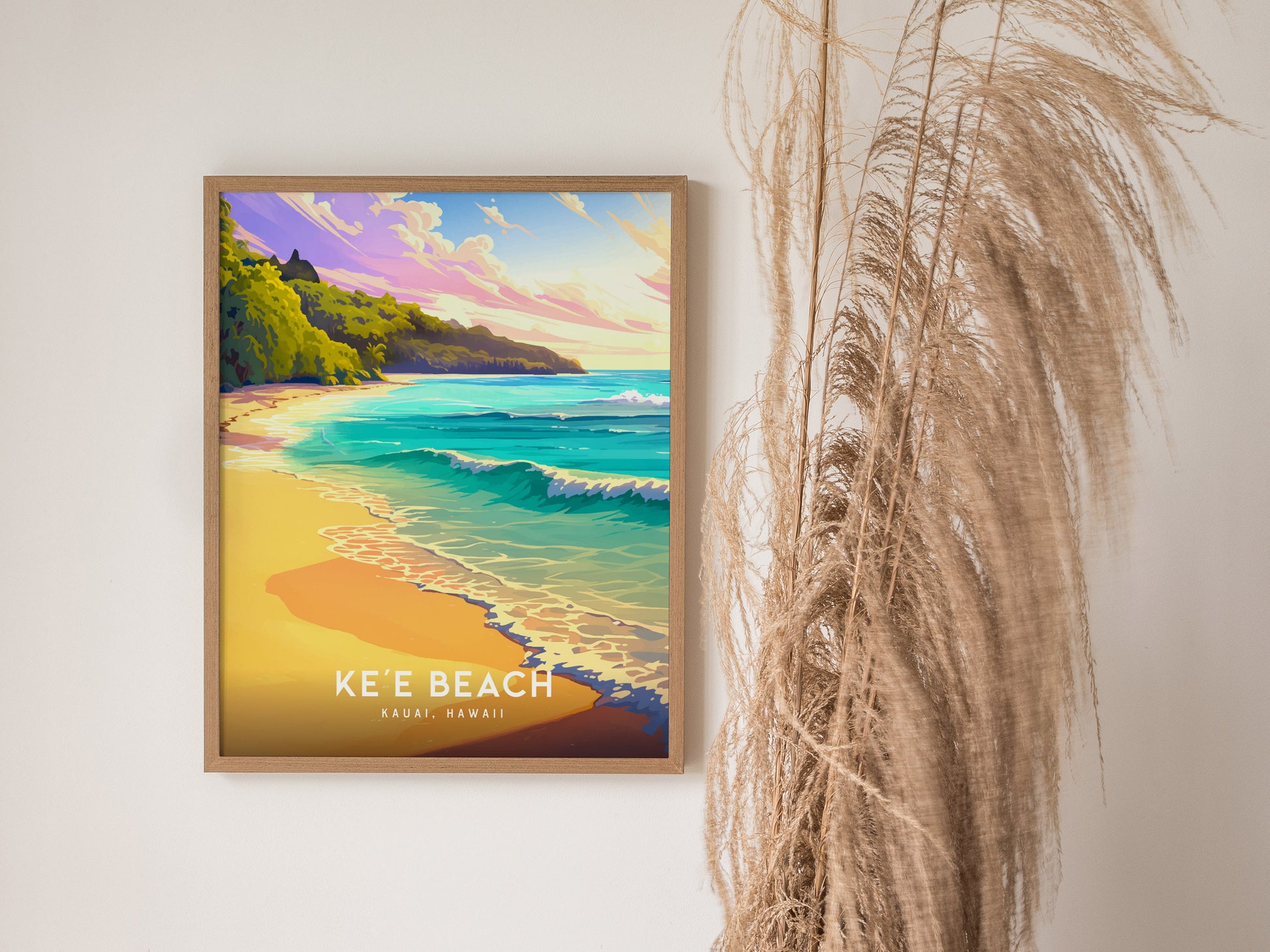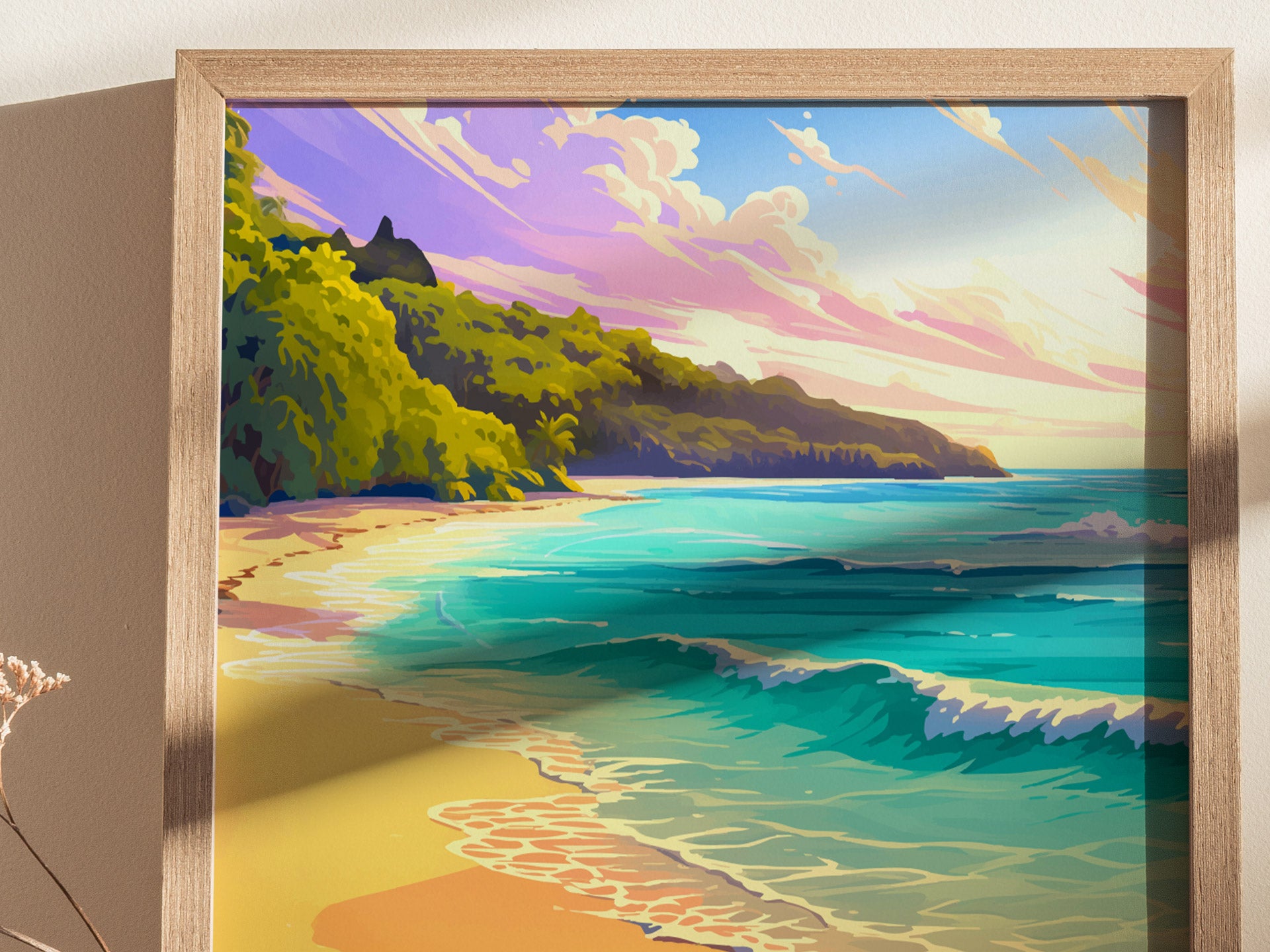 カウアイ島ノースショアの静寂を、ケエビーチを描いた鮮やかなアートプリントで体感してください。ハエナ州立公園の道端にひっそりと佇むケエビーチは、緑豊かなジャングルと穏やかなターコイズブルーの海に囲まれた静かな入り江です。イラストは、ビーチの緩やかな曲線、黄金色の砂浜、そして夕暮れ時の色鮮やかな空の輝きを捉えており、この愛すべき場所の静寂と美しさを想起させる魅力的な情景となっています。