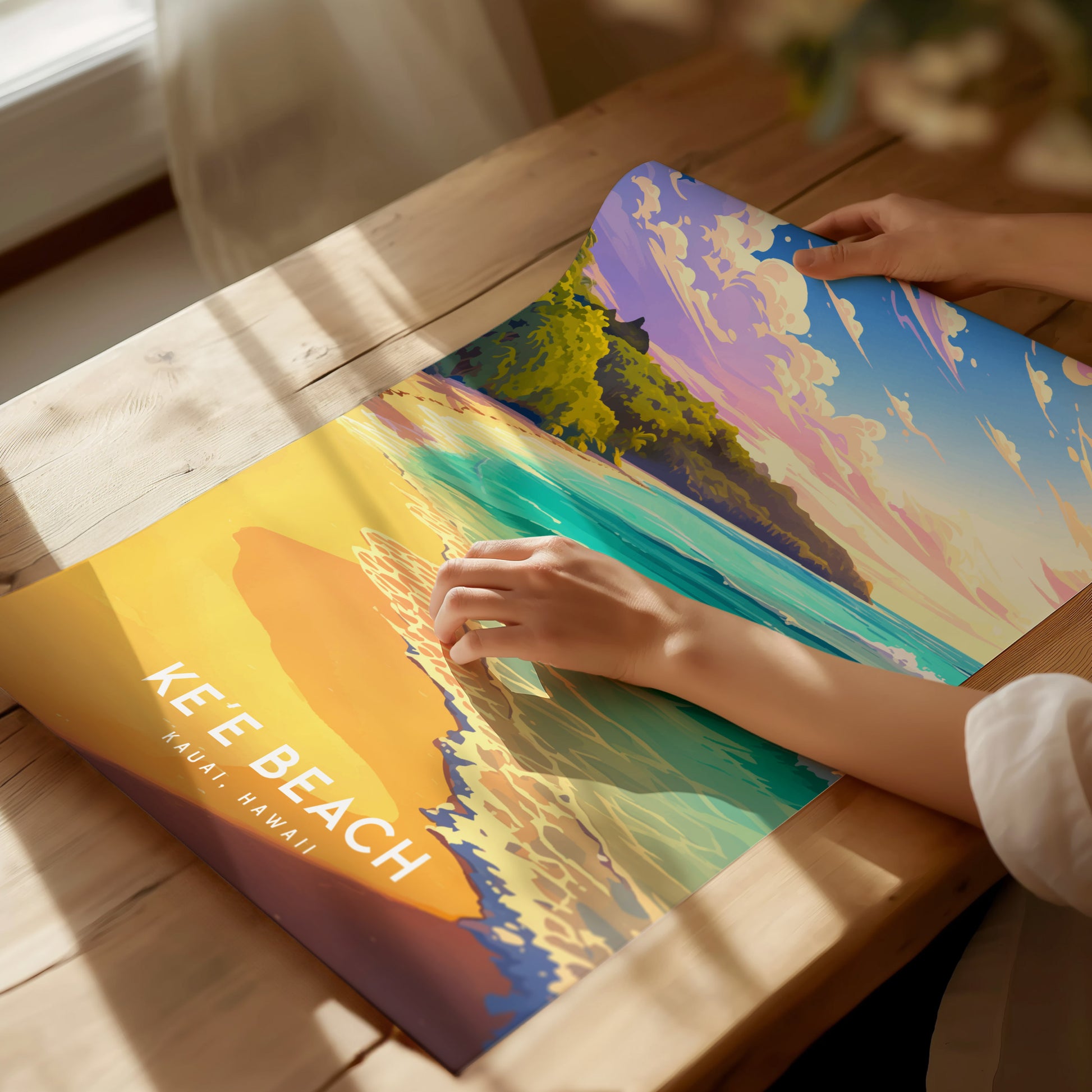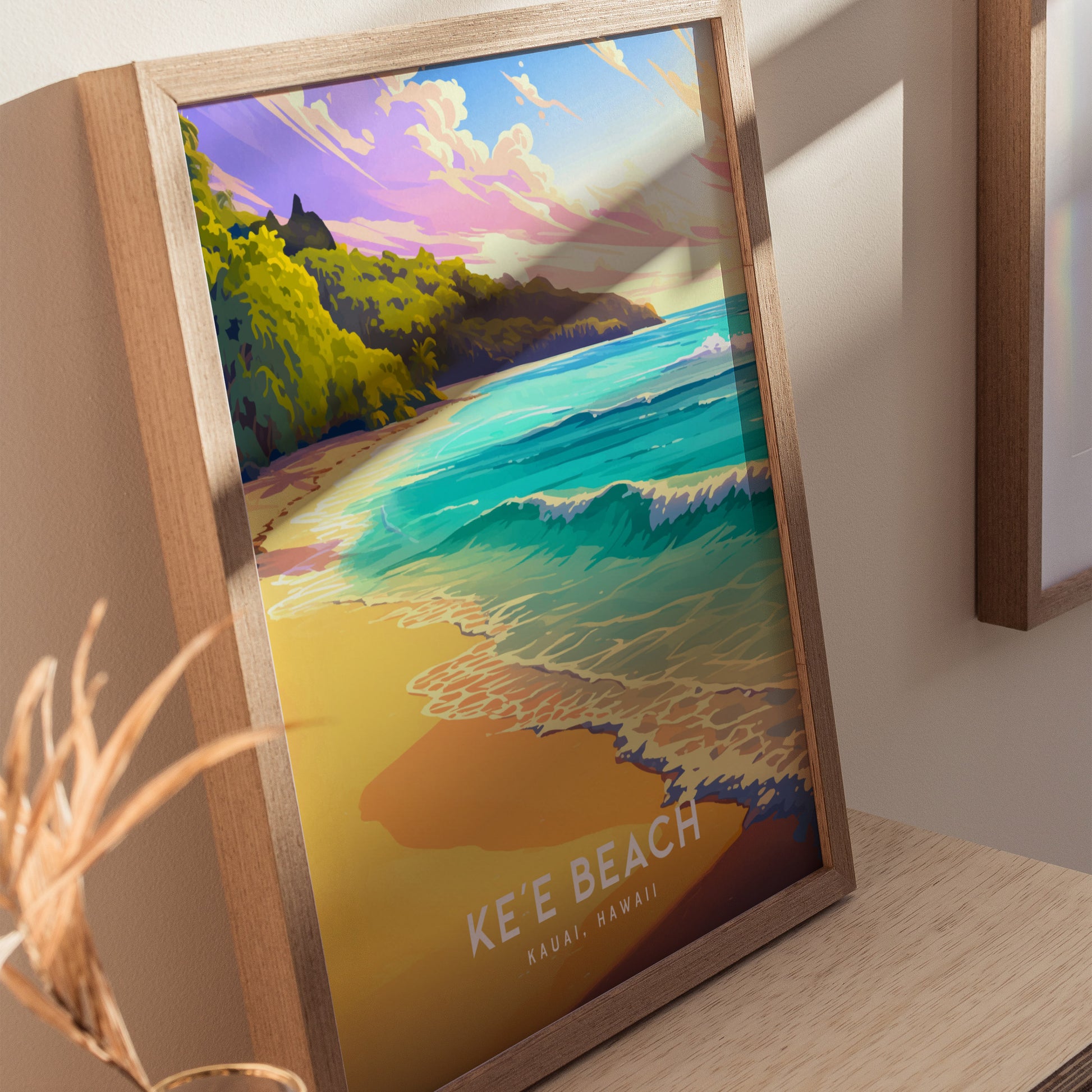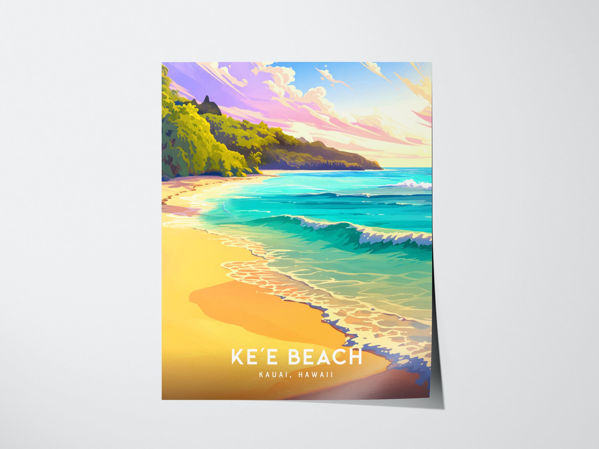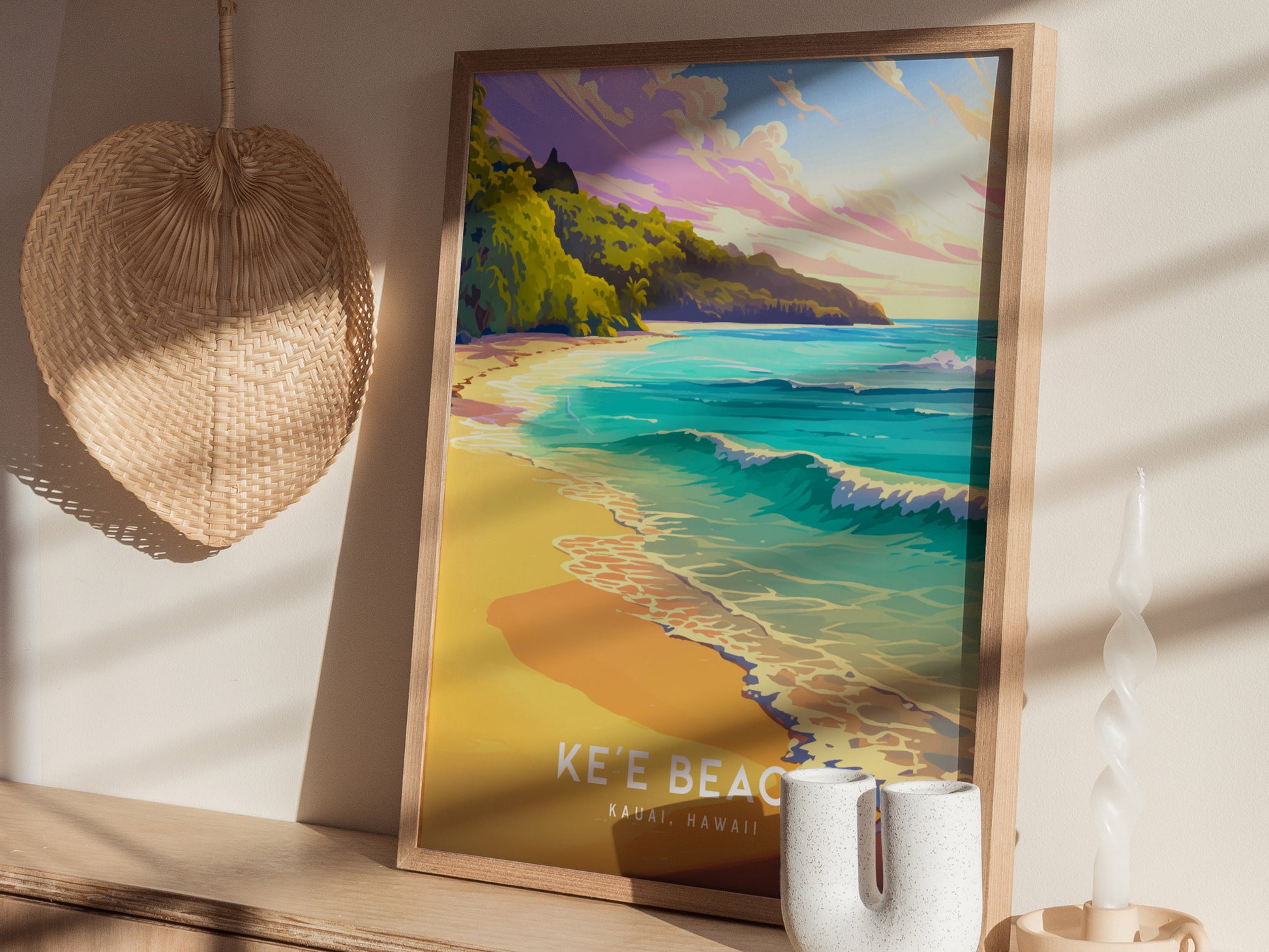 カウアイ島ノースショアの静寂を、ケエビーチを描いた鮮やかなアートプリントで体感してください。ハエナ州立公園の道端にひっそりと佇むケエビーチは、緑豊かなジャングルと穏やかなターコイズブルーの海に囲まれた静かな入り江です。イラストは、ビーチの緩やかな曲線、黄金色の砂浜、そして夕暮れ時の色鮮やかな空の輝きを捉えており、この愛すべき場所の静寂と美しさを想起させる魅力的な情景となっています。